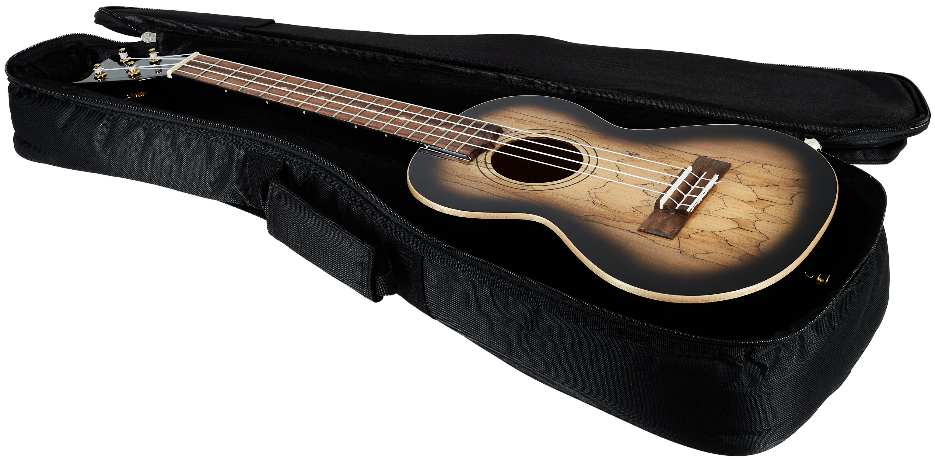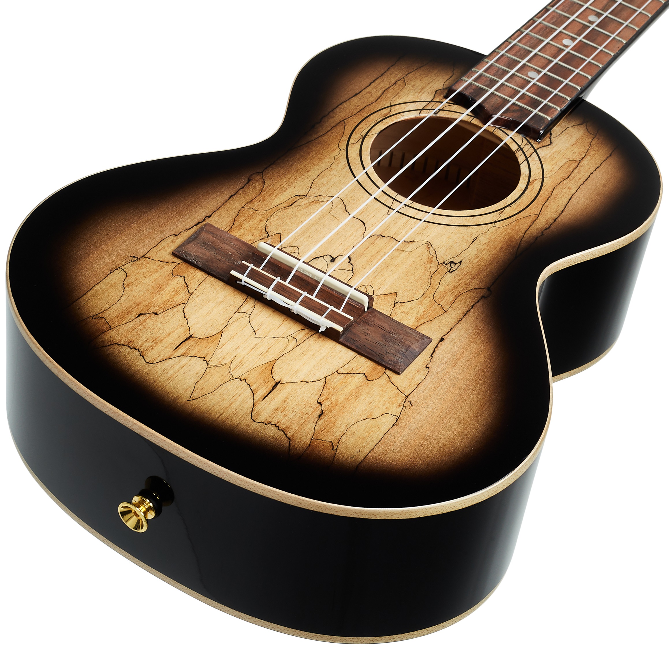Akustické ukulele Akustické tenorové ukulele Lanikai LKUSMBB-TX má prednú dosku zo spáleného javora, ktorého výraznú kresbu dreva zvýrazňuje lesklý lak a povrchová úprava sunburst. Zadná doska a luby sú vyrobené z preglejky. K okoumé krku je prilepený sedemnásťpražcový figový hmatník. Stabilitu ladenia zaručuje uchytenie strún nad nultým pražcom z materiálu NuBone XB v otvorených mechanikách Grover v zlatom prevedení. Strohý, ale štýlový dizajn podčiarkuje krémová obvodová väzba a rozeta pozostávajúca z dvo