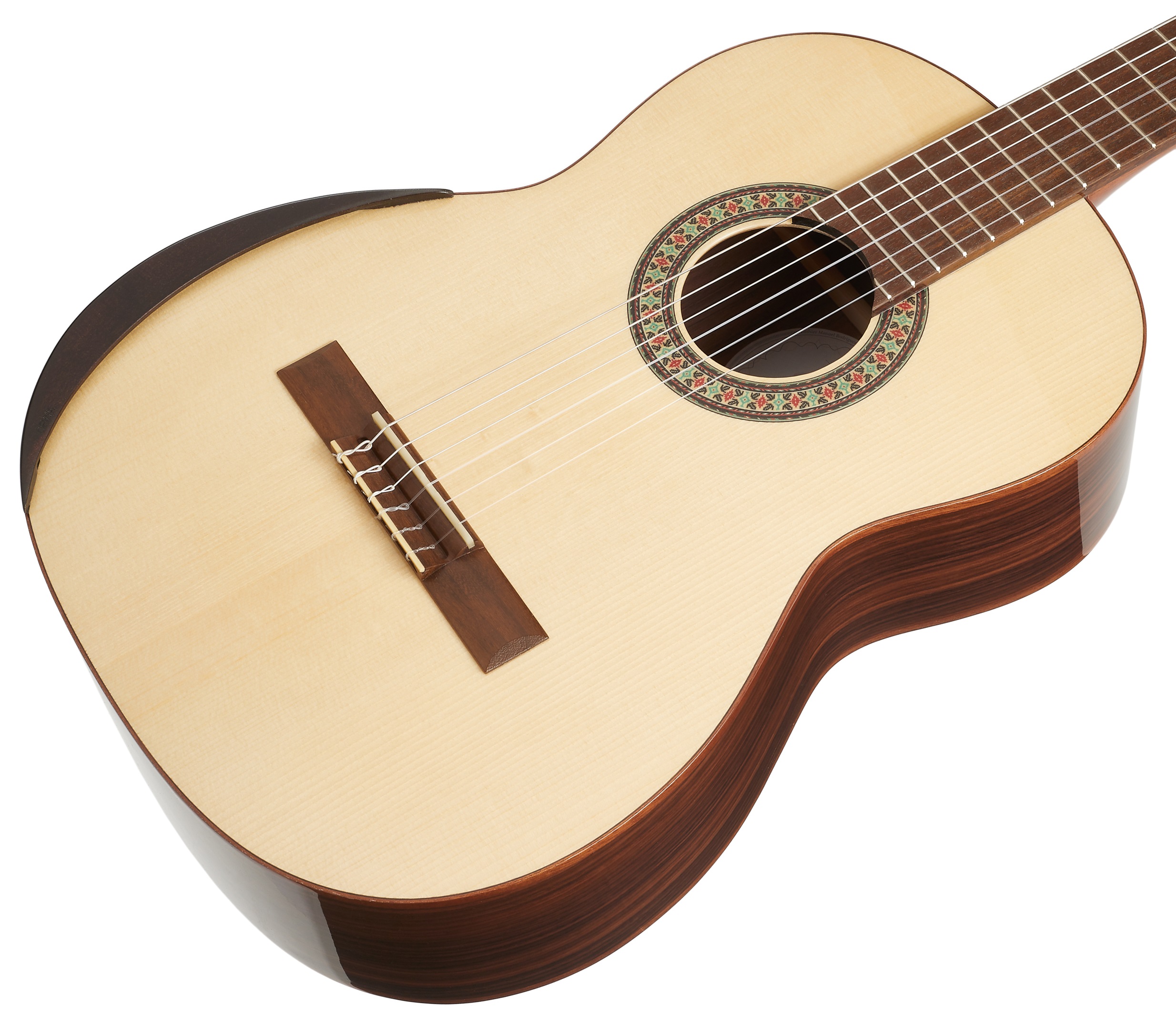 Klasická gitara Klasické gitary španielskej značky Manuel Rodriguez zo série ACADEMIA ponúkajú vysokú kvalitu spracovania a spojenie krku a tela „Spanish Heel“. Ide o komplikovanejšiu konštrukciu, ktorá však patrí medzi najlepšie z hľadiska zvuku a stability krku. AC60 4/4 size zo série ACADEMIA je klasická gitara plnej veľkosti 4/4. Predná doska je vyrobená z masívneho smrekového dreva, zadná doska a luby sú z laminovaného materiálu v palisandrovom prevedení. Gitara ďalej disponuje mahagónovým krkom, ovang
