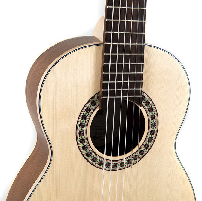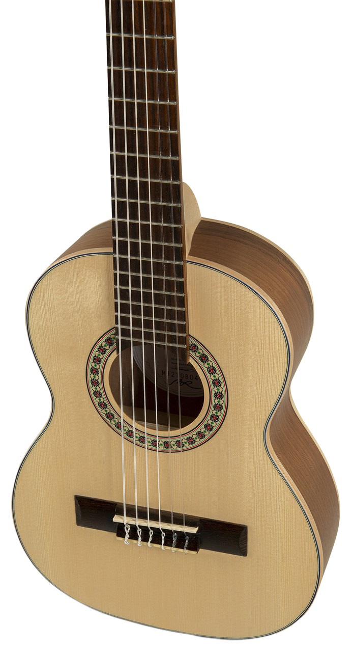 Detská klasická gitara Klasické gitary španielskej značky Manuel Rodriguez zo série ECOLOGÍA sa vracajú k tradícii používania lokálne dostupných materiálov. Na povrchovú úpravu laku sa používajú len laky na báze vody. ECOLOGÍA Series E-44 1/4 size je detská klasická gitara vo veľkosti 1/4. Predná doska nástroja je vyrobená z masívneho smrekového dreva, zadná doska a luby sú z laminovaného orechového dreva. Gitara je ďalej vybavená javorovým krkom, akáciovým hmatníkom a kobylkou, nultým pražcom a hmatníkovou