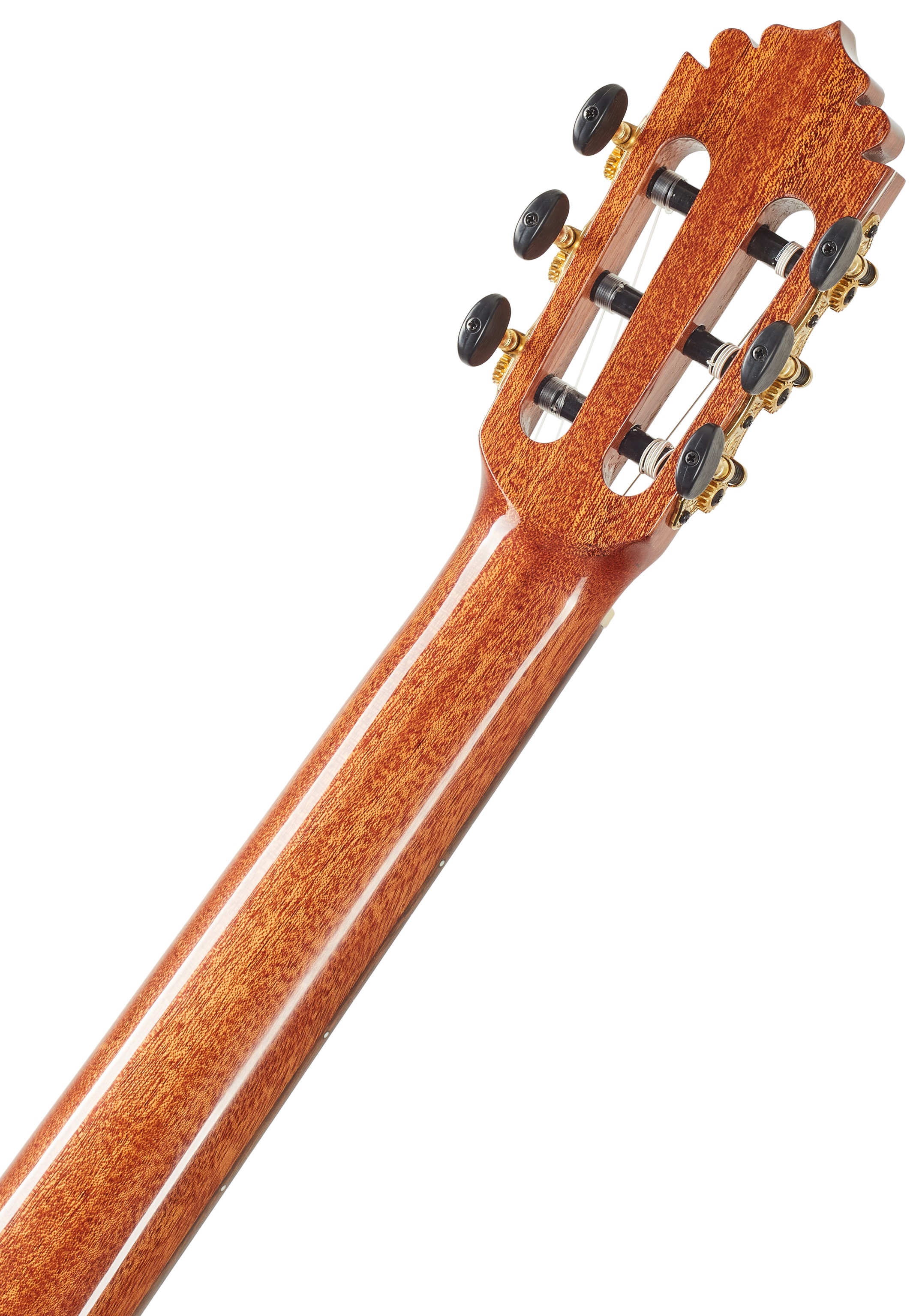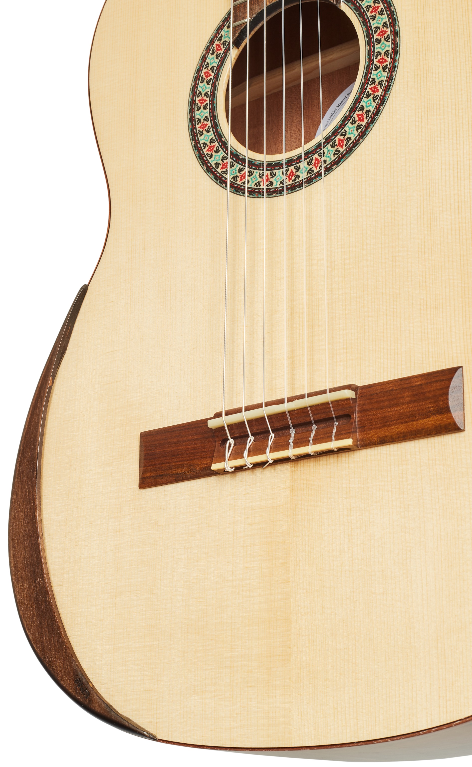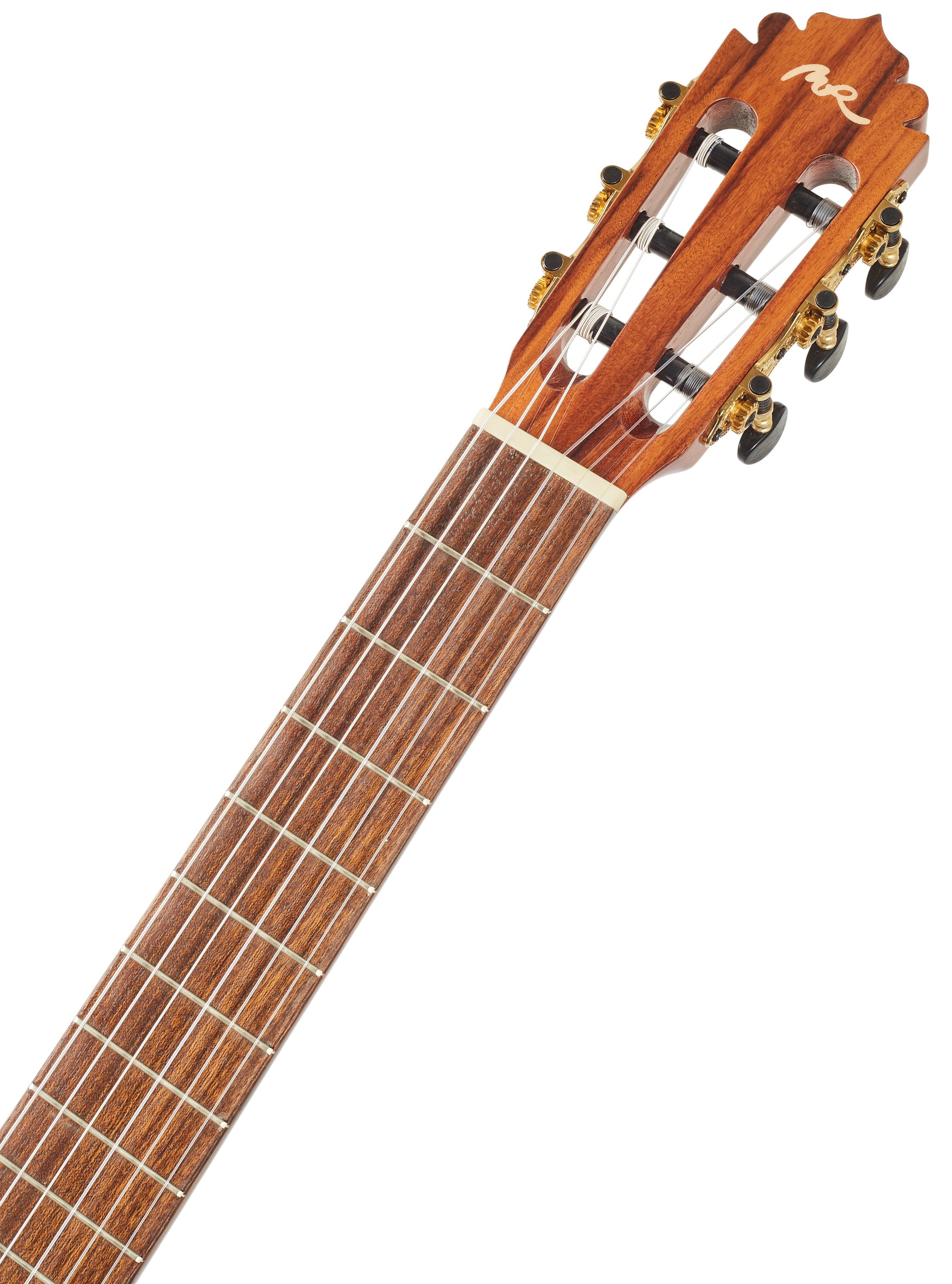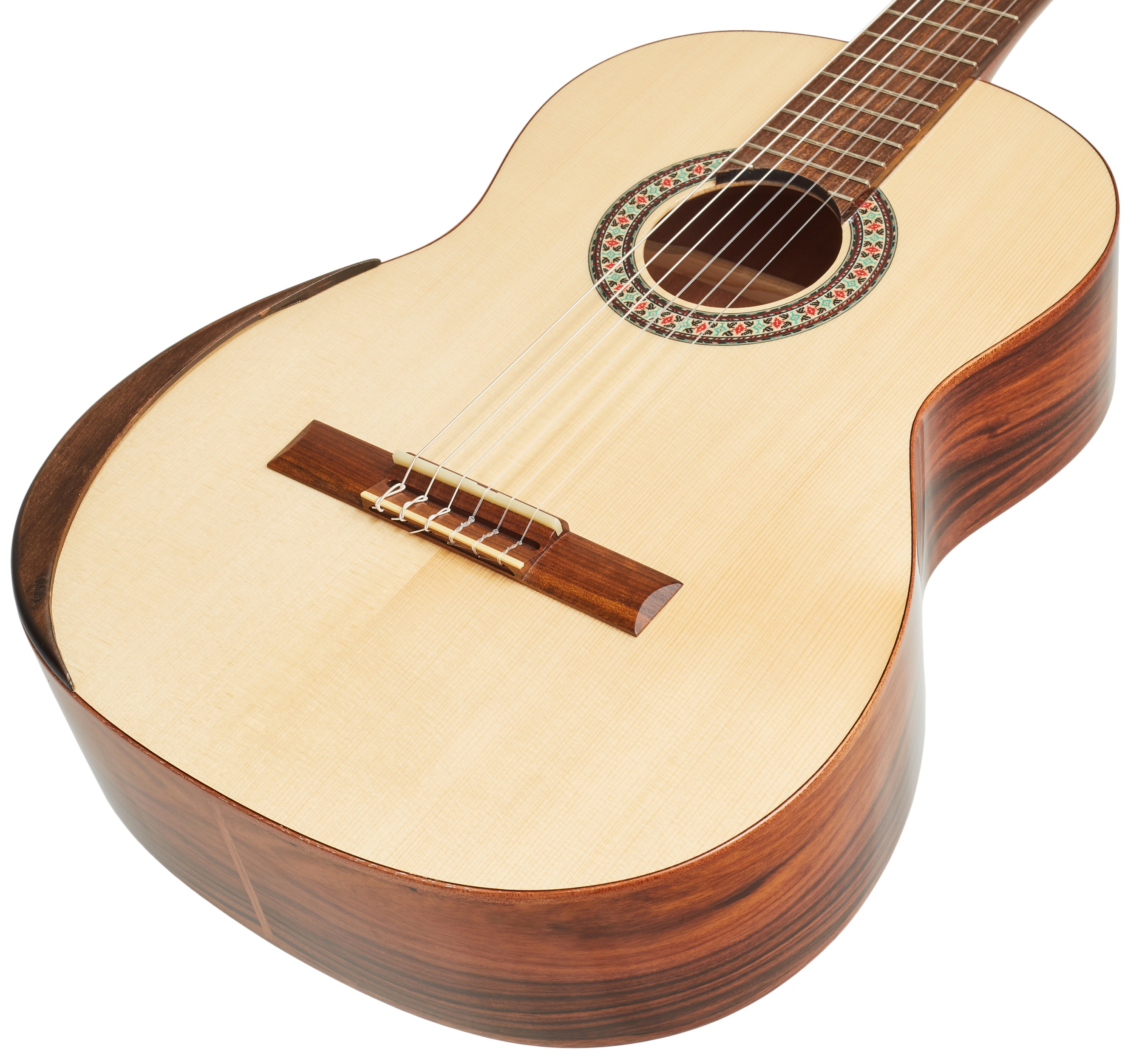 Klasická gitara MANUEL RODRIGUEZ Exótica Series EX-SC Gloss 4/4 je klasická gitara s polomasívnou konštrukciou tela. Predná doska gitary je vyrobená z masívneho červeného cédra, zatiaľ čo zadná doska a luby sú vyrobené z prekrytého pau ferro. Vrchnú dosku gitary zdobí mahagónové lemovanie a drevená rozeta. K mahagónovému krku je prilepený ovangkolový hmatník. Stabilné ladenie zaručuje uchytenie strún cez nultý a kompenzovaný sedlový pražec v pozlátených bezlaliatkových mechanikách s čiernymi kolíkmi a ovang