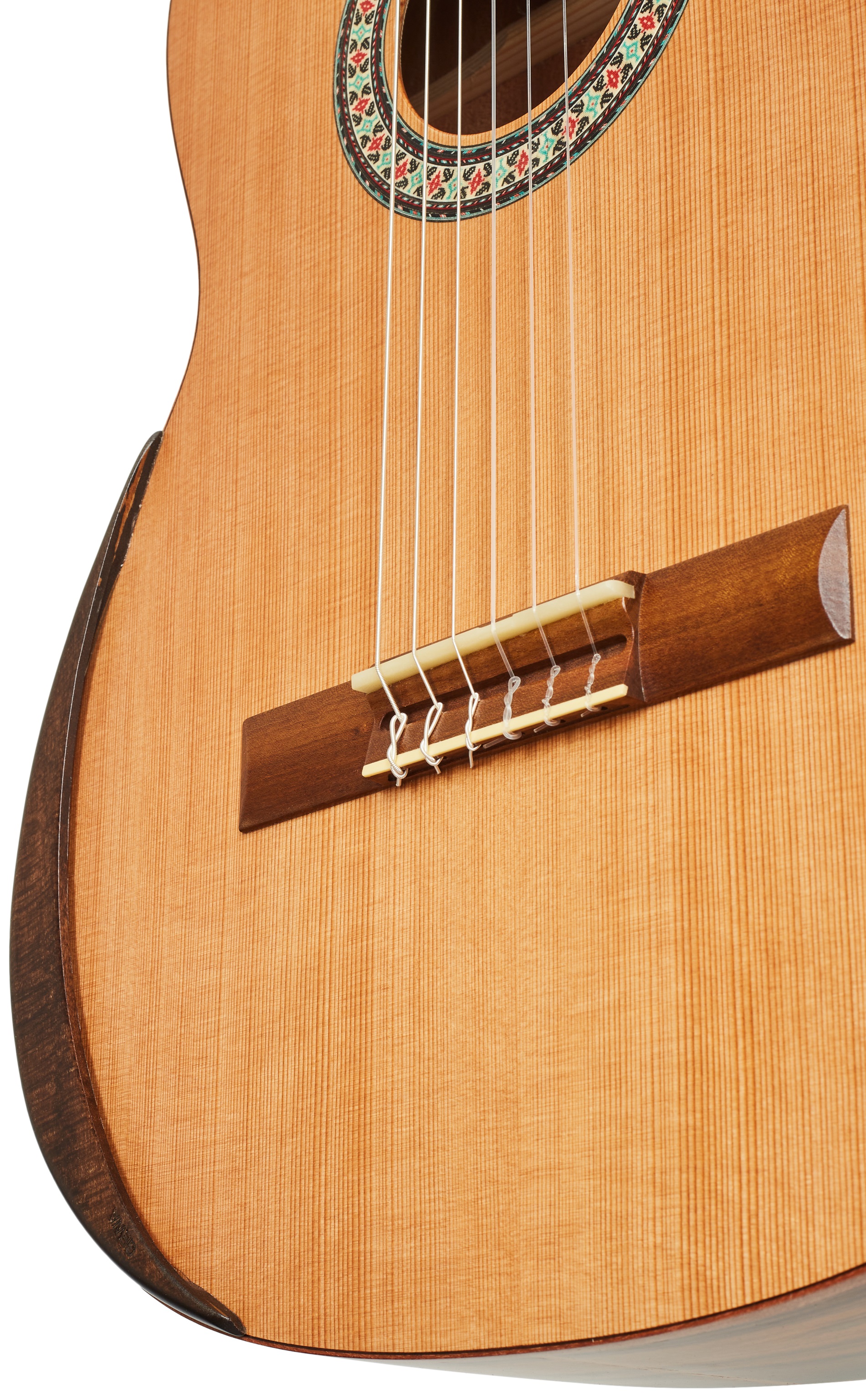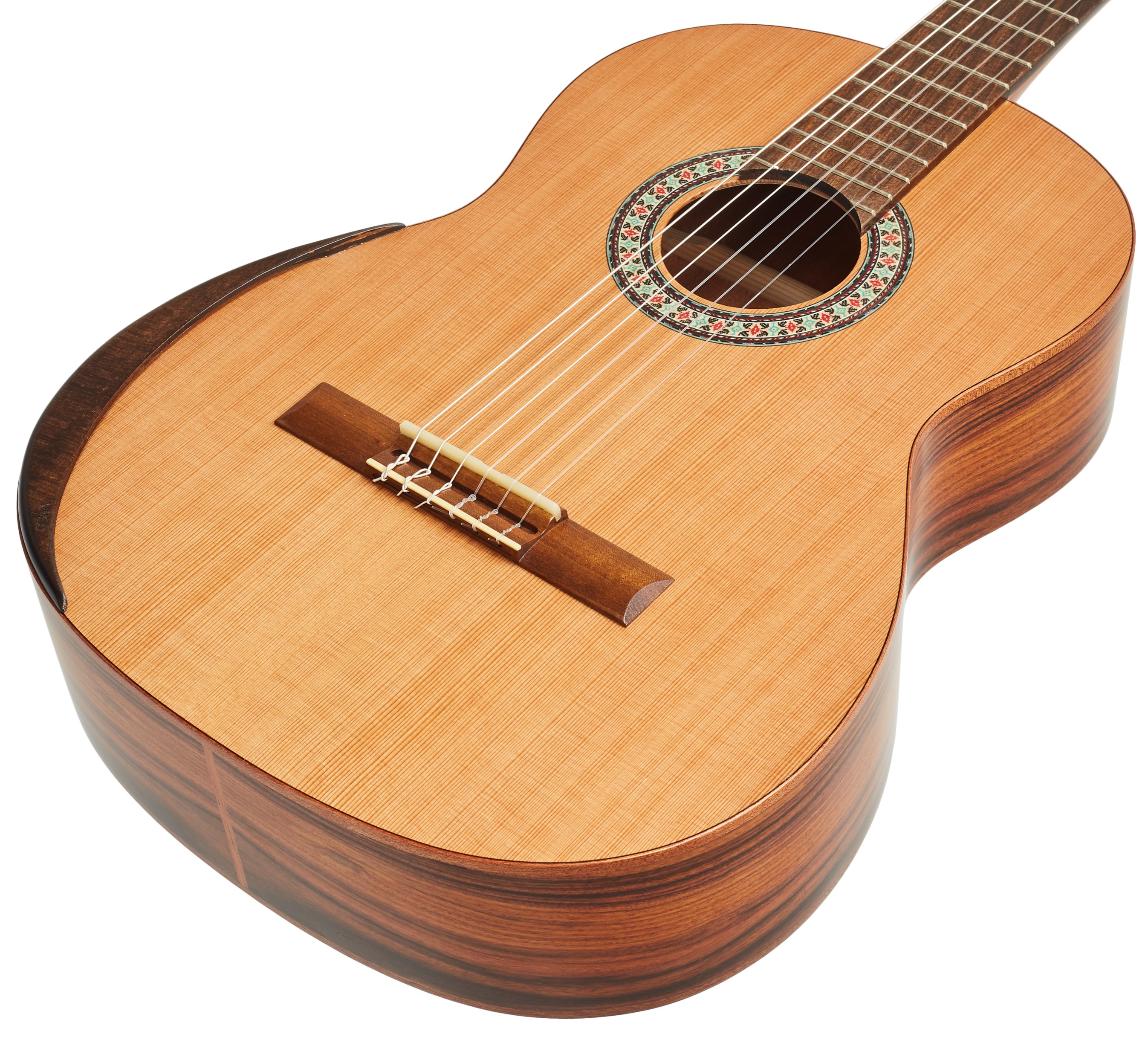 Klasická gitara MANUEL RODRIGUEZ Exótica Series EX-SC Satin 4/4 je klasická gitara s polomasívnou konštrukciou tela. Predná doska gitary je vyrobená z masívneho červeného cédra, zatiaľ čo zadná doska a luby sú vyrobené z prekrytého pau ferro. Vrchnú dosku gitary zdobí mahagónové lemovanie a drevená rozeta. K mahagónovému krku je prilepený ovangkolový hmatník. Stabilné ladenie zaručuje uchytenie strún cez nultý a kompenzovaný sedlový pražec v pozlátených bezlaliatkových mechanikách s čiernymi kolíkmi a ovang