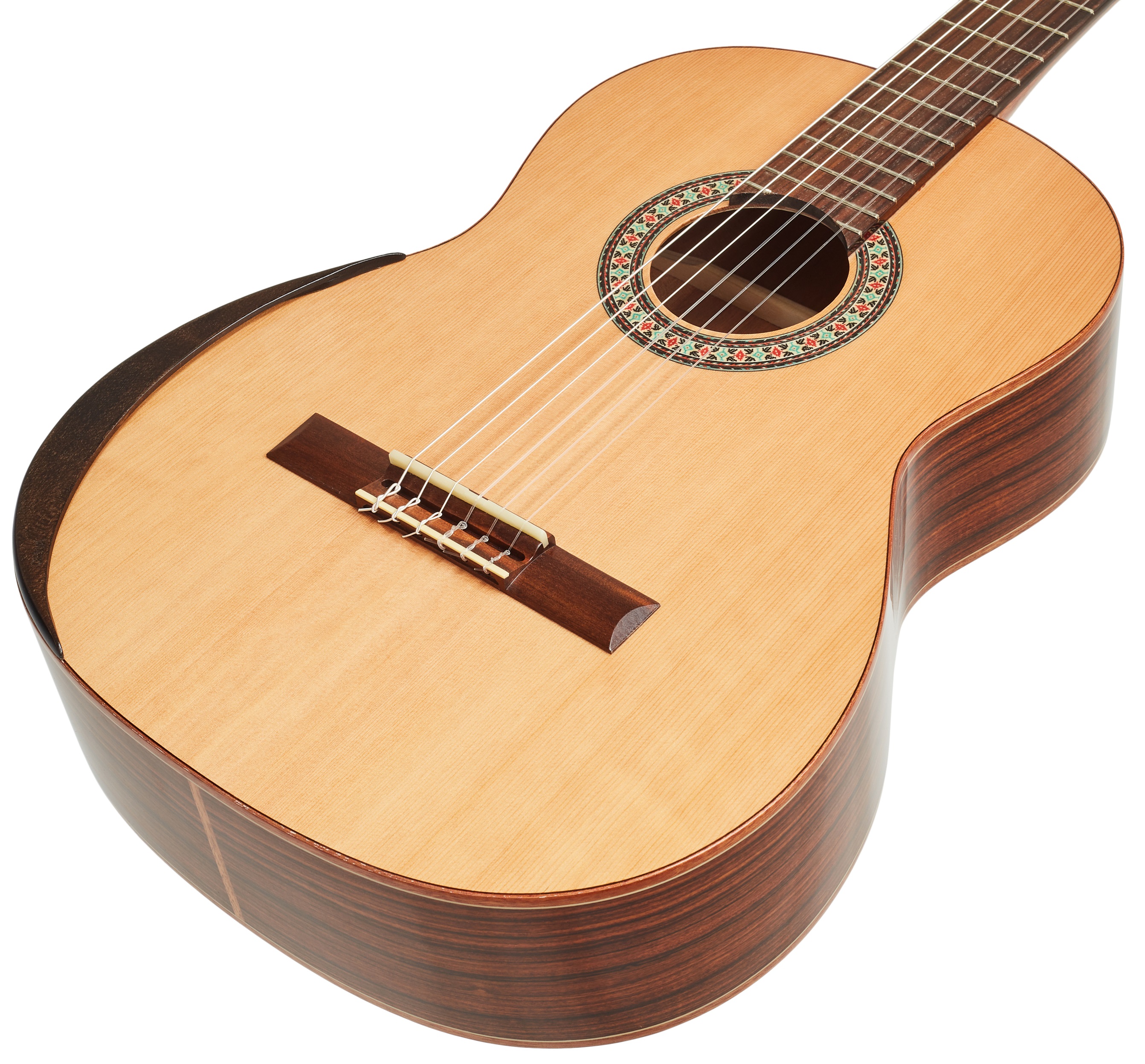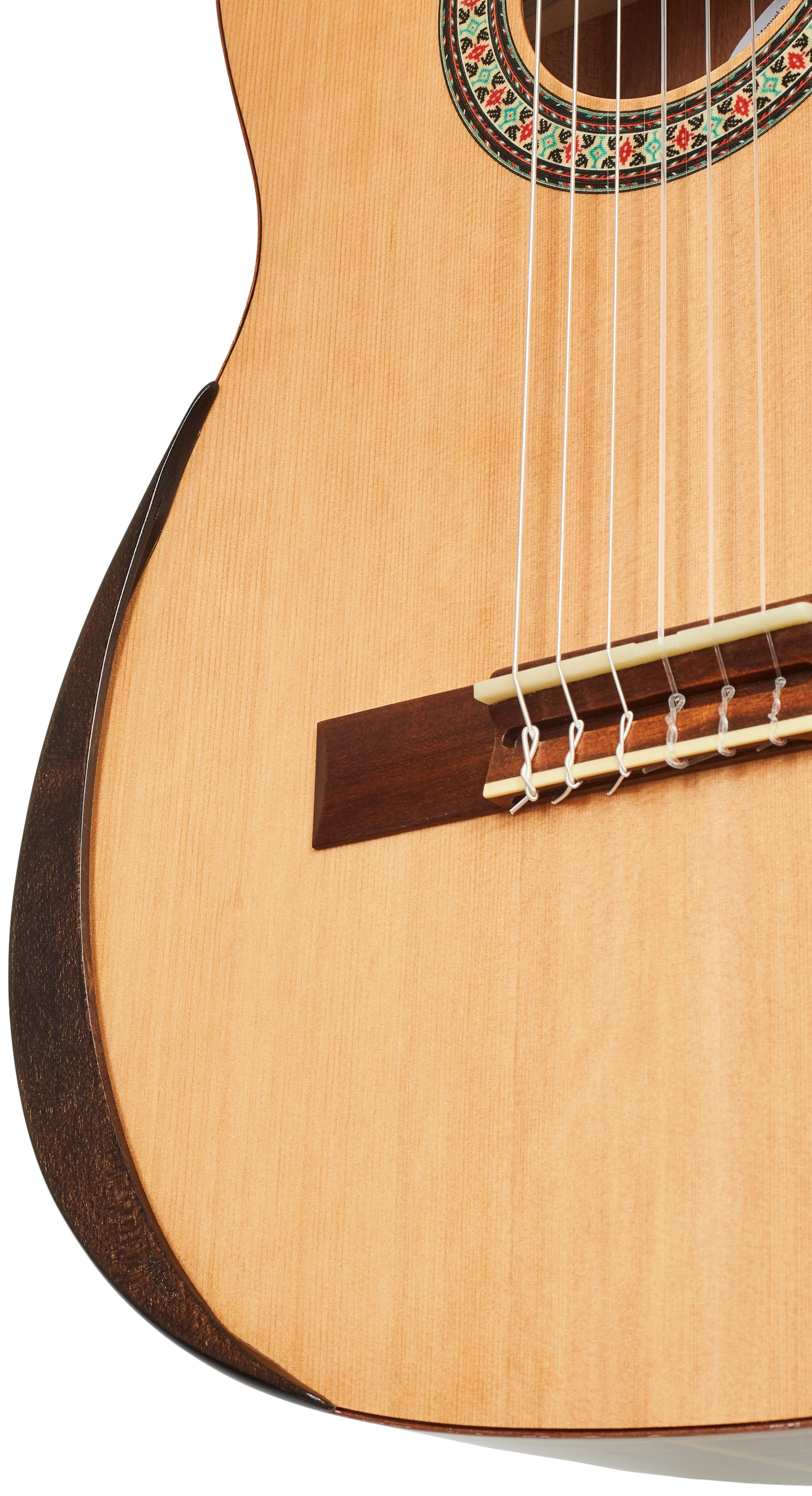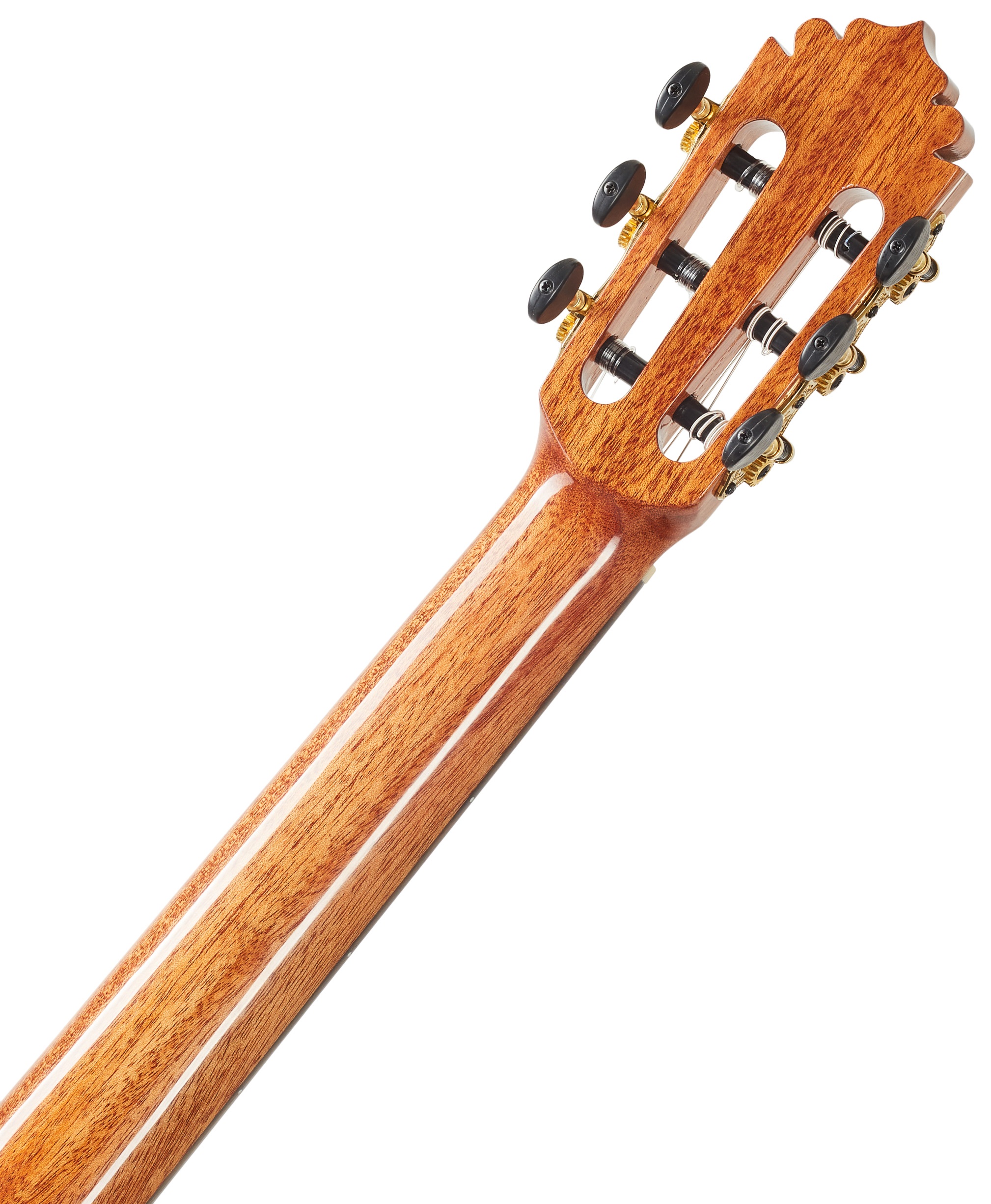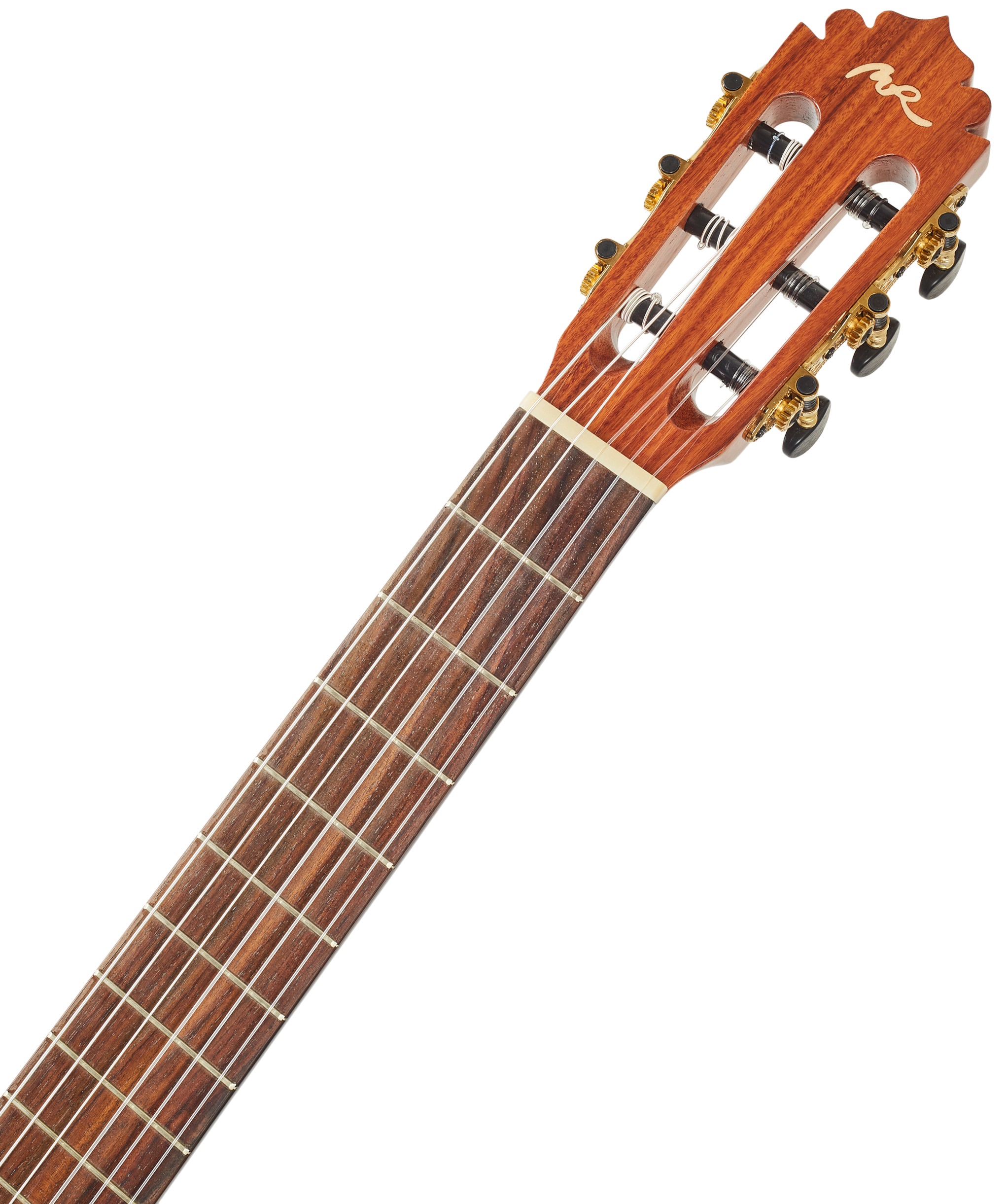 Klasická gitara MANUEL RODRIGUEZ Exótica Series EX-SS Gloss 4/4 je klasická gitara s polomasívnou konštrukciou tela. Predná doska gitary je vyrobená z masívneho smrekového dreva, zatiaľ čo zadná doska a luby sú vyrobené z prekrytého dreva pau ferro. Vrchnú dosku gitary zdobí mahagónové lemovanie a drevená rozeta. K mahagónovému krku je prilepený ovangkolový hmatník. Stabilné ladenie zaručuje uchytenie strún cez nultý a kompenzovaný sedlový pražec v pozlátených bezlaliatkových mechanikách s čiernymi kolíkmi
