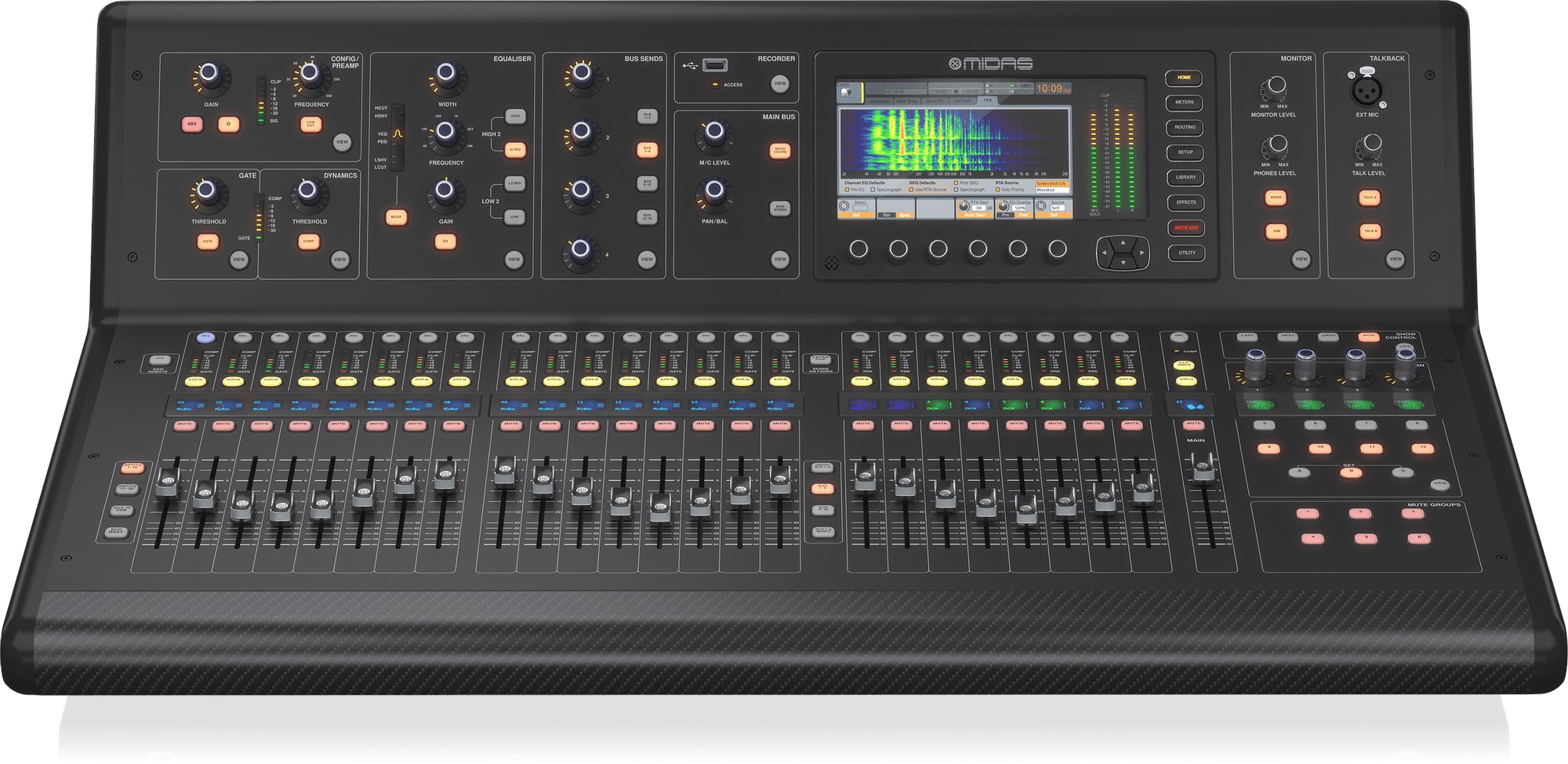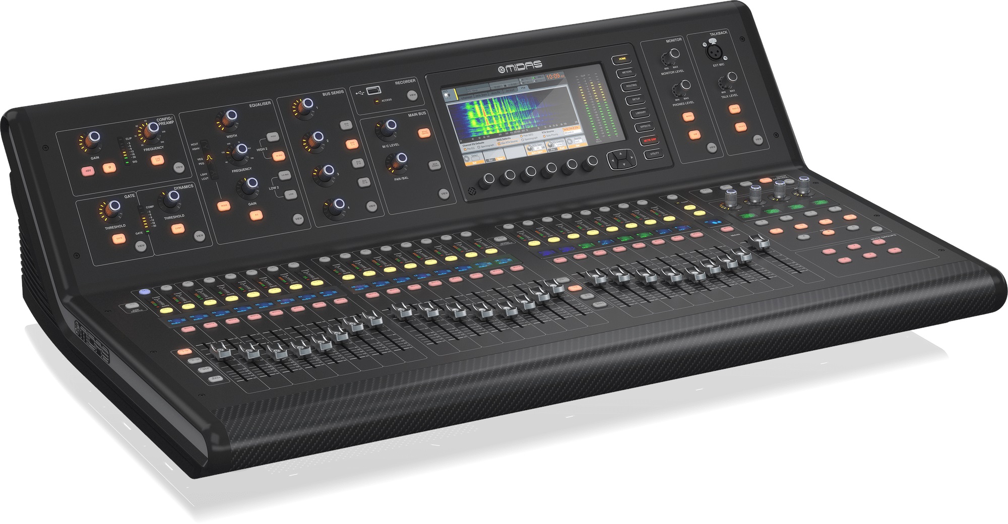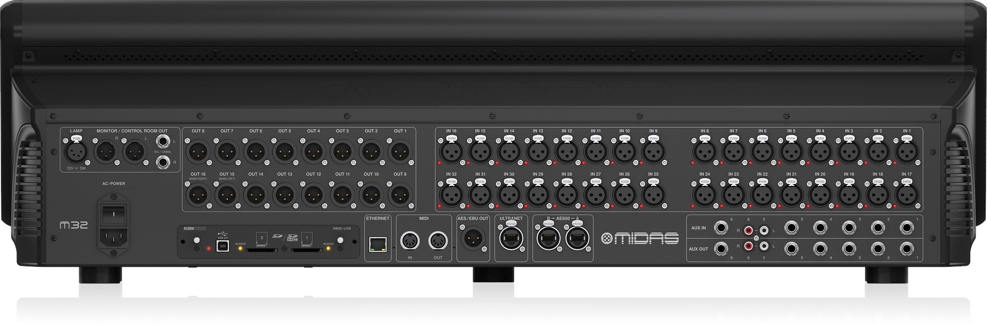 Digitálny mixážny pult Midas M32 Live je digitálny mixážny pult pre živé a štúdiové aplikácie so 40 simultánnymi vstupnými kanálmi, 32 mikrofónovými predzosilňovačmi PRO, 25 zbernicami, 32 obojsmernými nahrávacími/prehrávacími kanálmi SD/SDHC (karty nie sú súčasťou balenia), až tromi hodinami 32-kanálového záznamu PCM v jednej relácii (uloženého ako WAV), 8 skupinami DCA a 6 skupinami stlmenia, ôsmimi digitálnymi efektmi, 25 fadermi Midas PRO, 32 x 32 kanálmi USB 2.0 audio rozhranie, 7-palcový farebný TFT d