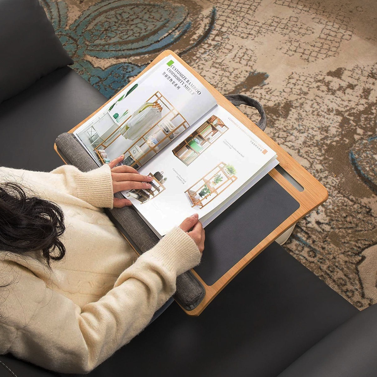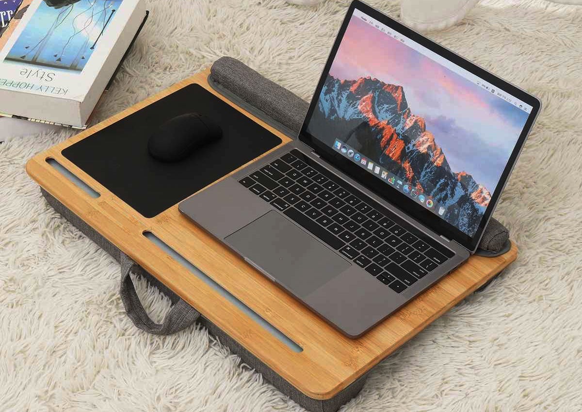Stojan na notebook Univerzálna bambusová pracovná podložka vhodná pre módnych návrhárov, grafikov a ďalších kreatívcov, ktorí potrebujú maximálne pohodlie pri práci. Zadná strana má mäkké polstrovanie s protišmykovým povrchom a rovnaké polstrovanie nájdete aj v prednej časti pre lakte. Predná strana obsahuje aj dva výrezy na tablet alebo smartfón a protišmykovú podložku pod myš.