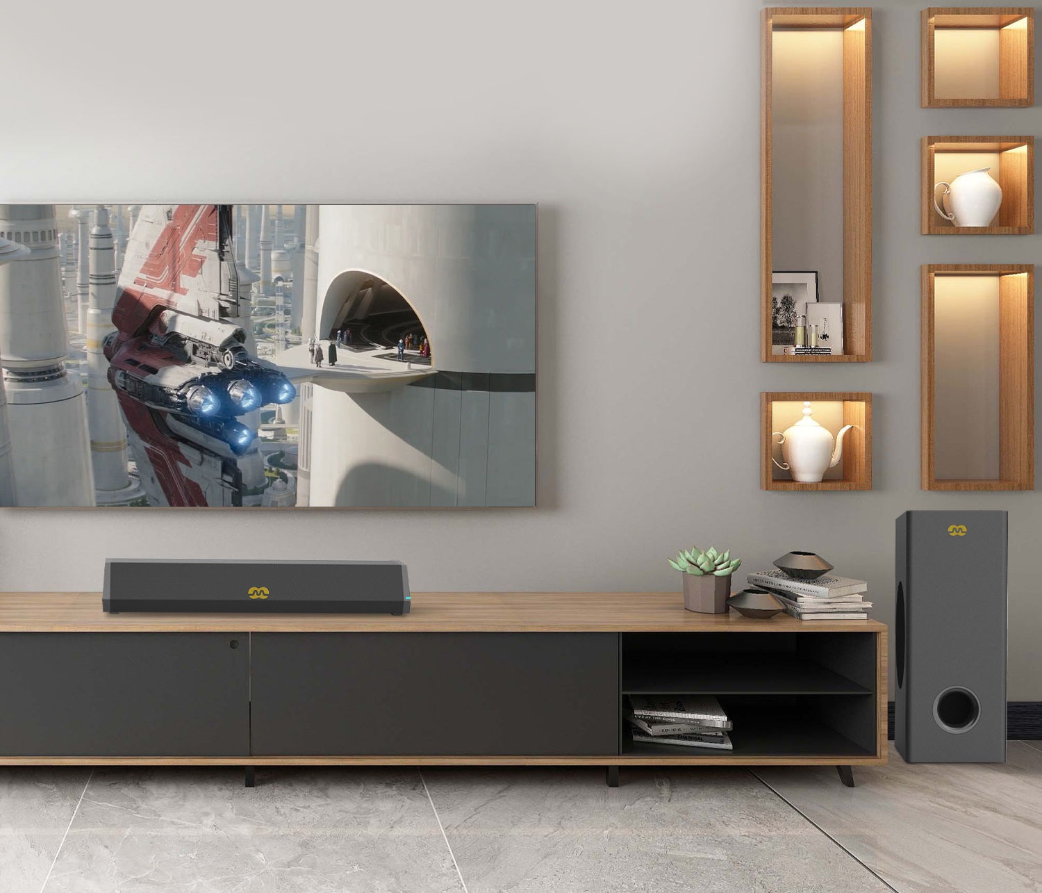 Domáce ozvučenie Mozos GS-BAR je skvelou alternatívou domáceho zvukového systému pre vašu televíznu alebo počítačovú zostavu. GS-BAR poskytuje vysokokvalitný zvuk v rámci svojho kompaktného dizajnu s mnohými možnosťami pripojenia. Je skvelou modernou alternatívou k bežným počítačovým reproduktorom a náhradou za slabé vstavané reproduktory televízora. Zostava sa skladá z centrálneho reproduktora a subwoofera. Vďaka mnohým zabudovaným portom vrátane HDMI-Arc, optického a anal