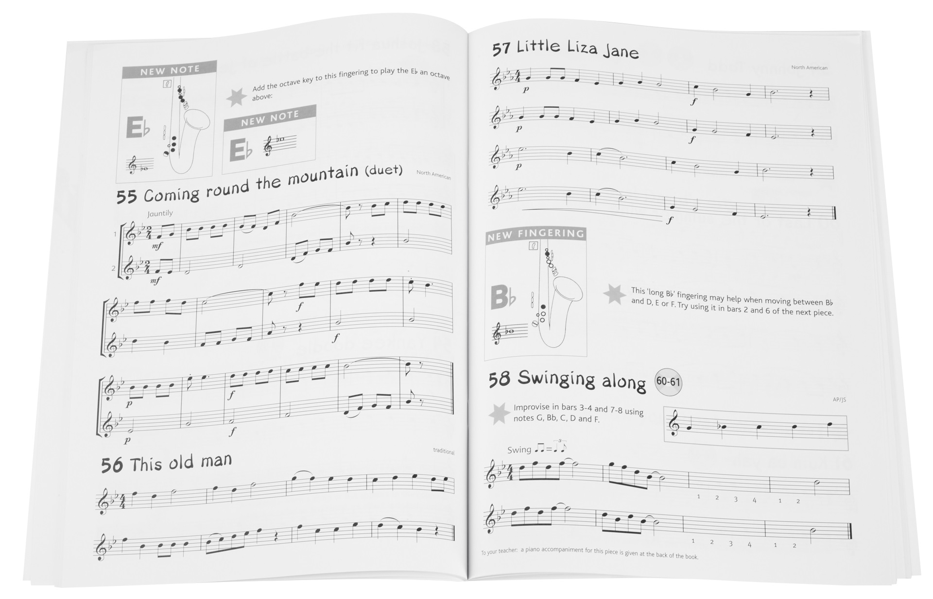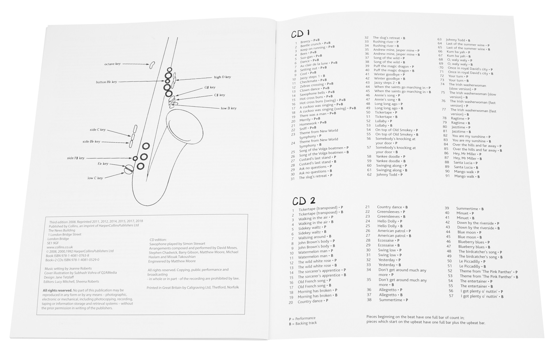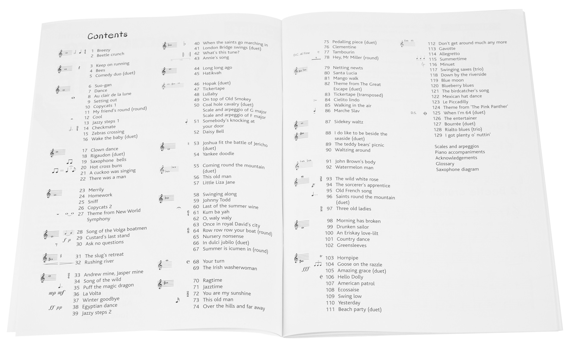 Noty pre altsaxofón Anglická publikácia – výučba hry na saxofón s piesňami a melódiami. Sprevádzané 2 CD s klavírnym a orchestrálnym sprievodom. Veľmi jednoduchý postup výučby založený na známych anglických melódiách. Pomalý prechod medzi jednotlivými fázami učenia. Základy hudobnej teórie. Jasne čitateľné prstoklady. Doplnené o duety.