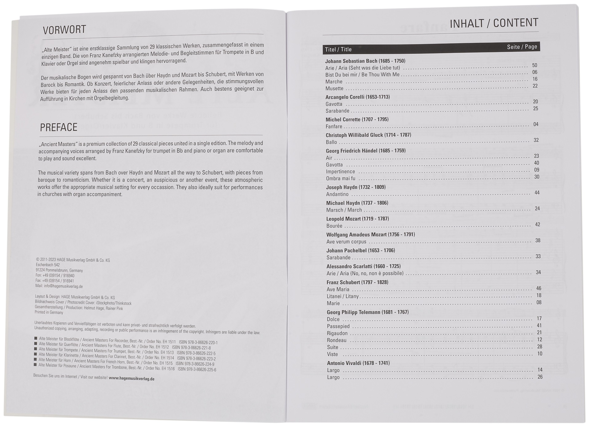 Noty pre trúbku Ancient Masters obsahuje 29 známych skladieb klasickej hudby (obdobie baroka, klasicizmu a raného romantizmu) od hudobných velikánov, ako sú Bach, Haydn, Vivaldi, Mozart, Schubert a ďalší, v úprave pre sólovú trúbku so sprievodom pre klavír/organ. Zoznam skladateľov a skladieb: – Johann Sebastian Bach (1685 – 1750): Arie / Ária (Seht was die Liebe tut), Bist Du bei mir / Buď so mnou, Marche, Musette – Arcangelo Corelli (1653-1713): Gavota, Sarabanda – Michel Corrette (1707-1795): Fanfára – G