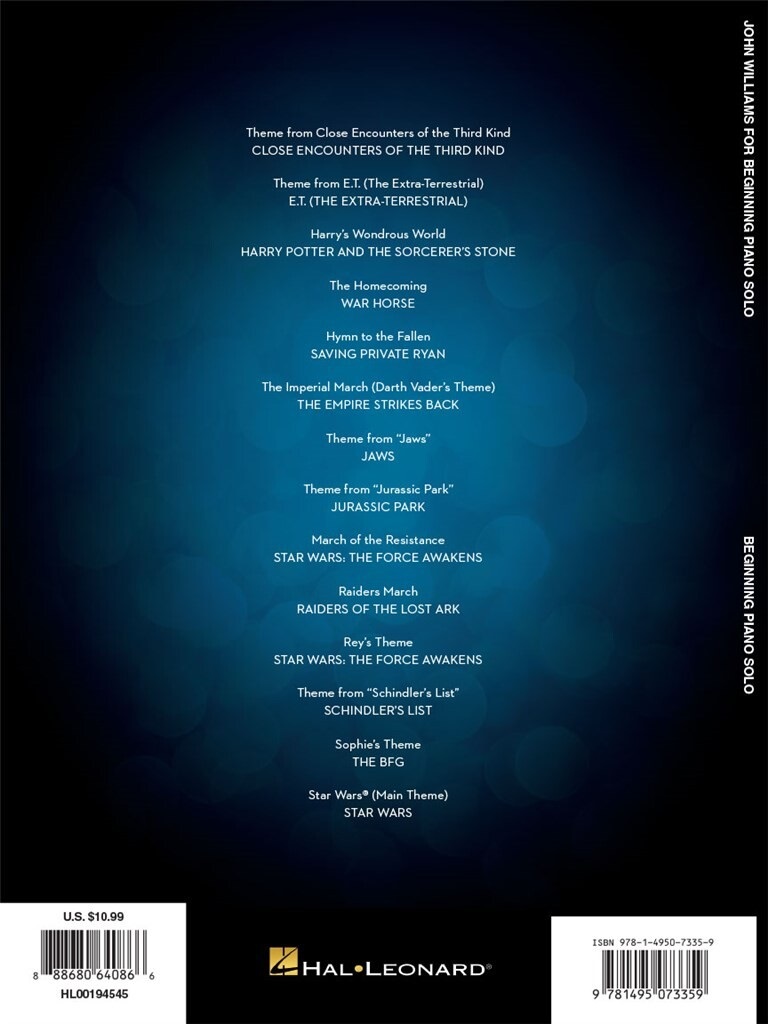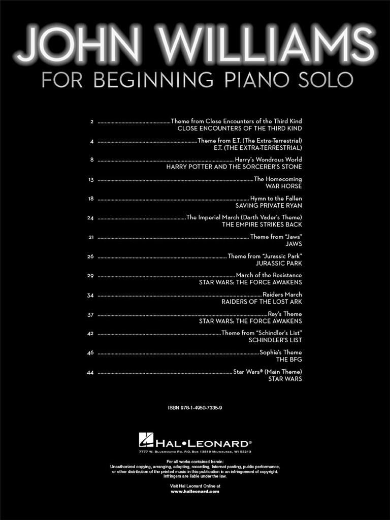 Noty pre klavír Výber slávnych filmových melódií amerického skladateľa Johna Williamsa v ľahkých úpravách pre klavír, ktoré by mali zvládnuť aj začínajúci klaviristi. Zoznam skladieb: Theme From Close Encounters Of The Third Kind [John Williams] 2. Theme From E.T. (The Extra-Terrestrial) (From The Universal Picture E.T. (The Extra-Terrestrial)) [John Williams] 3. Harryho zázračný svet (z filmu Harry Potter a Kameň mudrcov) [John Williams] 4. Návrat domov (z filmu Vojnový kôň) [John Williams] 5. Hymn To The