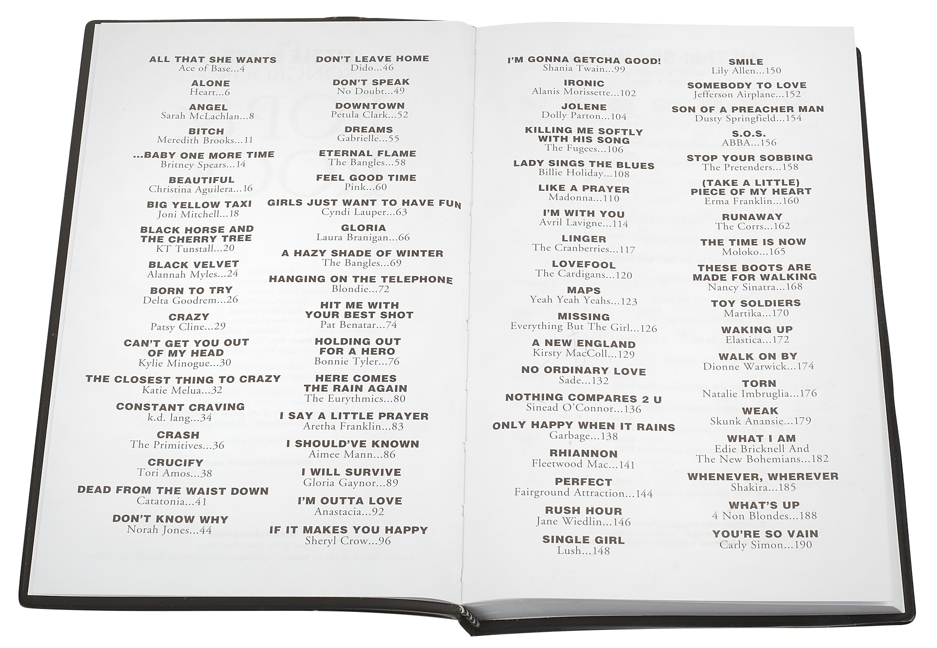 Spevník MALÁ ČIERNA KNIHA: POP & ROCK Knihy Little Black Book sú spevníky, ktoré obsahujú texty a akordové značky a najviac ich ocenia gitaristi. Tento zväzok je venovaný popovým a rockovým hitom. Zoznam skladieb: (Take A Little) Piece Of My Heart [Franklin, Erma] …Baby One More Time [Spears, Britney] Nové Anglicko [Maccoll, Kirsty] Všetko, čo chce [Ace Of Base] Sám [srdce] Angel [McLachlan, Sarah] Krásna [Aguilera, Christina] Big Yellow Taxi [Mitchell, Joni] Mrcha [Brooks, Meredith] Čierny kôň a čere