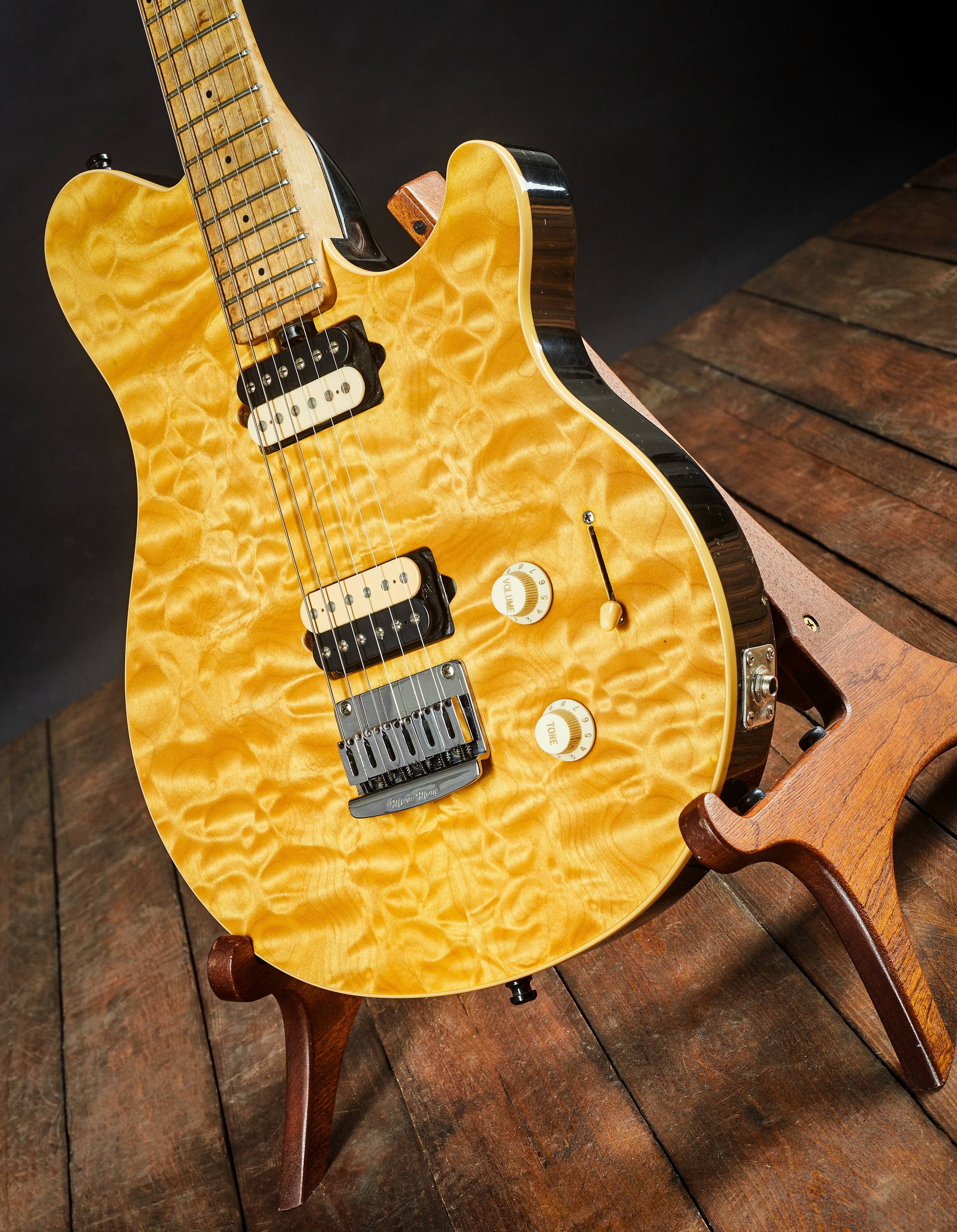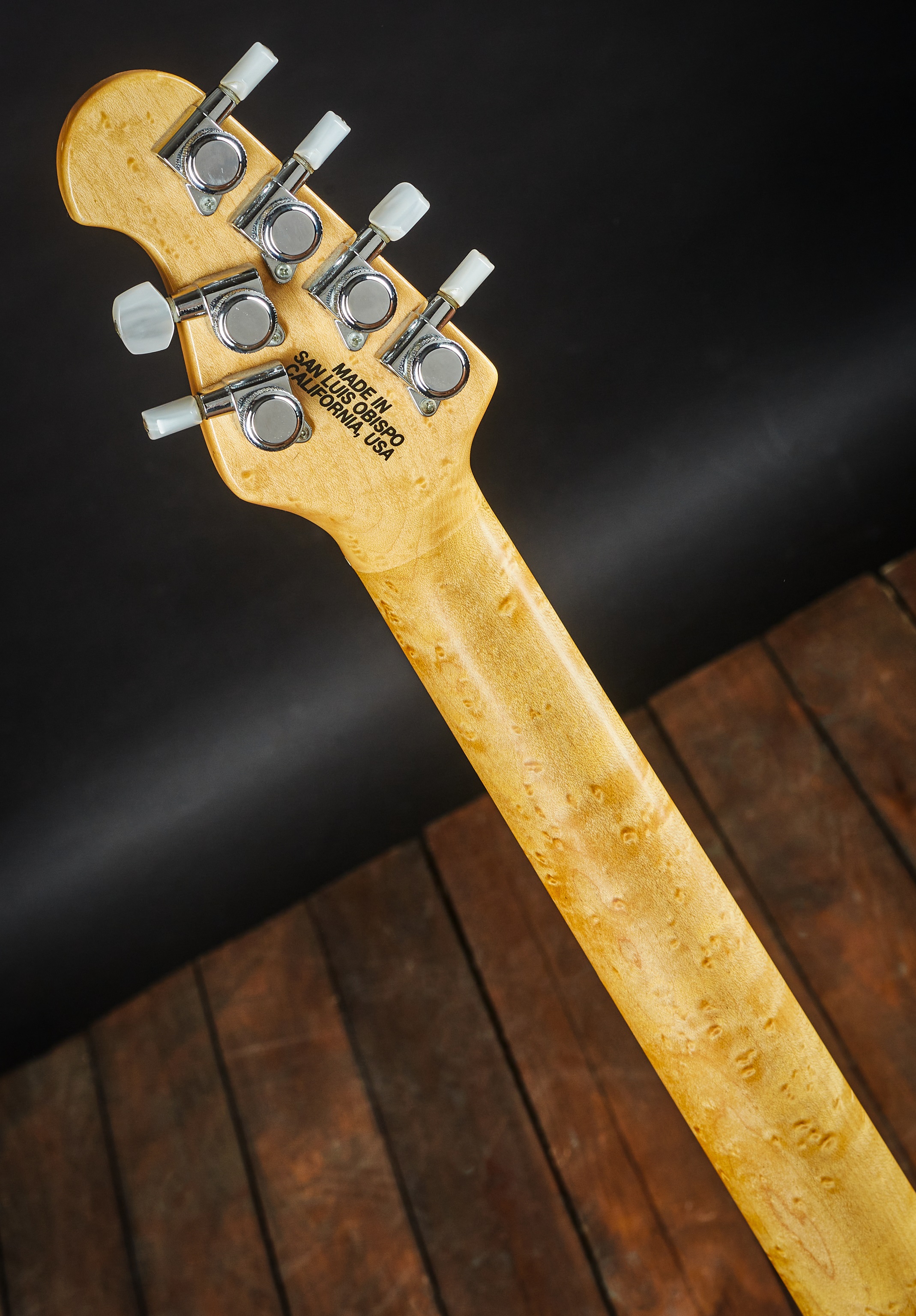 Elektrická gitara USA MusicMan z roku 1999. Gitara navrhnutá pre najvyšší komfort a rýchlosť hry, vynikajúci nástroj pre technických hráčov. Vrchná doska tela je lakovaná farbou Translucent Gold, čo umožňuje vyniknúť javorovej štruktúre, a hlavička je v rovnakom prevedení. Takmer všetko je pôvodné, okrem snímača Dimarzio Tone Zone, ktorý je veľmi podobný pôvodným OEM snímačom. Na gitare sú namontované rôzne popruhové zámky, originálne sú súčasťou balenia. Nástroj sa predáva v režime BAZAAR s DPH.