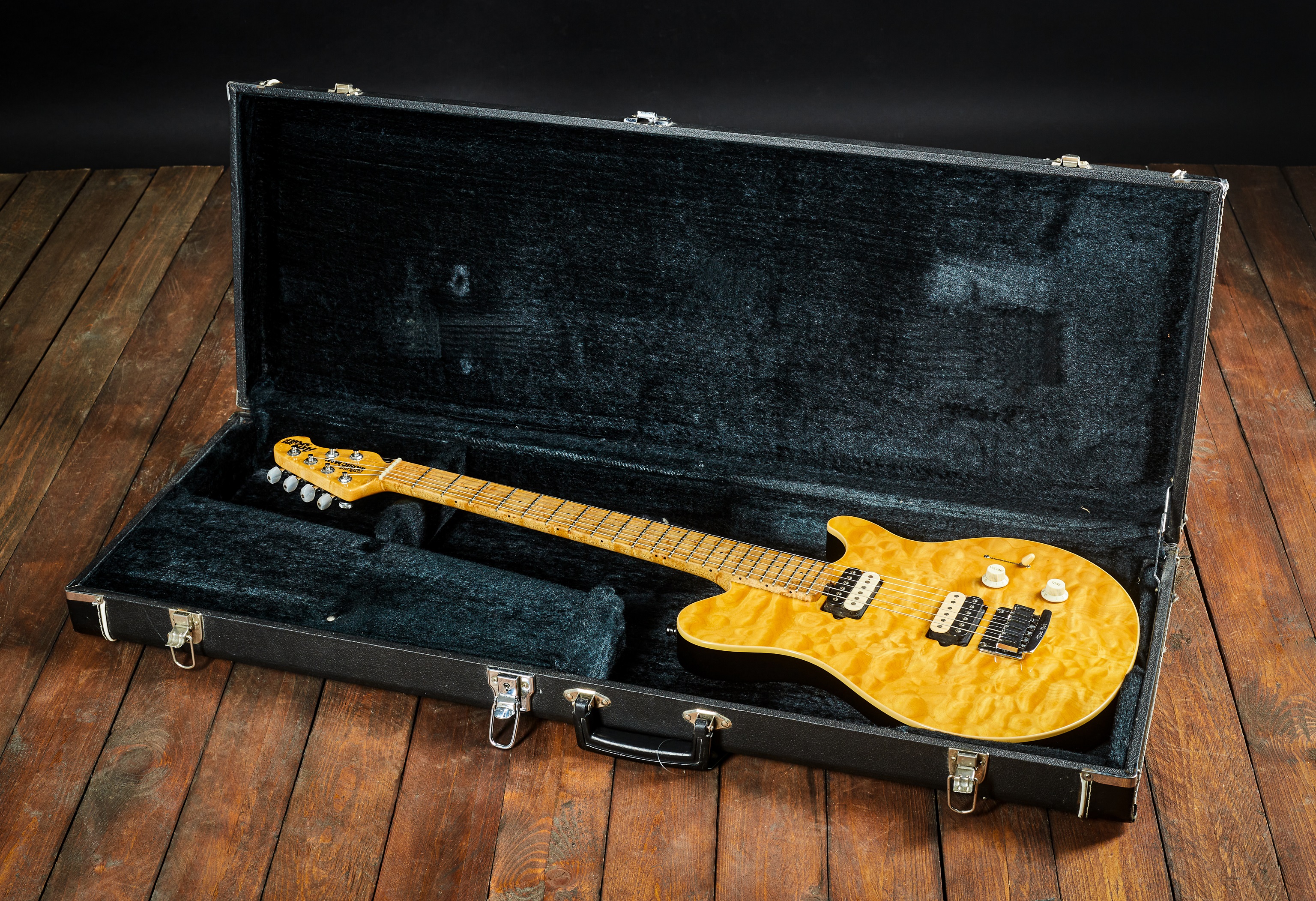 Elektrická gitara USA Music. Man z roku 1999. Gitara navrhnutá pre najvyšší komfort a rýchlosť hry, vynikajúci nástroj pre technických hráčov. Vrchná doska tela je lakovaná farbou Translucent Gold, čo umožňuje vyniknúť javorovej štruktúre, a hlavička…