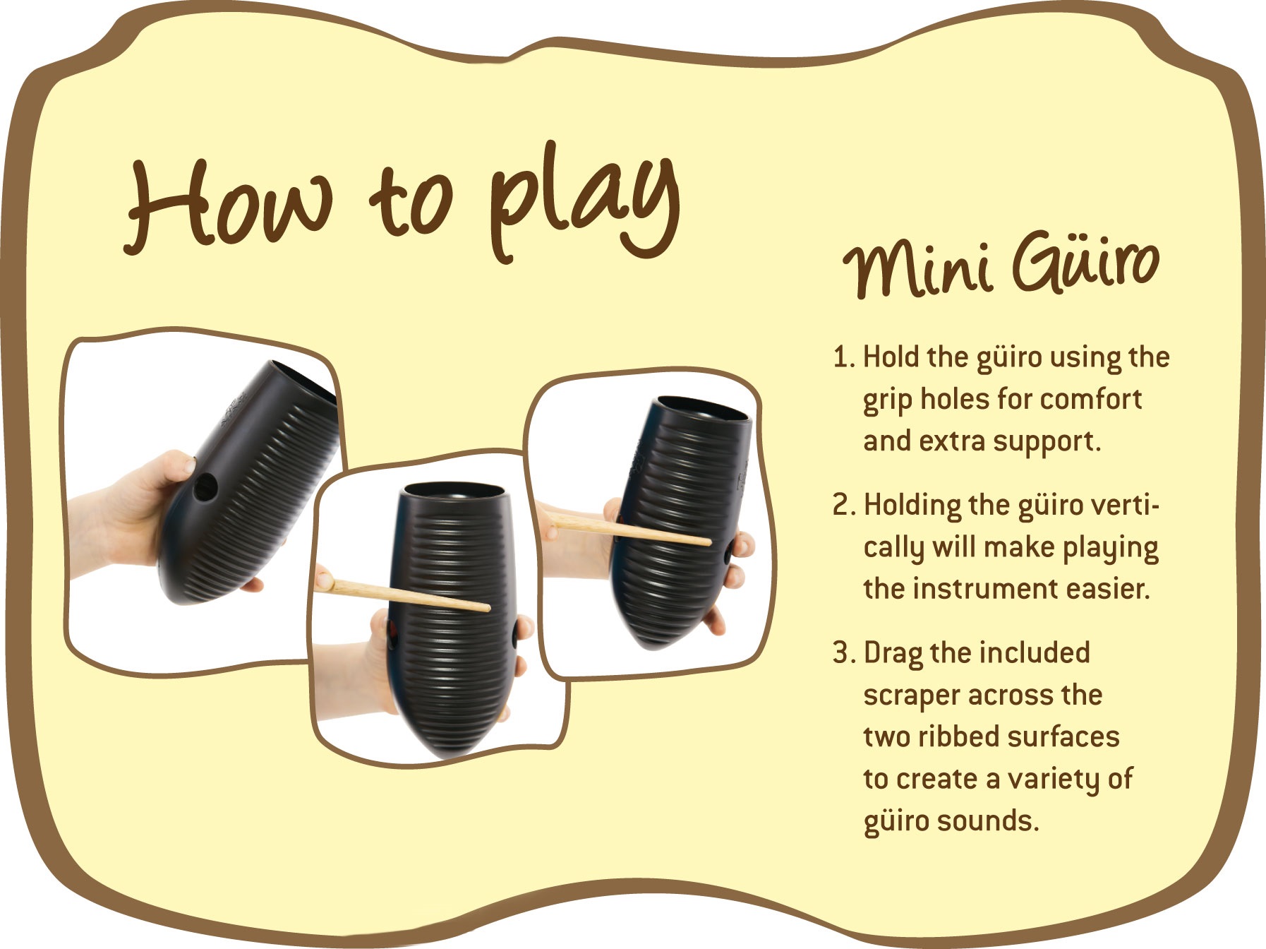 Guiro Toto guiro patrí pod značku Nino Percussion, ktorá patrí spoločnosti Meinl. Tieto bicie nástroje sú vhodné nielen pre deti, ale aj pre všetkých ostatných hudobníkov, ktorí hľadajú lacné, ale kvalitné nástroje. Tento model je vyrobený z vysoko odolného laminátu a ponúka tri rôzne hracie plochy pre maximálnu zvukovú variabilitu. Súčasťou balenia je plastová palička. Držiace body sú pogumované pre bezpečnejšie uchopenie.