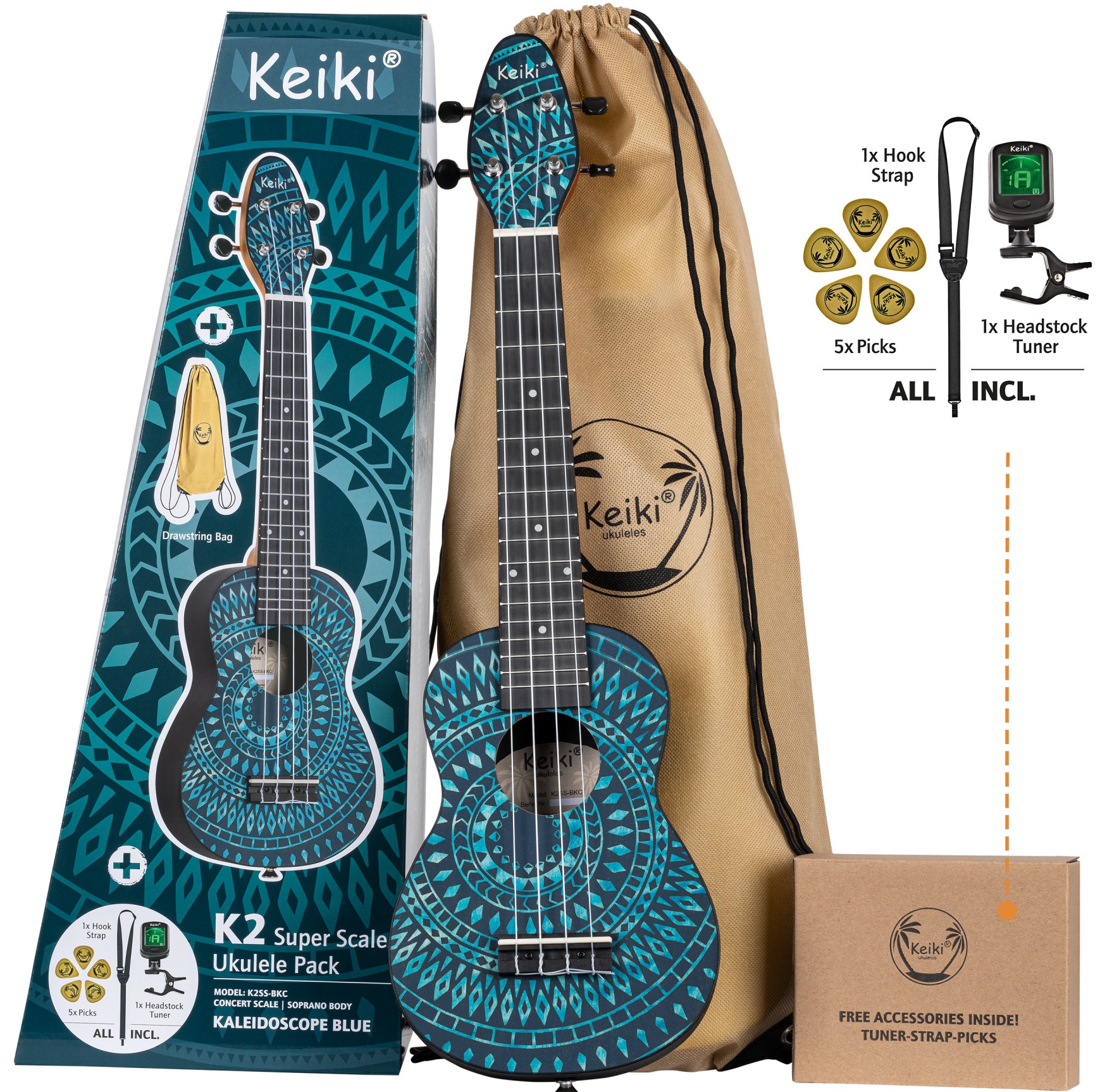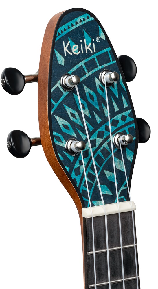 Ukulele komplet Ukulele K2SS zo série Ortega Keiki kombinujú kompaktnejšie telo sopránových ukulele s dlhším krkom a hmatníkom koncertných ukulele (výrobca ich uvádza ako Soprano Super Scale). Predné strany nástrojov sú zdobené farebnými grafickými motívmi inšpirovanými pouličným umením. Konštrukcia ukulele K2SS-BKC pozostáva z laminovanej agathisovej prednej dosky a jemne klenutého tela z ABS plastu. K okoumé krku je prilepený ABS hmatník s dvanástimi pražcami. Struny sú uchytené v ABS hmatníku a chrómovýc