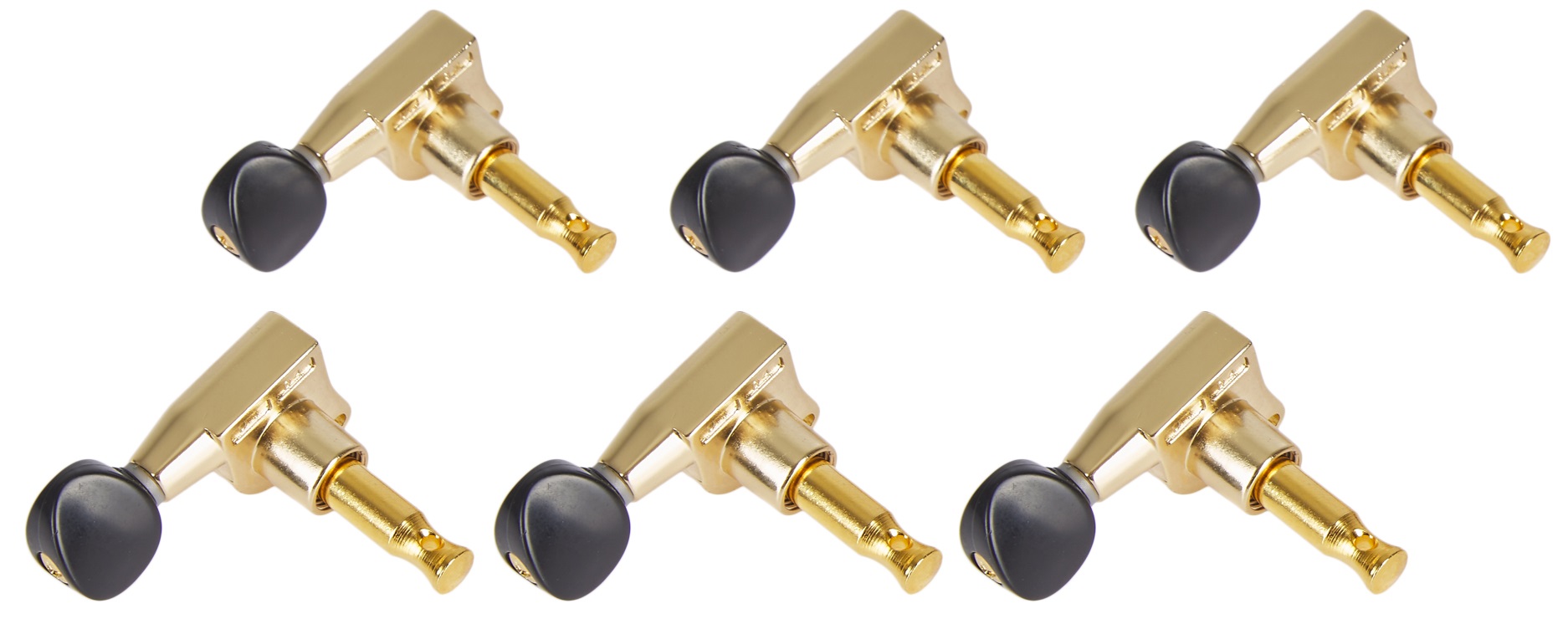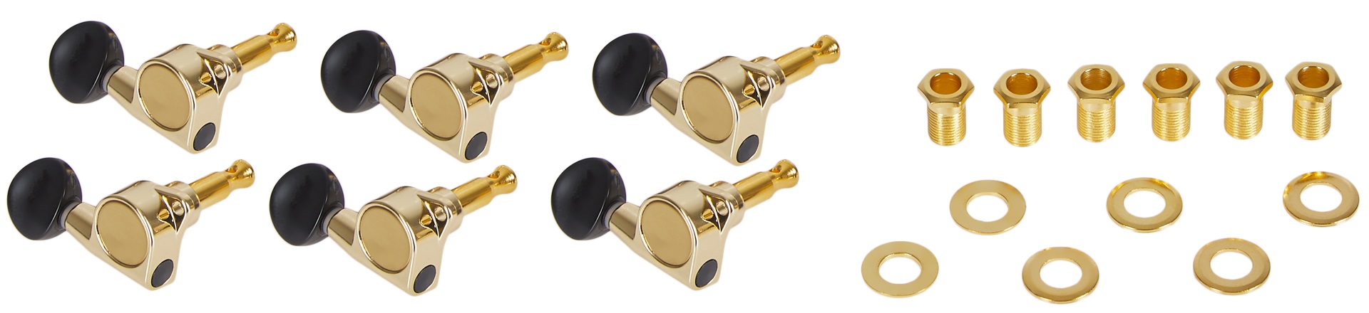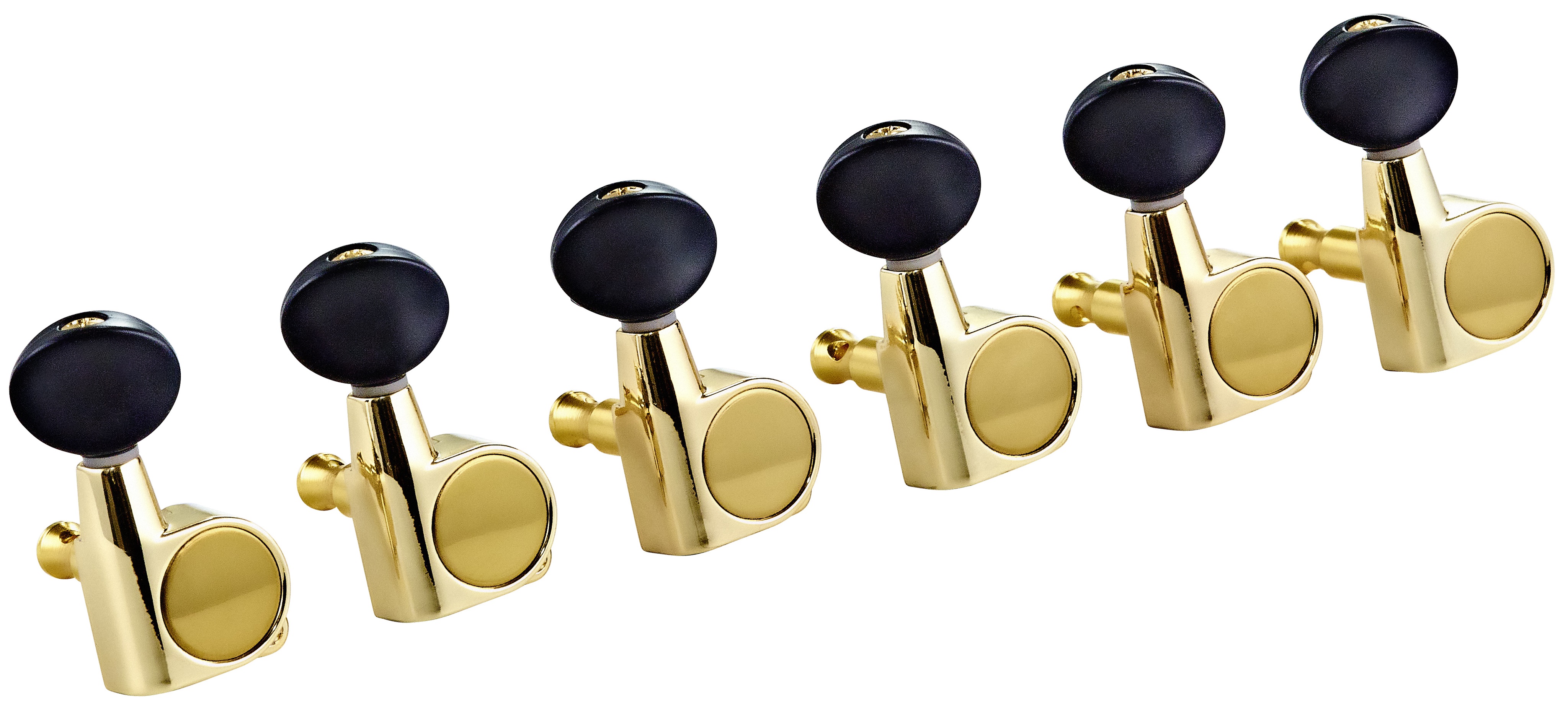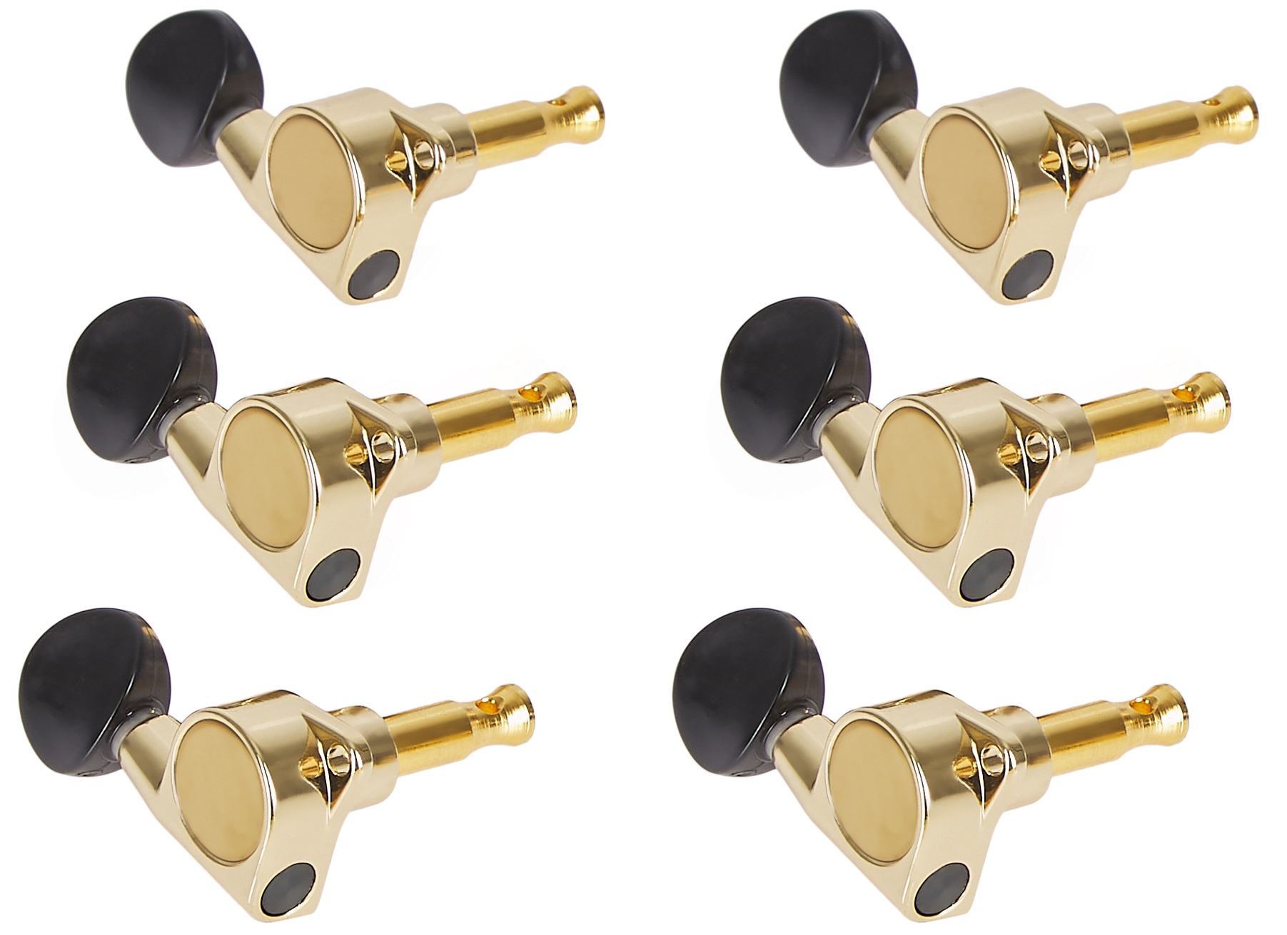 Gitarová mechanika Ladiace mechanizmy pre elektrickú gitaru. Sú vyrobené z kovu v zlatom prevedení, kolíky sú z odolného čierneho plastu. Vhodné pre nástroje so šiestimi mechanikami v jednom rade.