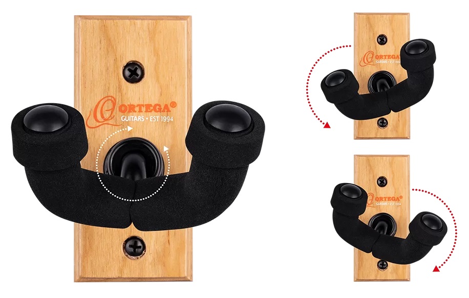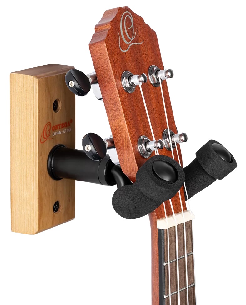 Vešiak pro ukulele Spoľahlivý a elegantný držiak so základňou zo svetlého čerešňového dreva. Nástroj drží na mieste ergonomicky tvarovaná oceľová vidlica s ochranným penovým krytom. Otočná vidlica sa navyše sama prispôsobí tvaru hlavy nástroja, takže držiak možno použiť aj pre nástroje s atypickými hlavami. Vhodné pre ukulele.