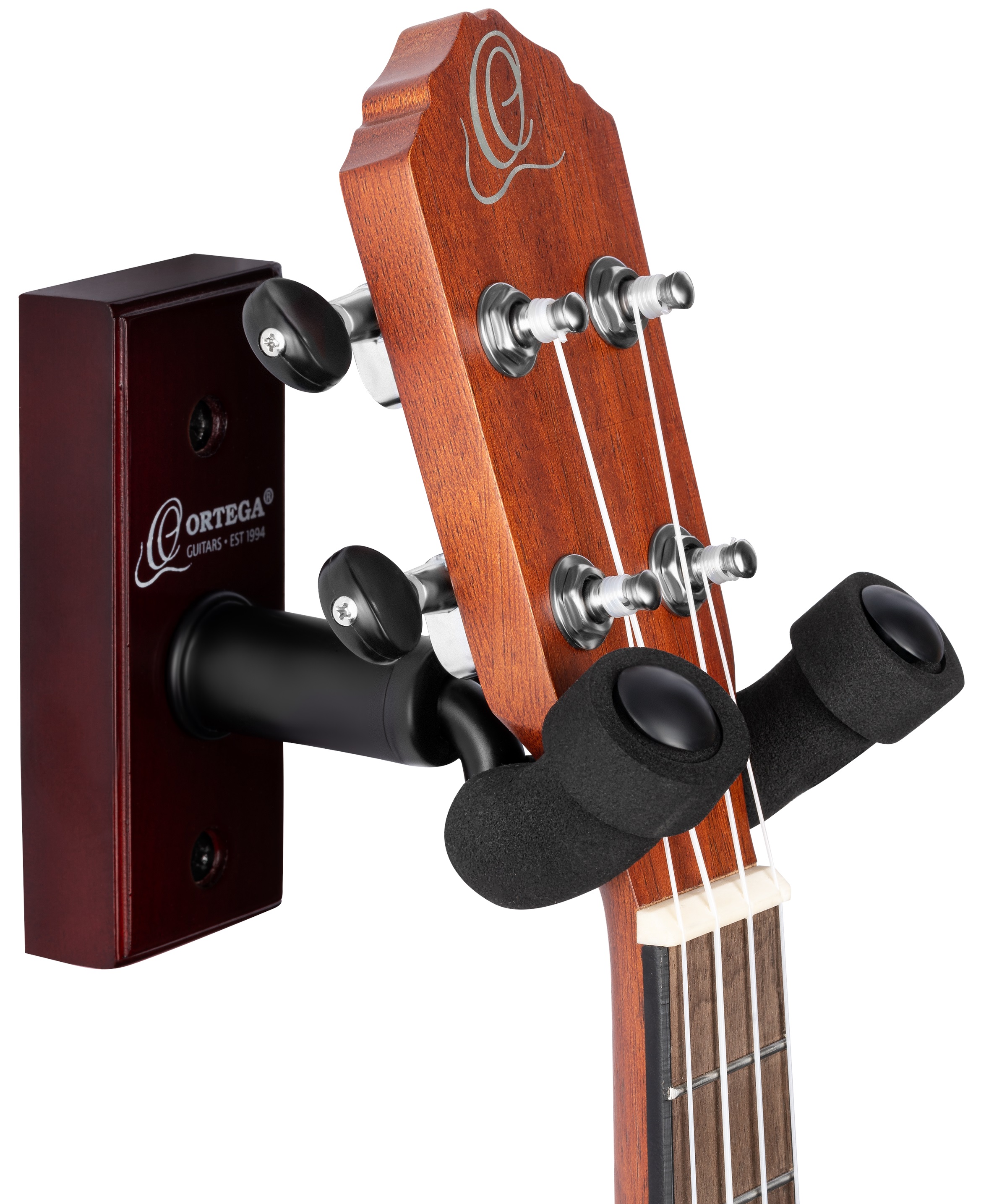 Vešiak pro ukulele Spoľahlivý a elegantný držiak s drevenou základňou. Nástroj drží na mieste otočná oceľová vidlica s ochranným penovým poťahom. Otočná vidlica sa navyše sama prispôsobí tvaru hlavy nástroja, takže držiak možno použiť aj pre nástroje s atypickými hlavami. Vhodné pre ukulele alebo mandolínu. Súčasťou balenia sú aj upevňovacie skrutky a hmoždinky do sadrokartónu.