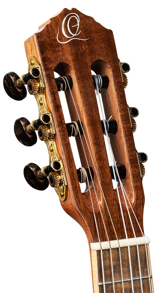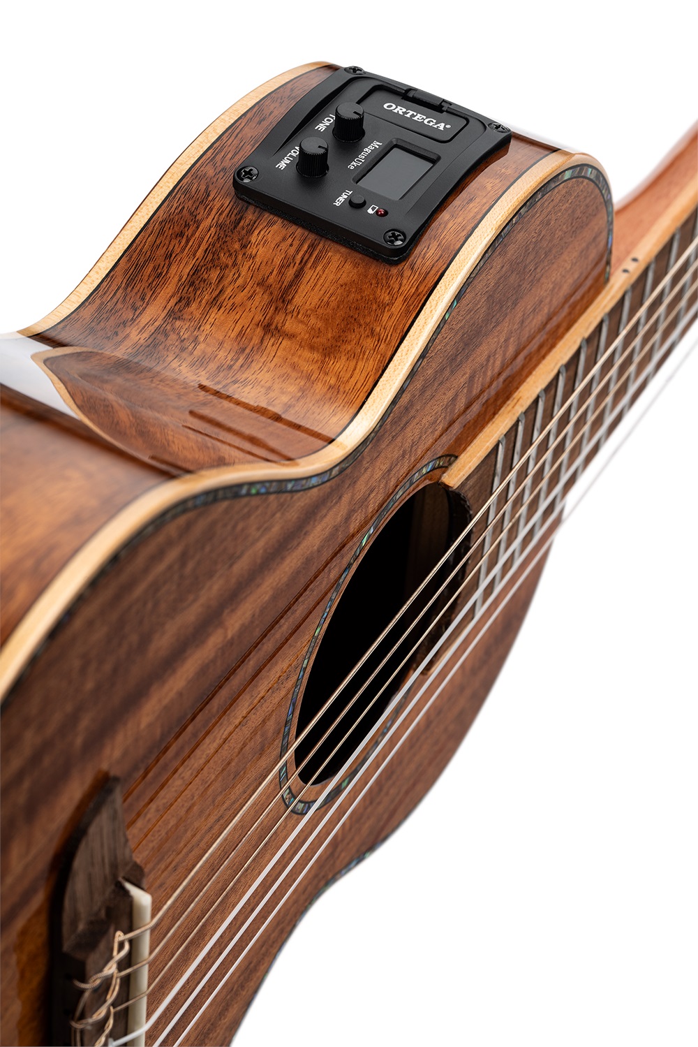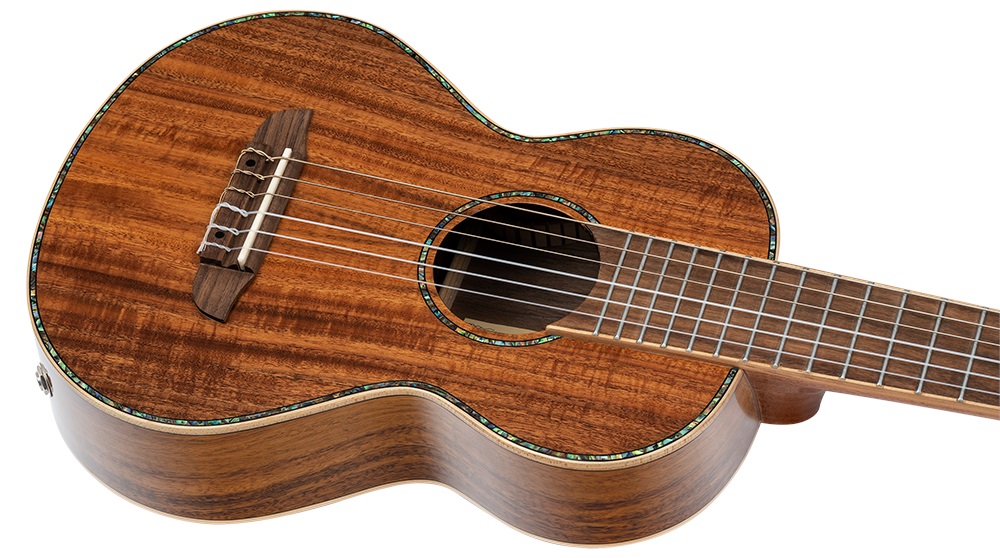 Elektroakustické gitarové ukulele Gitarové ukulele Ortega RGLE18ACA má polomasívnu konštrukciu s masívnou akáciovou rezonančnou doskou a masívnou akáciovou zadnou doskou a lubmi. K mahagónovému krku je prilepený orechový hmatník osadený osemnástimi pražcami. Struny sú osadené klasickou zlatou otvorenou mechanikou a hmatníkom z orechového dreva. Jemné spracovanie podčiarkuje javorová väzba tela doplnená imitáciou perleťových intarzií, väzbou hmatníka a javorovou stredovou zadnou lištou. Nástroj je ozvučený p
