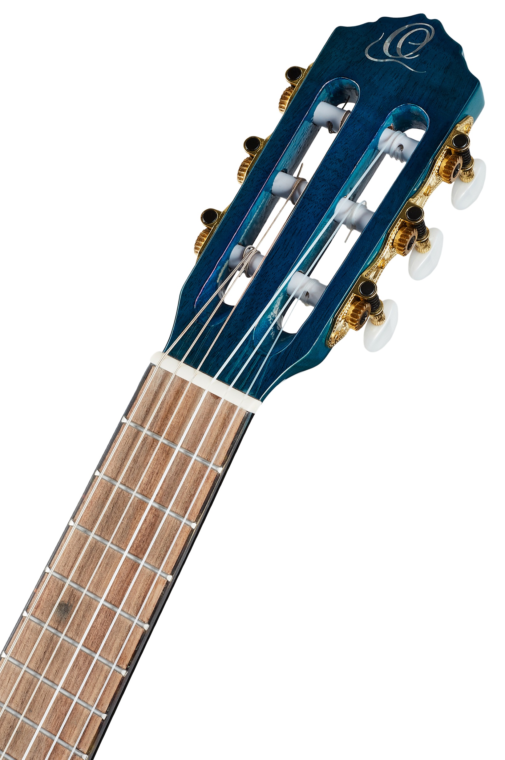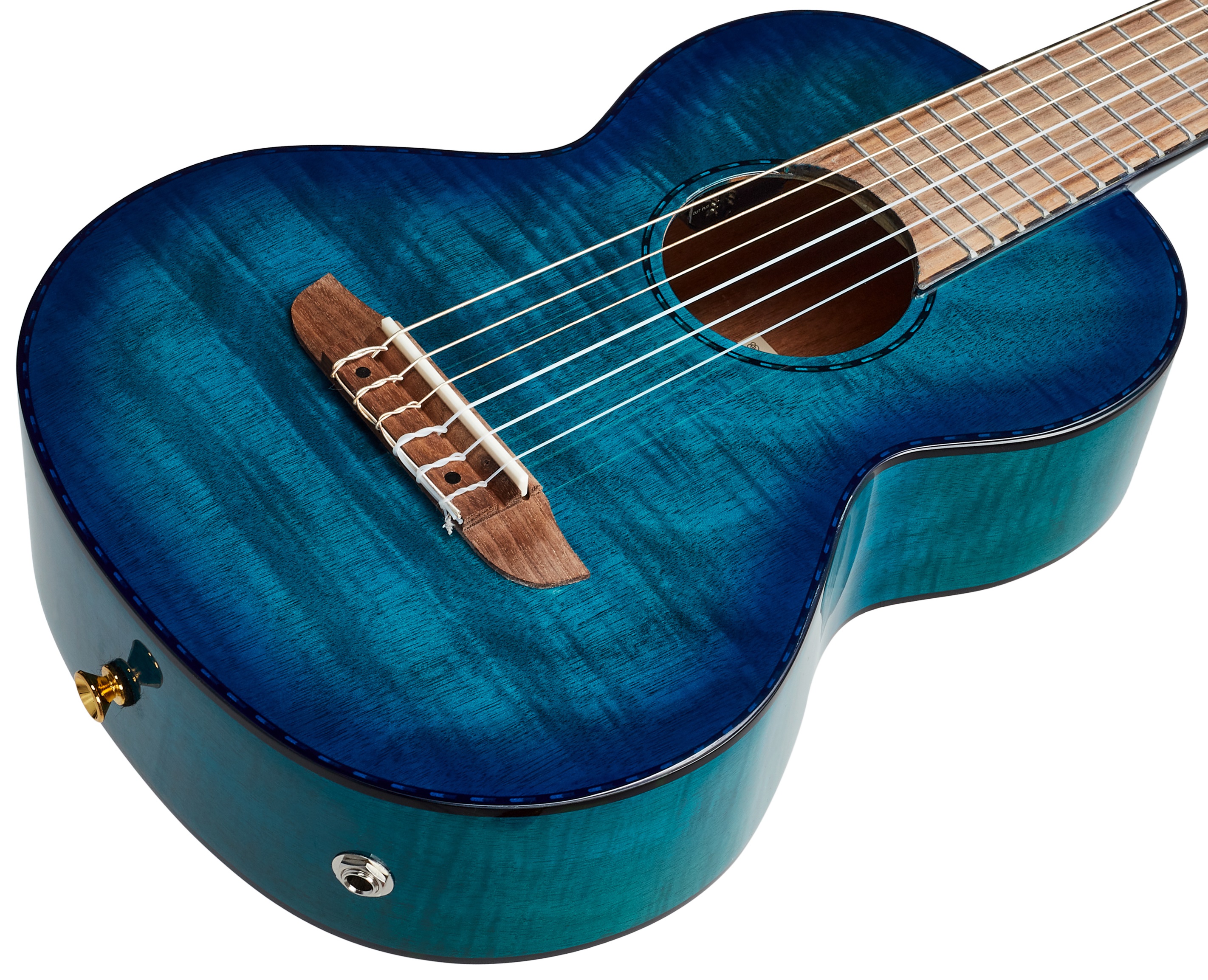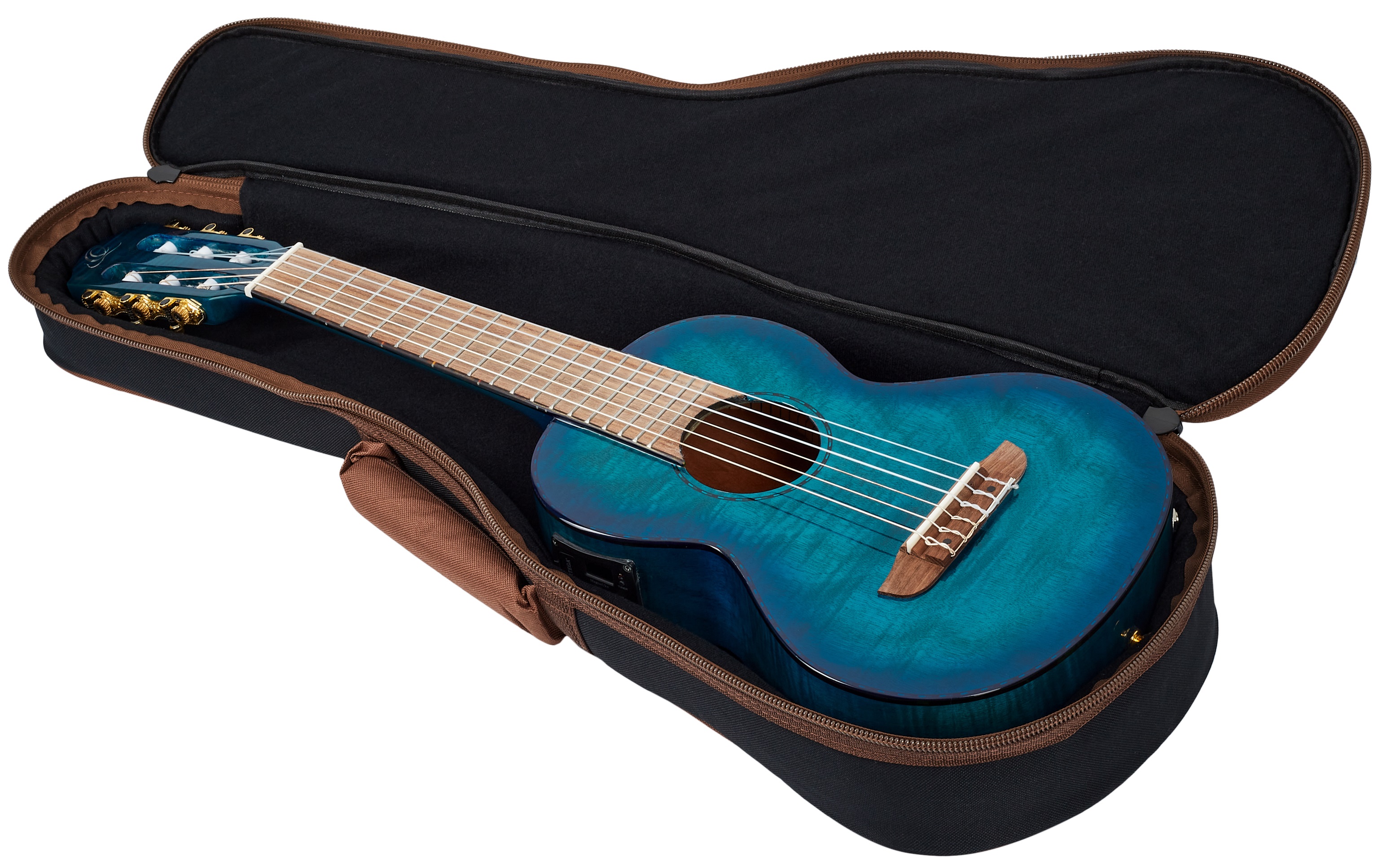 Elektroakustické gitarové ukulele Guitalele Ortega RGLE18BLF zo série Timber je vyrobená z laminovaného mahagónu (flambovaný mahagón) s kresbou dreva podporenou efektnou povrchovou úpravou Faded Blue. K mahagónovému krku je prilepený orechový hmatník s osemnástimi pražcami. Struny sú uchytené v klasickej konštrukcii (štrbinová hlavica) a hmatník z orechového dreva. Nástroj je ozvučený predzosilňovačom MagusUke s integrovanou ladičkou. Guitalale sa dodáva v gig bagu. Guitar ukulele (guitalele) je kompaktný n