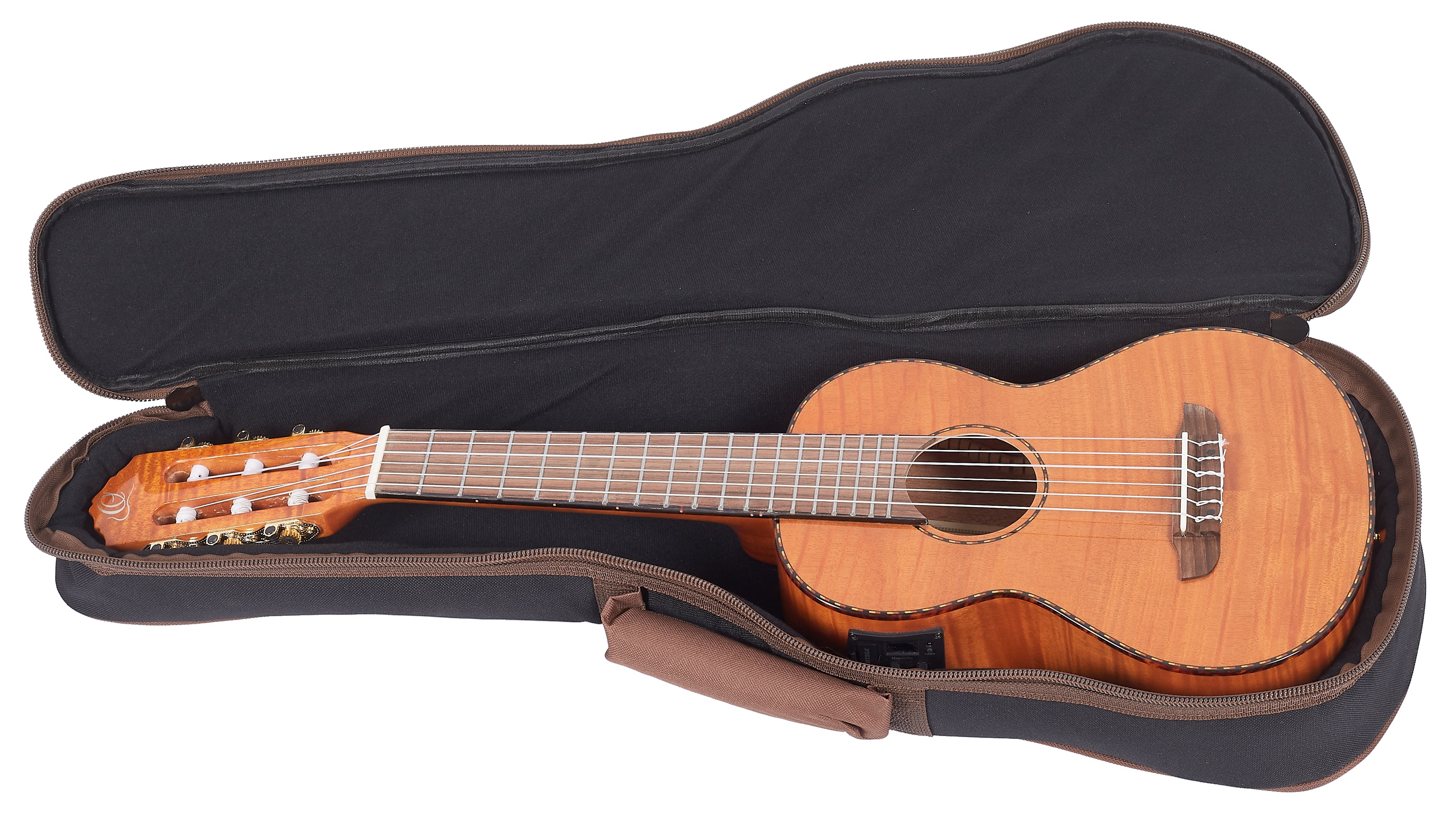 Elektroakustické gitarové ukulele Gitarové ukulele (guitalele) je kompaktný nástroj, ktorý kombinuje vlastnosti ukulele a klasickej gitary. Je ideálnou voľbou pre hudobníkov zvyknutých hrať na klasickú gitaru, ktorých láka zvuk a kompaktný tvar ukulele, ale nechcú sa učiť nové akordy. Telo tohto elektroakustického gitarového nástroja zo série Tiger je vyrobené z prekrytého dyhovaného mahagónu s chladnou kresbou dreva a lesklým povrchom. Vedľa mahagónového krku je osadený orechový hmatník osadený osemnástimi
