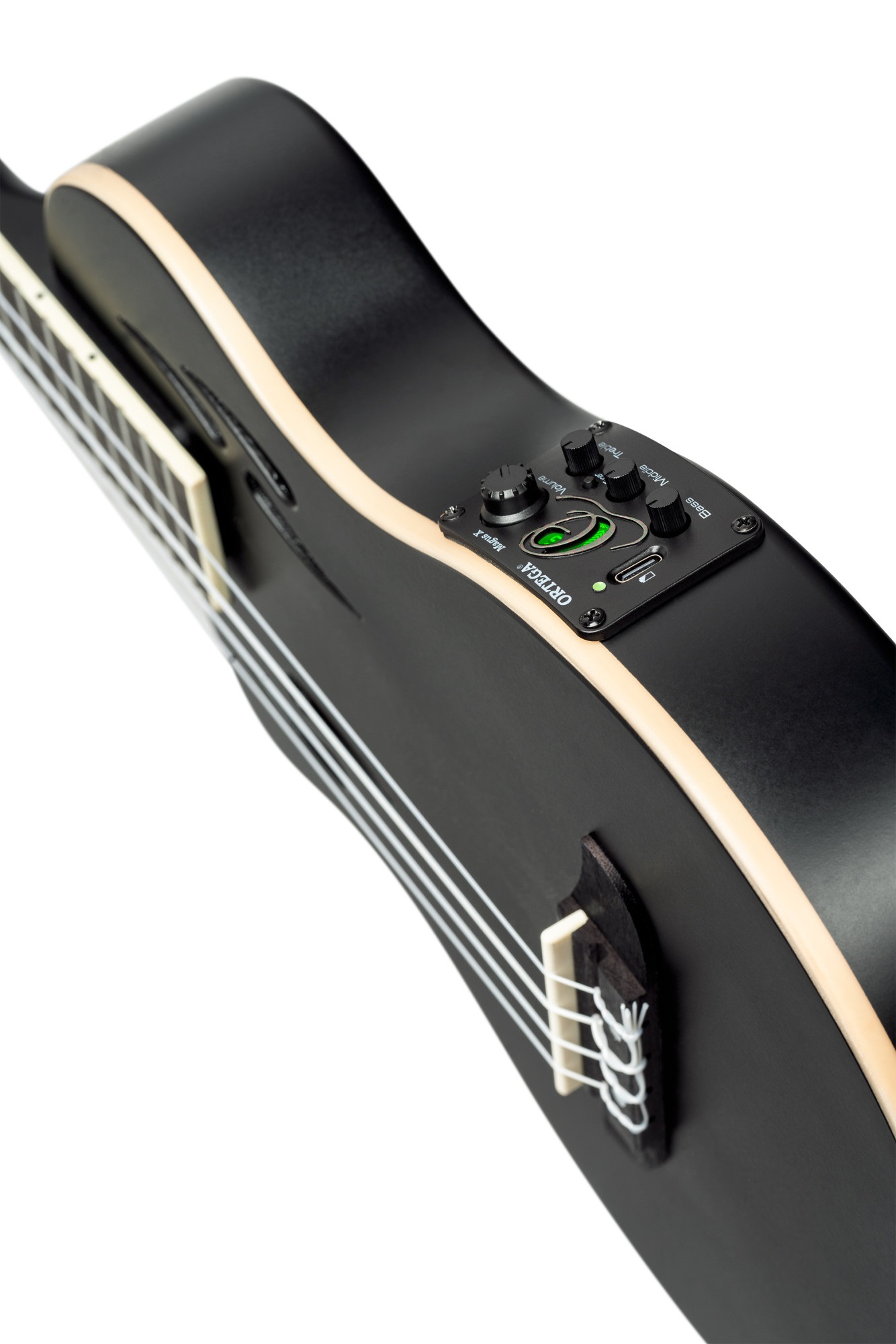 Ľavoručné elektroakustické ukulele Elektroakustické tenorové ukulele Ortega zo série TourPlayer sa vyznačuje moderným dizajnom prevzatým z úspešnej série TourPlayer a elektronikou Ortega MagusX/U. Telo ľavorukého ukulele Ortega RTPS Tenor LH SBK je vyrobené z masívneho komorovaného okoumé a smrekovej vrchnej dosky. K mahagónovému krku je prilepený hmatník z dreva purpleheart osadený dvadsaťjeden pražcami. Nižší výrez tela uľahčuje hmatník vo vyšších polohách. Ozvučenie ukulele zabezpečuje elektronika Ortega