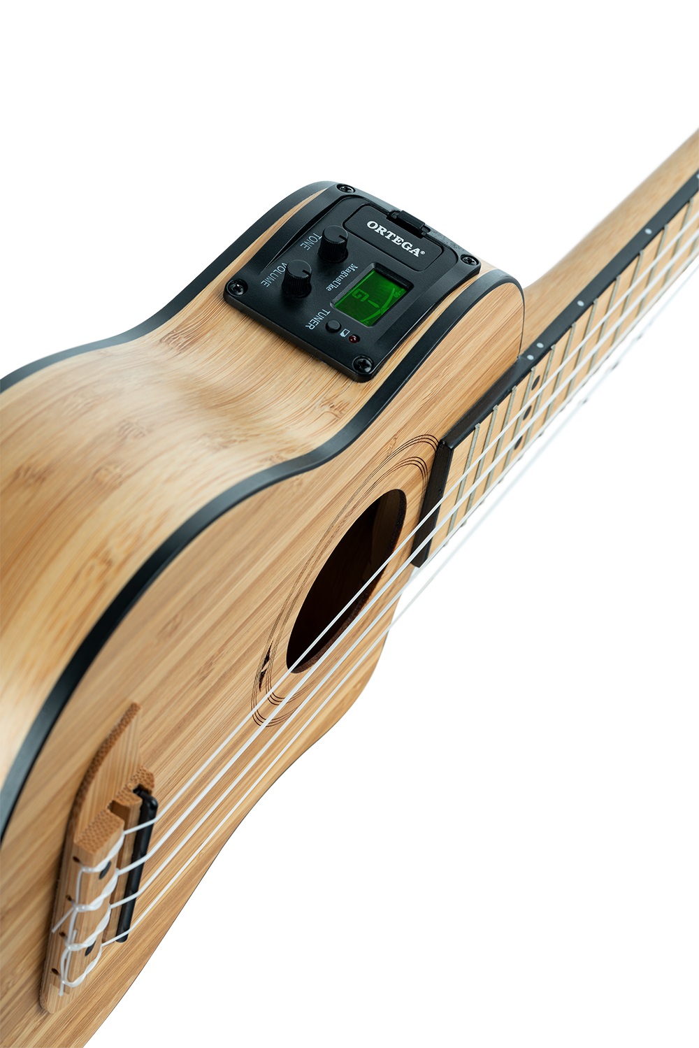 Elektroakustické ukulele Rad Ortega Bamboo ponúka kvalitne spracované elektroakustické ukulele rôznych veľkostí vyrobené z bambusu. Telo sopránového ukulele RUNAB-SO je vyrobené z masívneho bambusu. Plochu hmatníka rozdeľuje pätnásť pražcov, dohmat na vyšších polohách uľahčuje spodný výrez tela. Struny sú uchytené v ladiacich mechanikách typu Graph Tech Ratio s trecím mechanizmom a čiernymi kolíkmi. Pekné spracovanie podčiarkuje čierna obvodová lišta tela a rozeta v podobe laserového gravírovania. Nástroj j