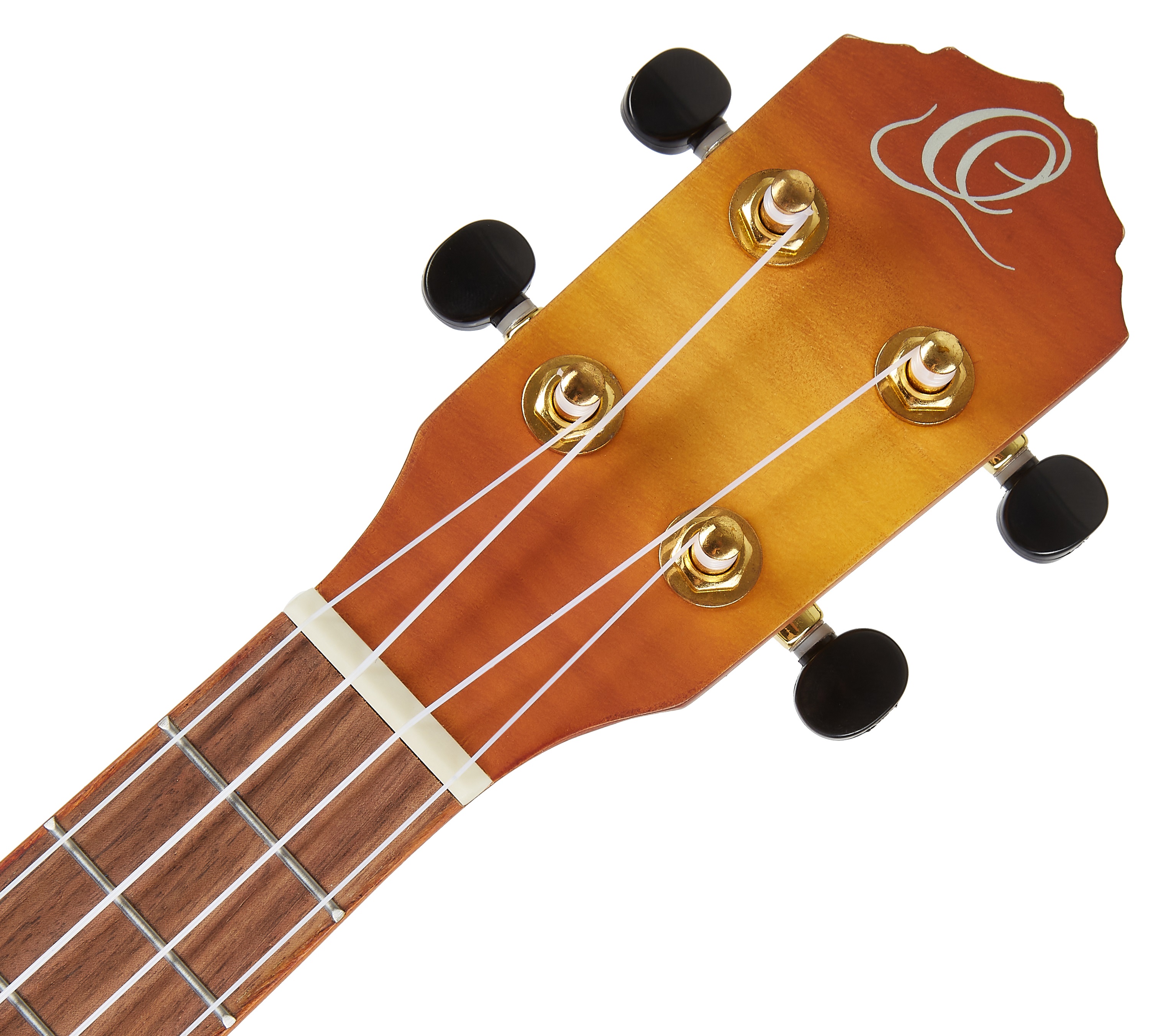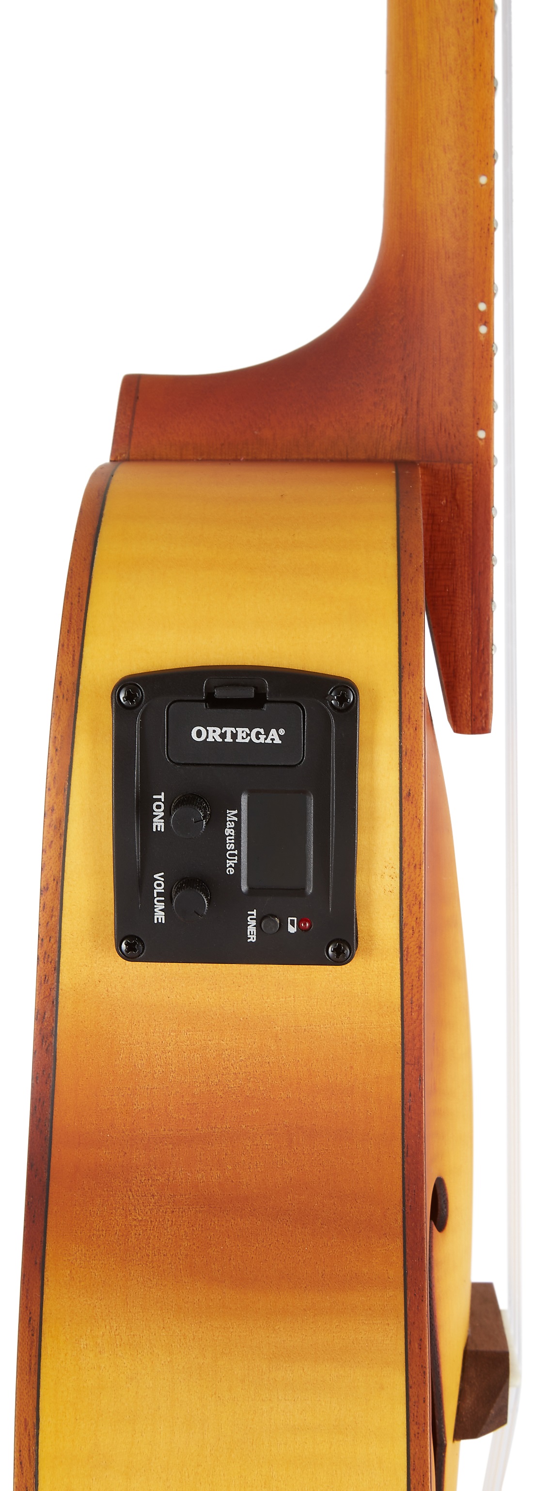 Elektroakustické ukulele Elektroakustické ukulele Ortega RUSL-HSB zo série Saloon ponúka príjemne nostalgický dizajn, ktorý vás prenesie do dávnych čias. Dva klasické F výrezy na rezonančnej doske, hmatník a pražec odvodený od mandolíny a príjemná povrchová úprava Honey Burst dodávajú tomuto nástroju punc jedinečnosti. Telo ukulele je vyrobené z preglejky dyhovanej javorom s peknou kresbou dreva. Na krk z okoumé nadväzuje orechový hmatník osadený osemnástimi pražcami. Struny sú uchytené v pozlátenom strunní