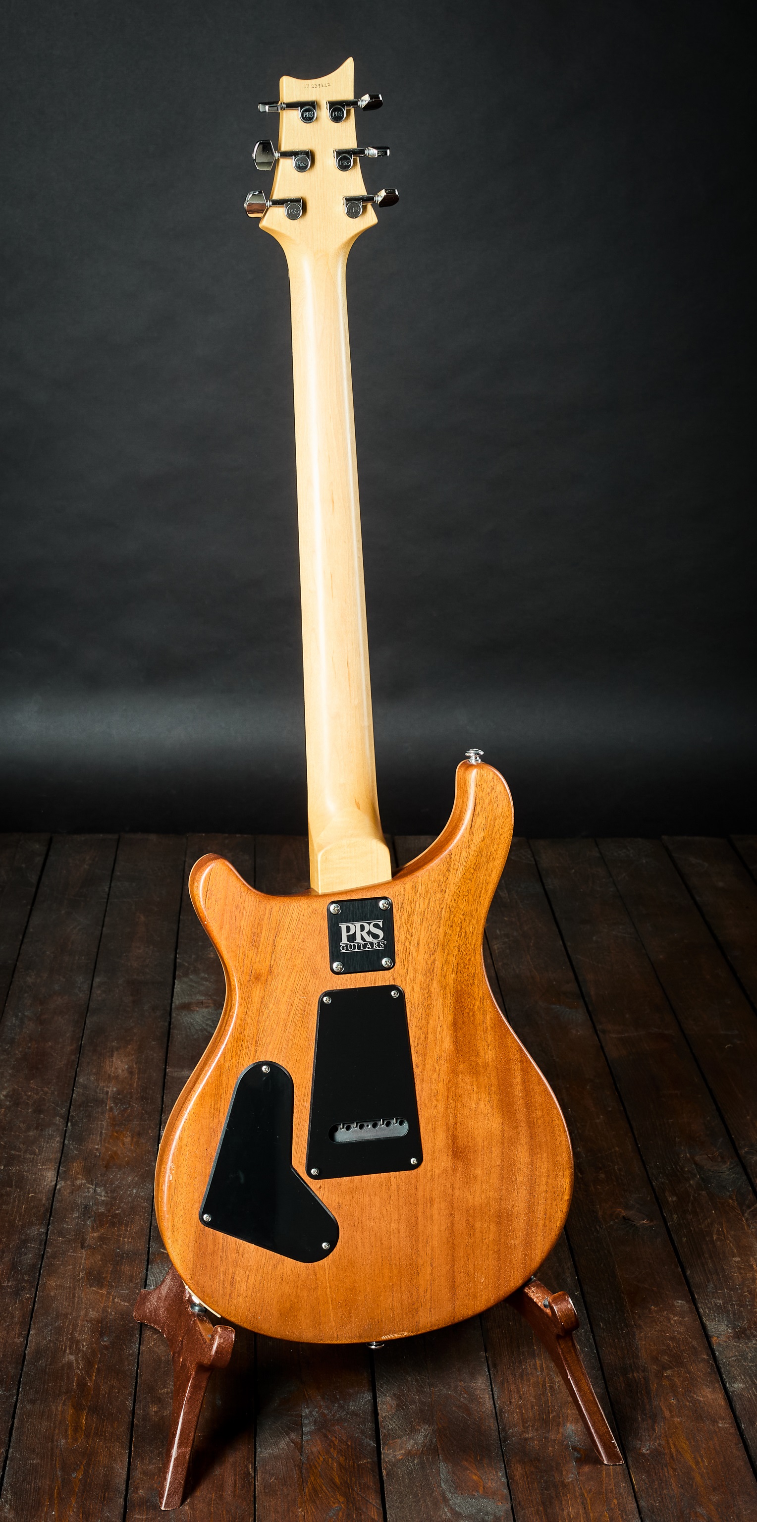 Elektrická gitara Americký model CE24 má prišraubovaný krk a matný povrch „smokeburst“ v nitrocelulózovom laku. Mierne hraná gitara z roku 2017 v dobrom stave. Mahagónové telo má javorovú prednú dosku v povrchovej úprave Faded Fire Red Smokeburst. Krk je vyrobený z javora. Hmatník z ebenového dreva je zdobený kompletnou sadou intarzií, ktorými Paul Reed Smith zdobí svoje nástroje. Na tele sú viditeľné miesta vyleštené hraním a niekoľko drobných odrenín. Všetko je originálne! Nástroj sa predáva iba s tremolo