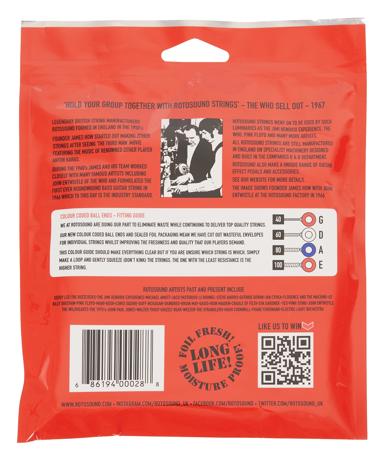 Struny na basgitaru Vyhladené basové struny Jazz Bass 77 poskytujú najteplejší tón z celého arzenálu Rotosound. Struny sú vyrobené z prémiovej monelovej zliatiny, ktorá je navinutá na oceľovom jadre. V porovnaní s bežnejšími strunami s oceľovým vinutím poskytujú hlbší, temnejší zvuk a väčšiu odolnosť voči korózii a znečisteniu. Struny sú vďaka svojmu zvukovému profilu a hladkému povrchu vhodné najmä pre jazzových hráčov. Na struny Rotosound sa pre ich skvel