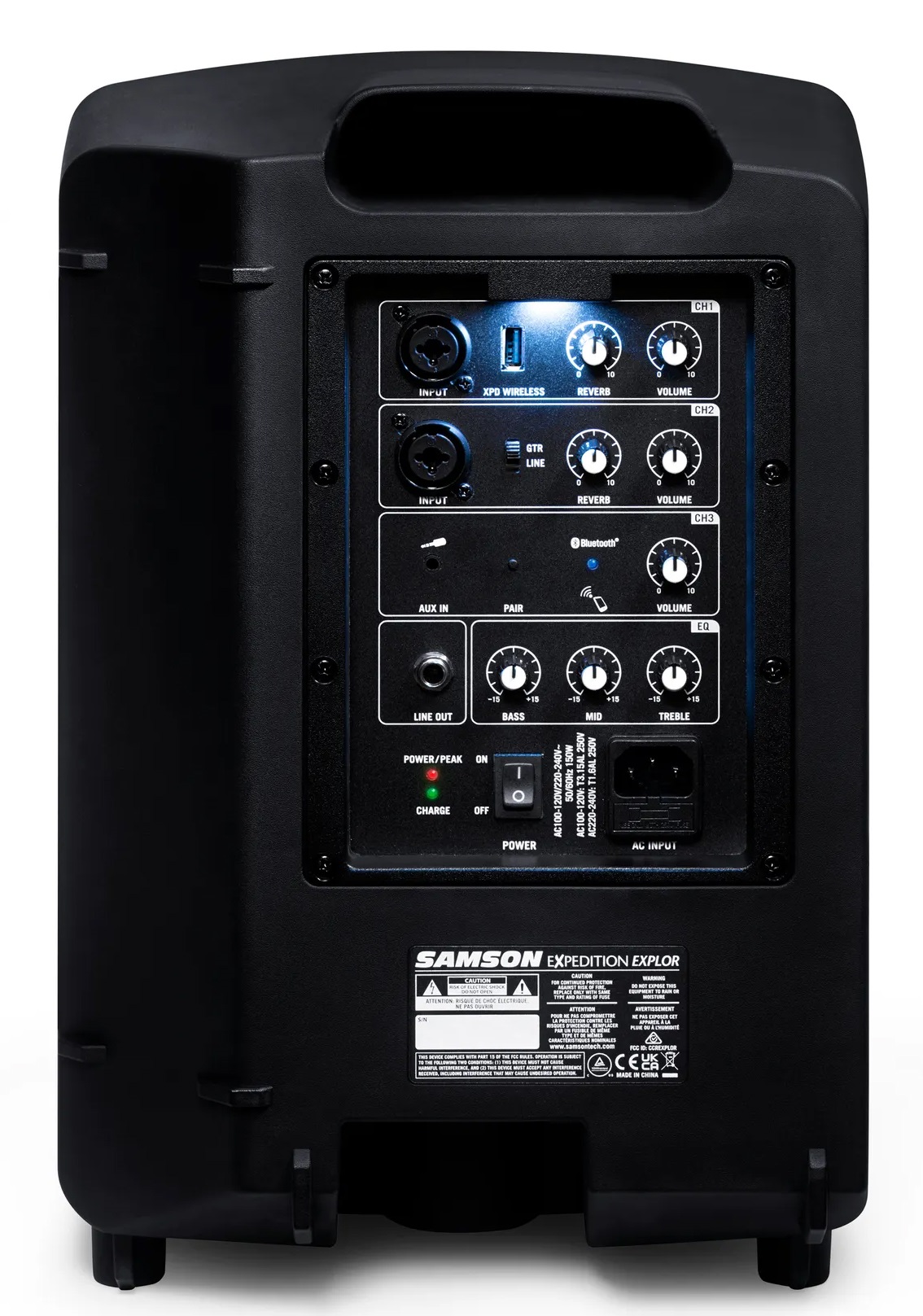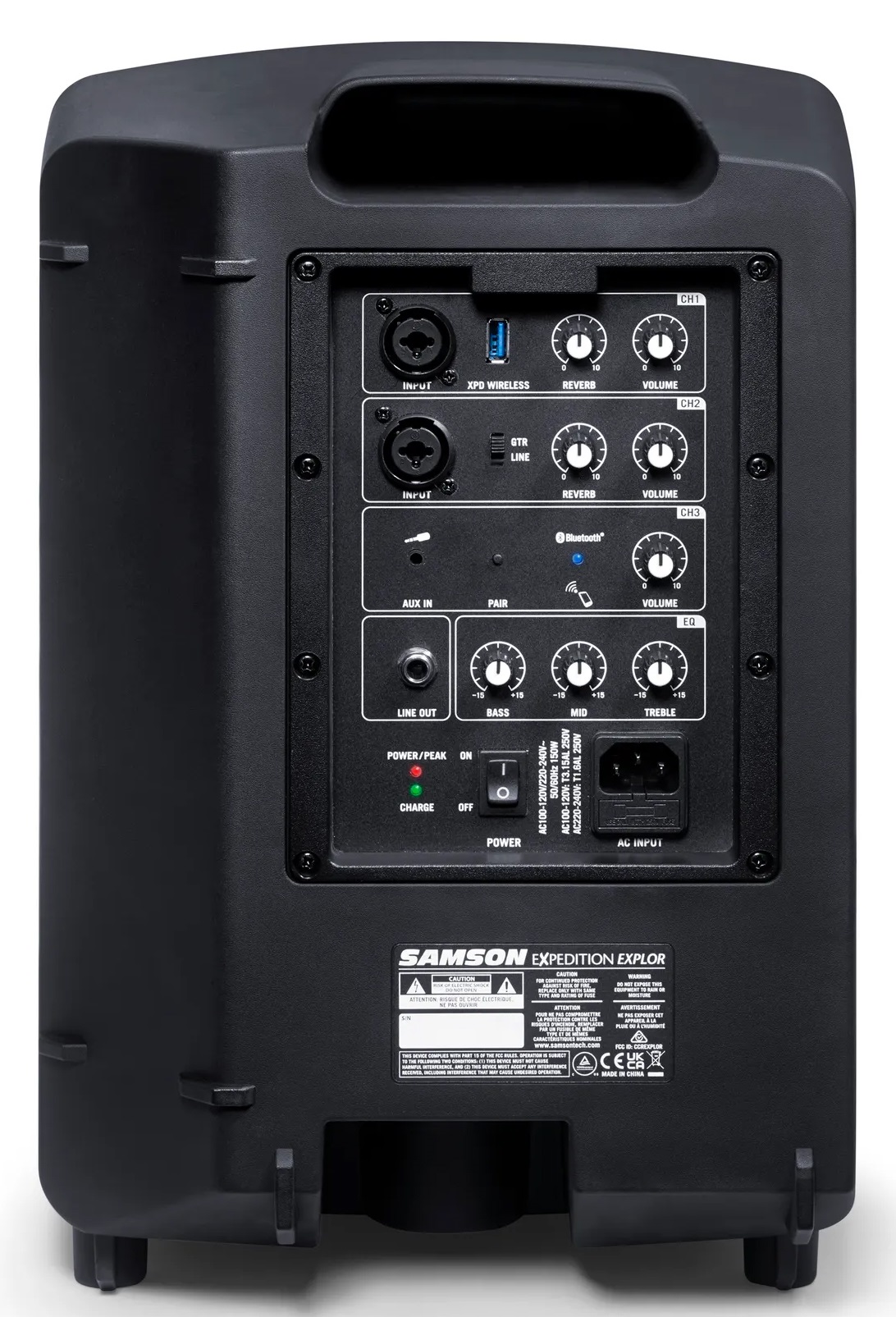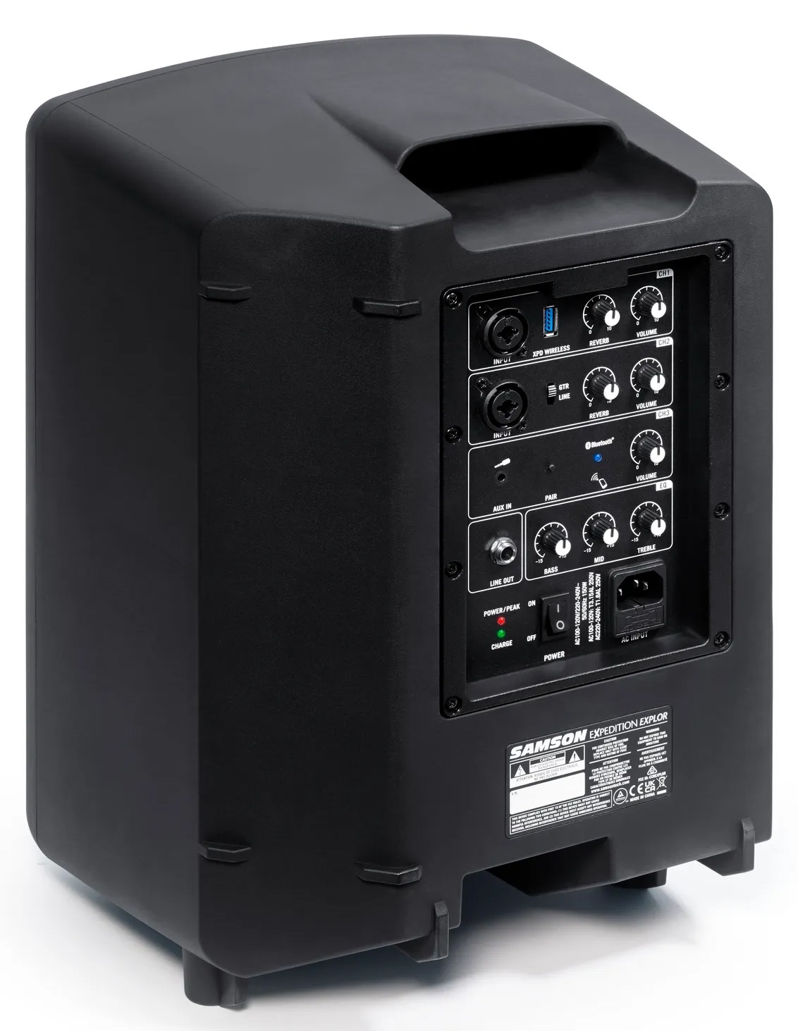 Ozvučovací systém Samson Expedition Explor je mobilný PA systém napájaný z batérie s trojpásmovým reproduktorovým systémom, t. j. osempalcovým wooferom, 3,5-palcovým stredovým reproduktorom a dvoma dvojpalcovými výškovými reproduktormi. Ponúka maximálny výkon až 200 W, 12 hodín nepretržitej prevádzky na vstavanú lítium-iónovú batériu, ľahkú konštrukciu so zabudovanou rukoväťou, trojkanálový mix na pripojenie mikrofónov, hudobných nástrojov a zariadení linkovej úrovne, trojpásmový ekvalizér, USB port kompati