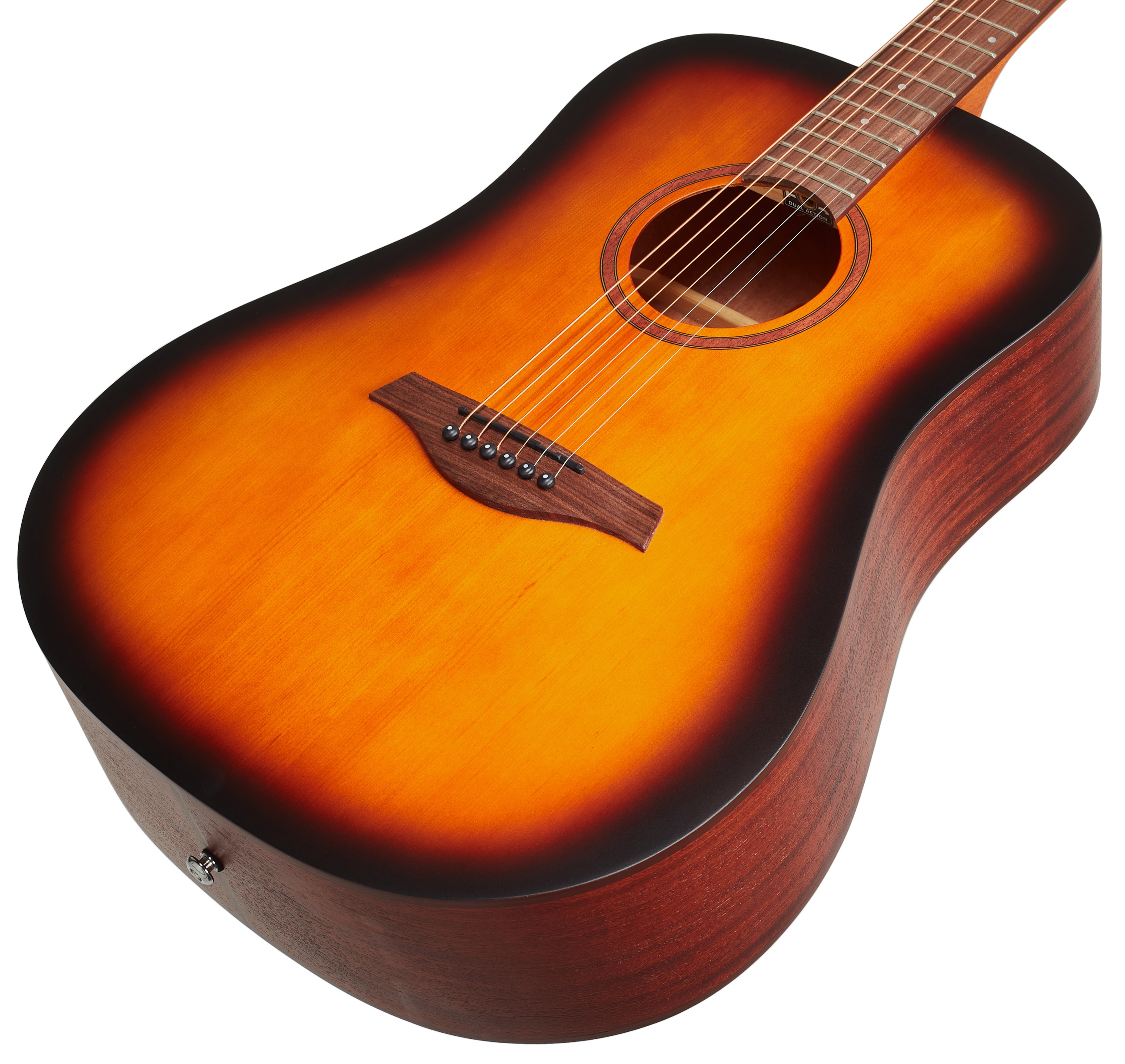 Akustická gitara Akustické gitary CODY od spoločnosti Soundsation vychádzajú z tradičného tvaru westernového dreadnoughtu. Sú dobrou voľbou prvého nástroja pre úplných začiatočníkov, ale aj vhodným spoločníkom na príjemný letný večer s priateľmi. Akustická gitara CODY DN-SBT je vybavená vrchnou doskou zo smrekového dreva, zadnou doskou a lubmi z preglejky sapele, krkom z okoumé s príjemným C profilom, hmatníkom z orechového dreva osadeným dvadsiatimi pražcami, kobylkou z orechového dreva, chrómovými die-cas