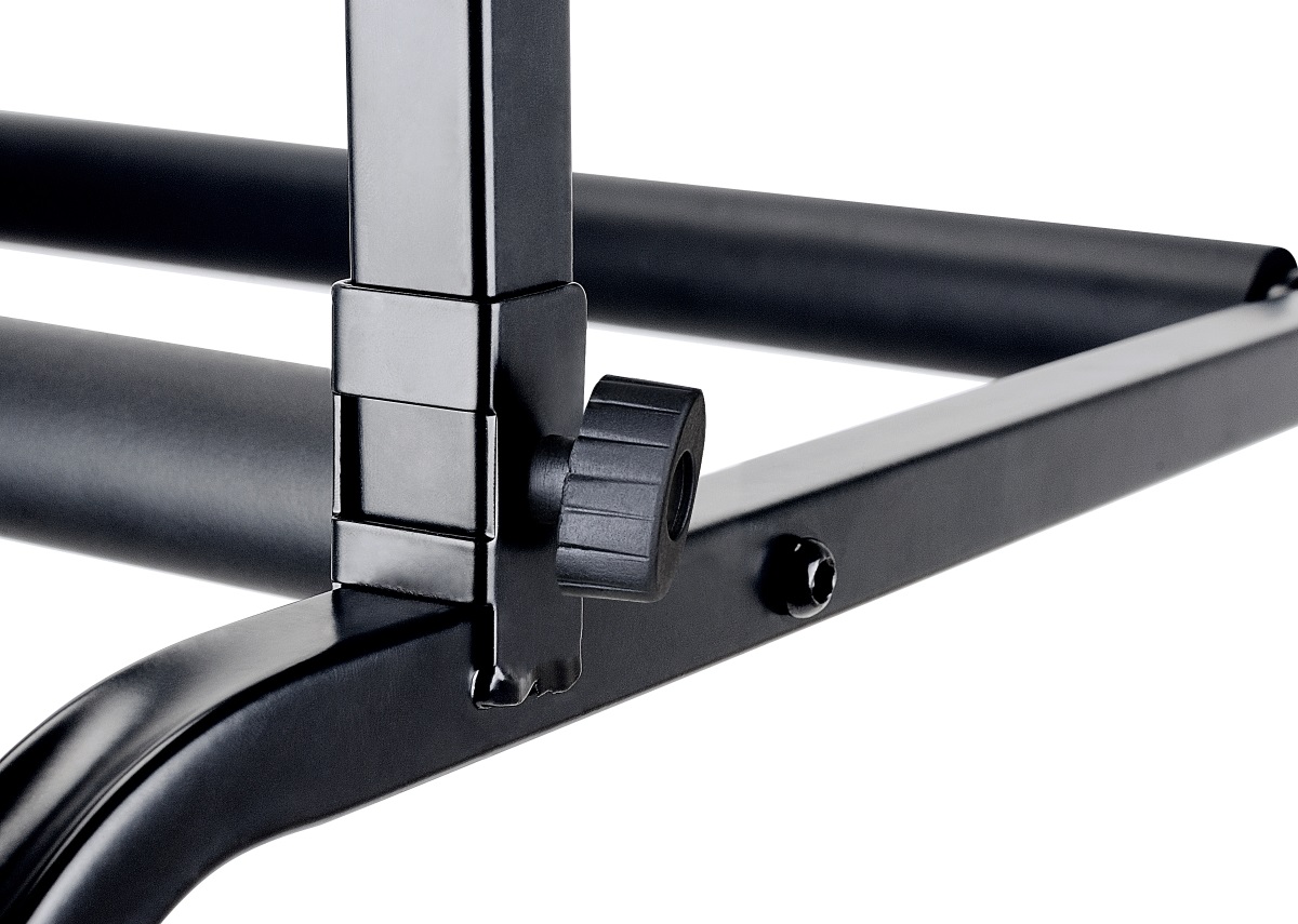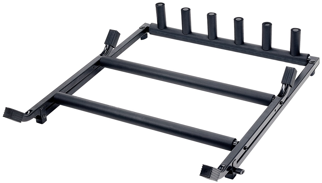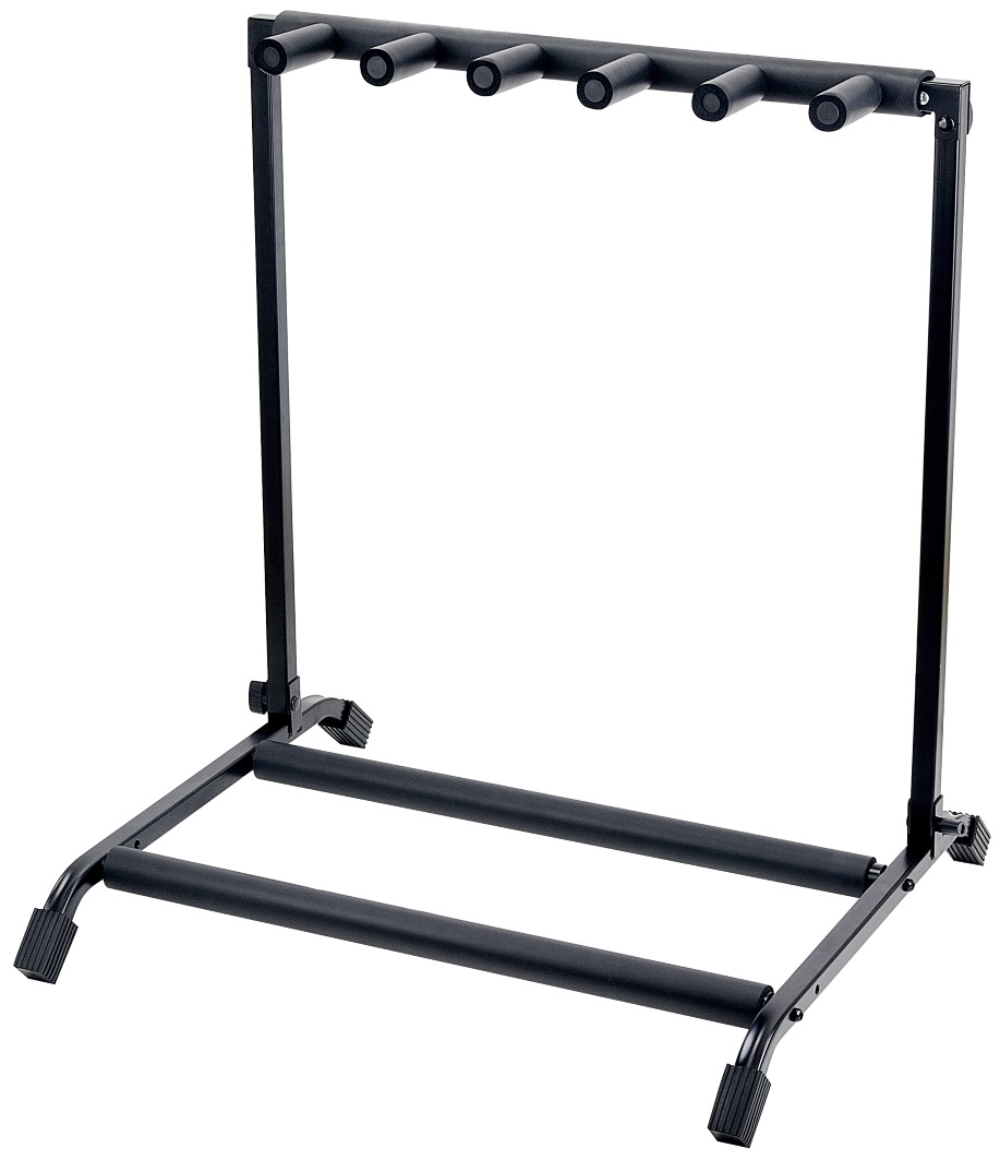 Stojan na viac nástrojov Tento stojan s pevnou kovovou konštrukciou od spoločnosti Soundsation bol navrhnutý tak, aby sa doň zmestilo päť elektrických gitár alebo basgitár, prípadne približne tri akustické gitary. Časti, ktoré prichádzajú do kontaktu s nástrojmi, sú pogumované, aby sa zabránilo poškodeniu laku alebo poškriabaniu dreva. Stabilitu stojana zaručuje základňa na štyroch nohách. V zloženom stave zaberá minimum miesta, takže je ideálnou voľbou na domáce použitie a cestovanie na ko