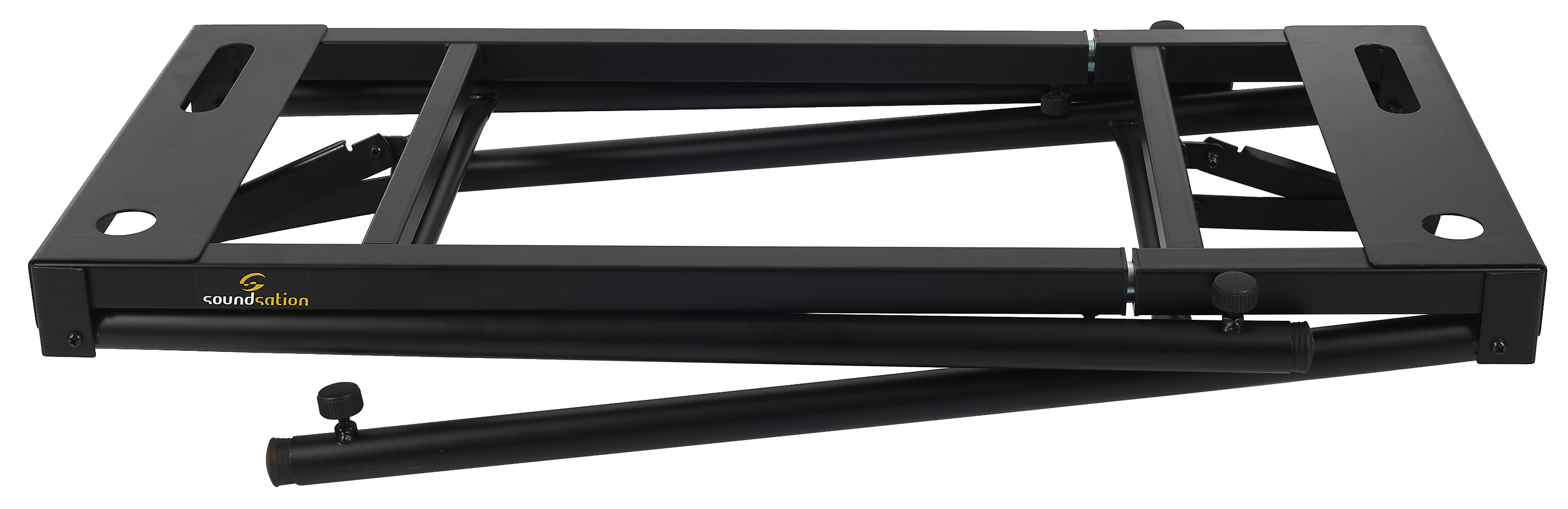 Klávesový stojan Robustný klávesový stojan vhodný pre ťažké pódiové klavíry. Stojan je vyrobený z odolnej ocele a má štyri teleskopické nohy na jednoduché nastavenie výšky. Stojan môžete prispôsobiť rozmerom svojho nástroja a skladacia konštrukcia zaručuje pohodlnú prepravu.
