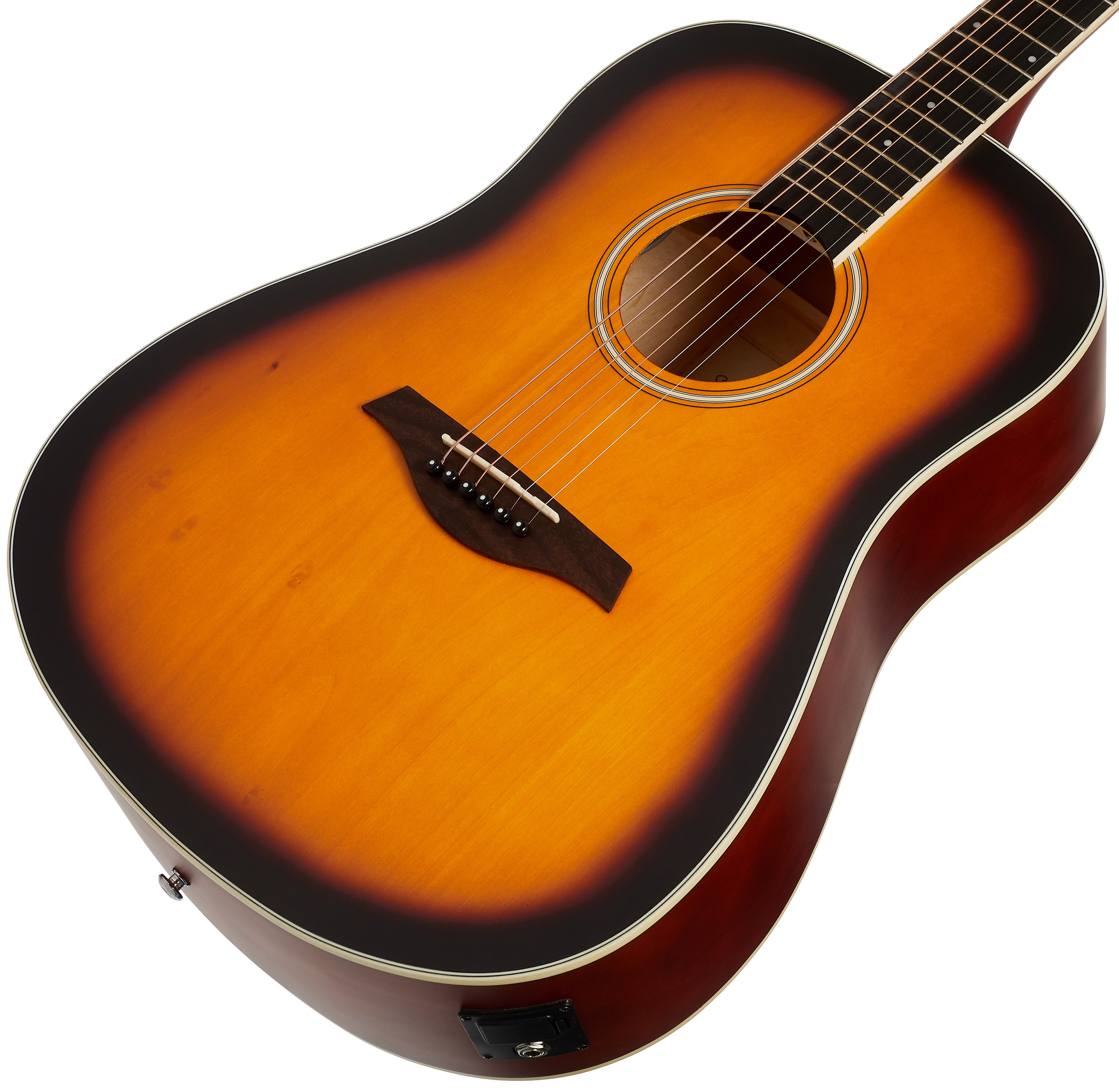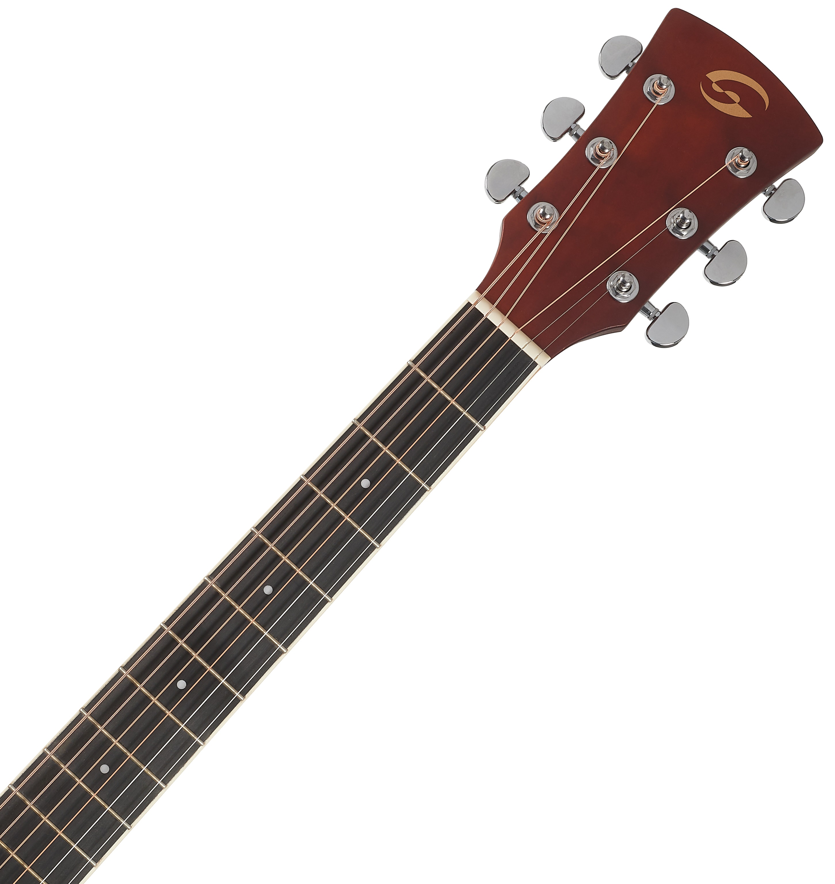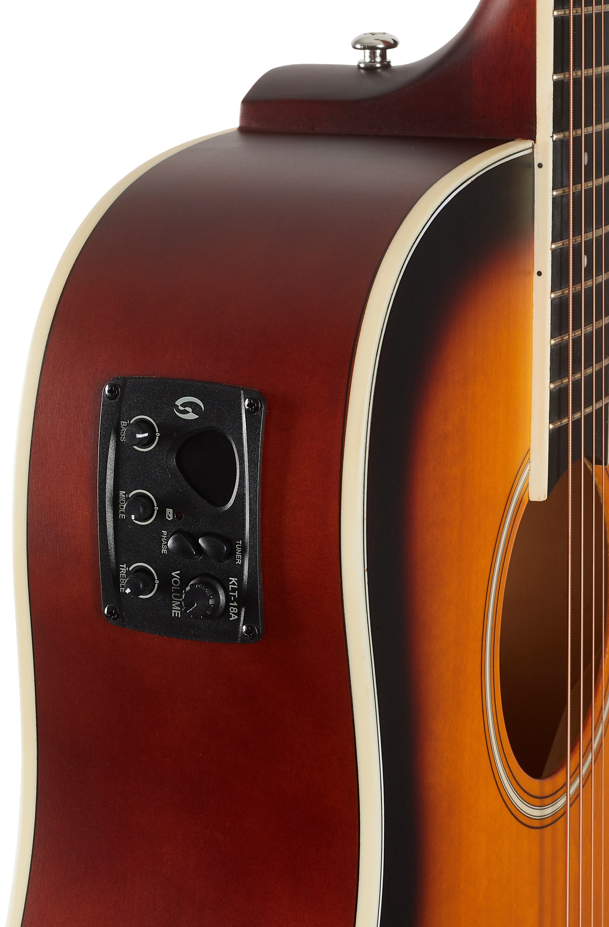 Akustická gitara Soundsation Meadow DN SBT je cenovo dostupná akustická gitara s veľkým rezonančným telom typu dreadnought vhodná pre začínajúcich hráčov. Telo vyrobené z laminovanej lipy tvorí základ zvuku nástroja. Krk je vyrobený z okoumé a hmatník z moderného kompozitného materiálu s 20 pražcami. Struny sú osadené v chrómových ladiacich mechanikách a palisandrovom hmatníku. Štýlové spracovanie podčiarkuje povrchová úprava s otvorenými pórmi a biela väzba tela.