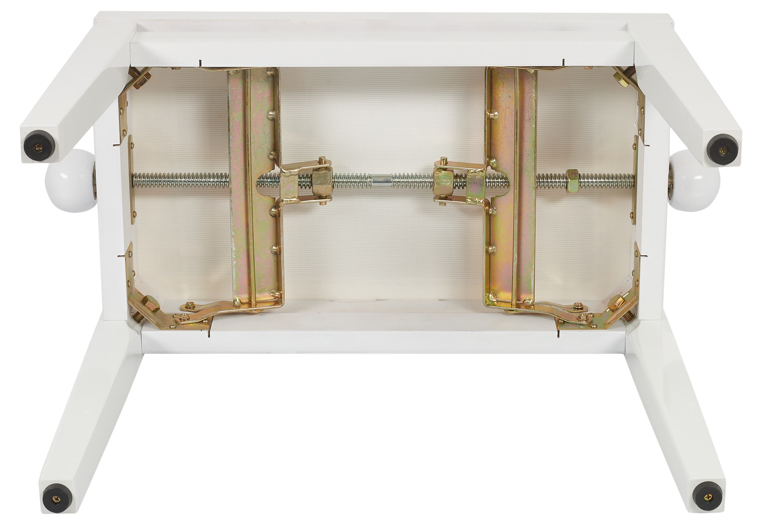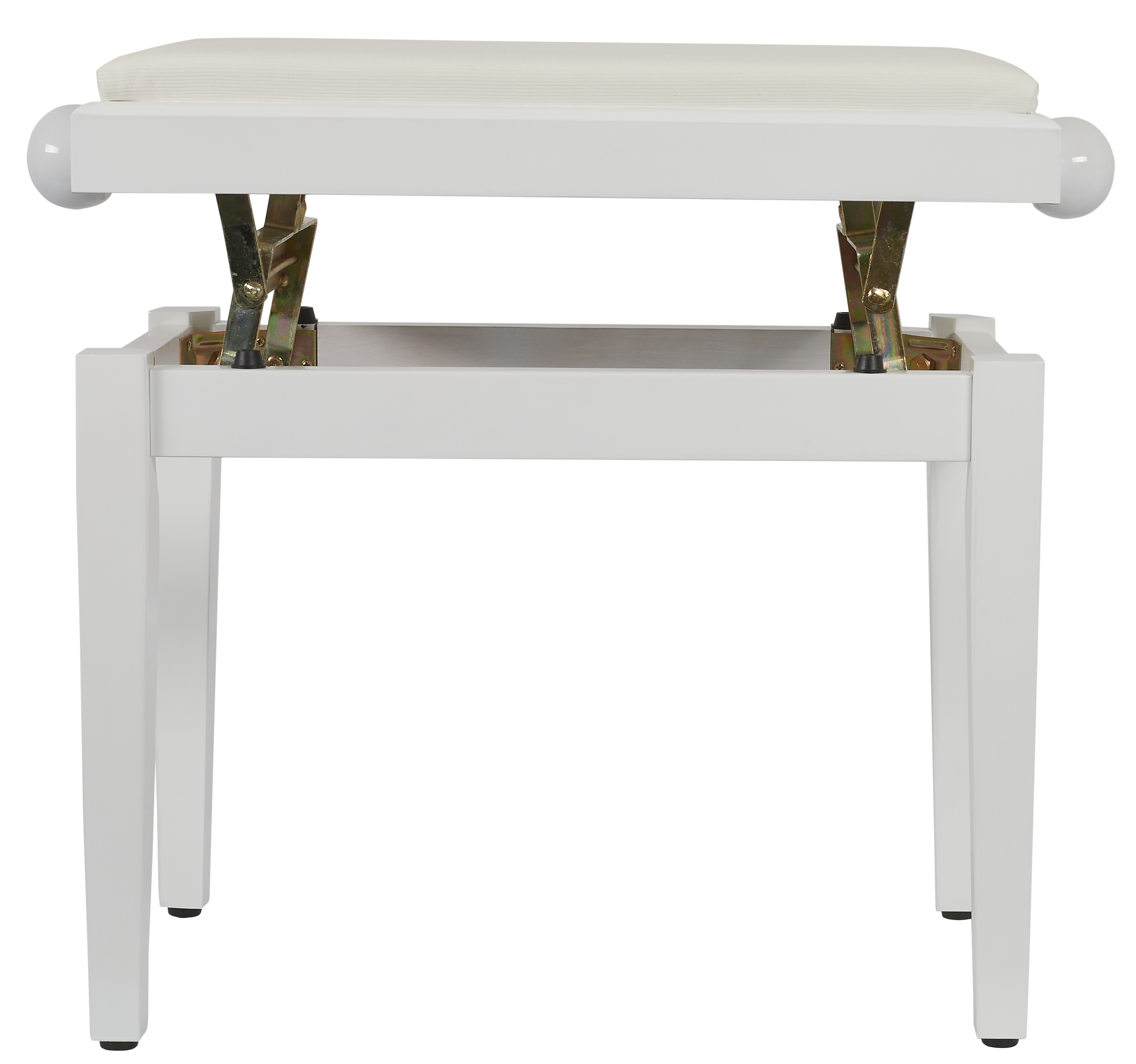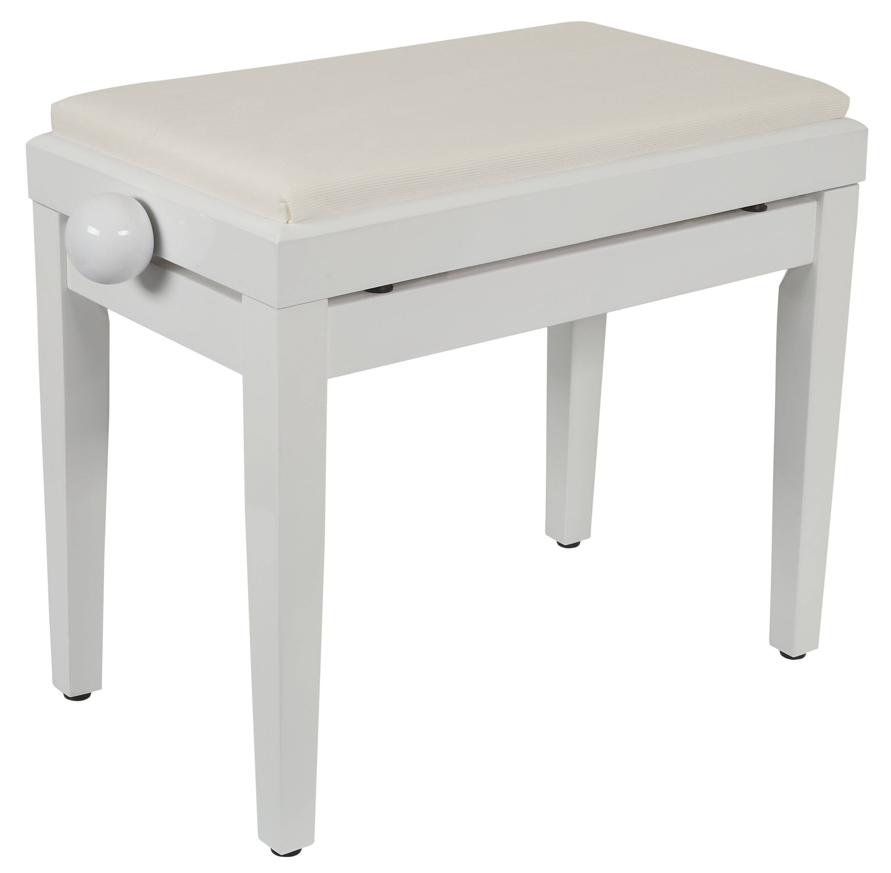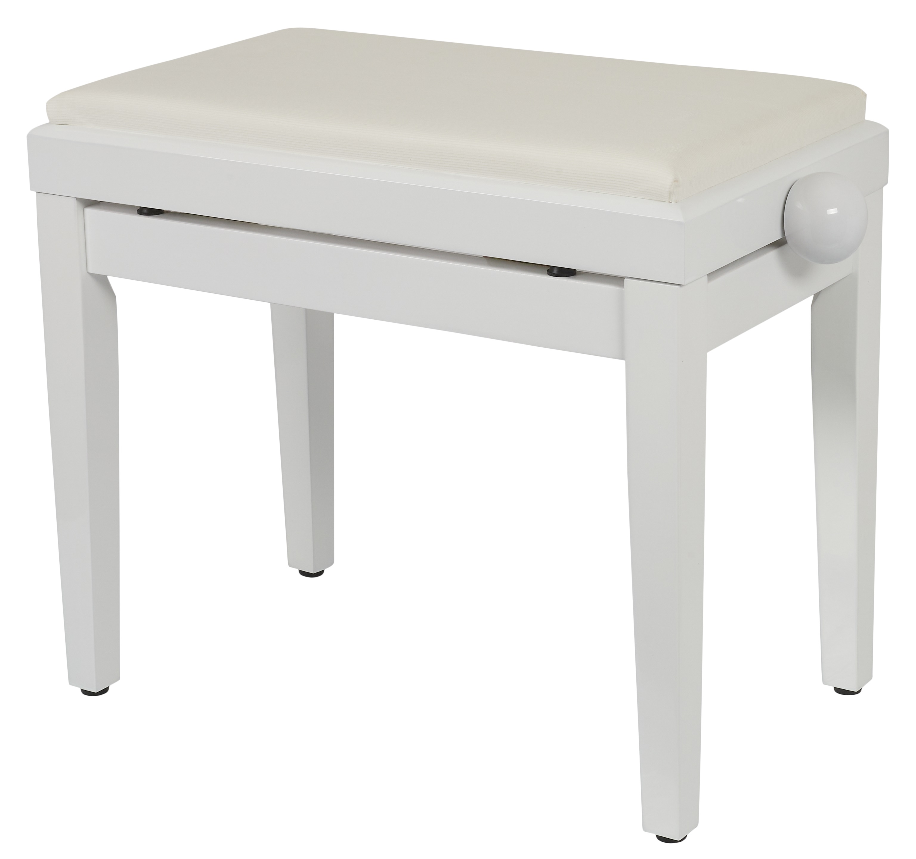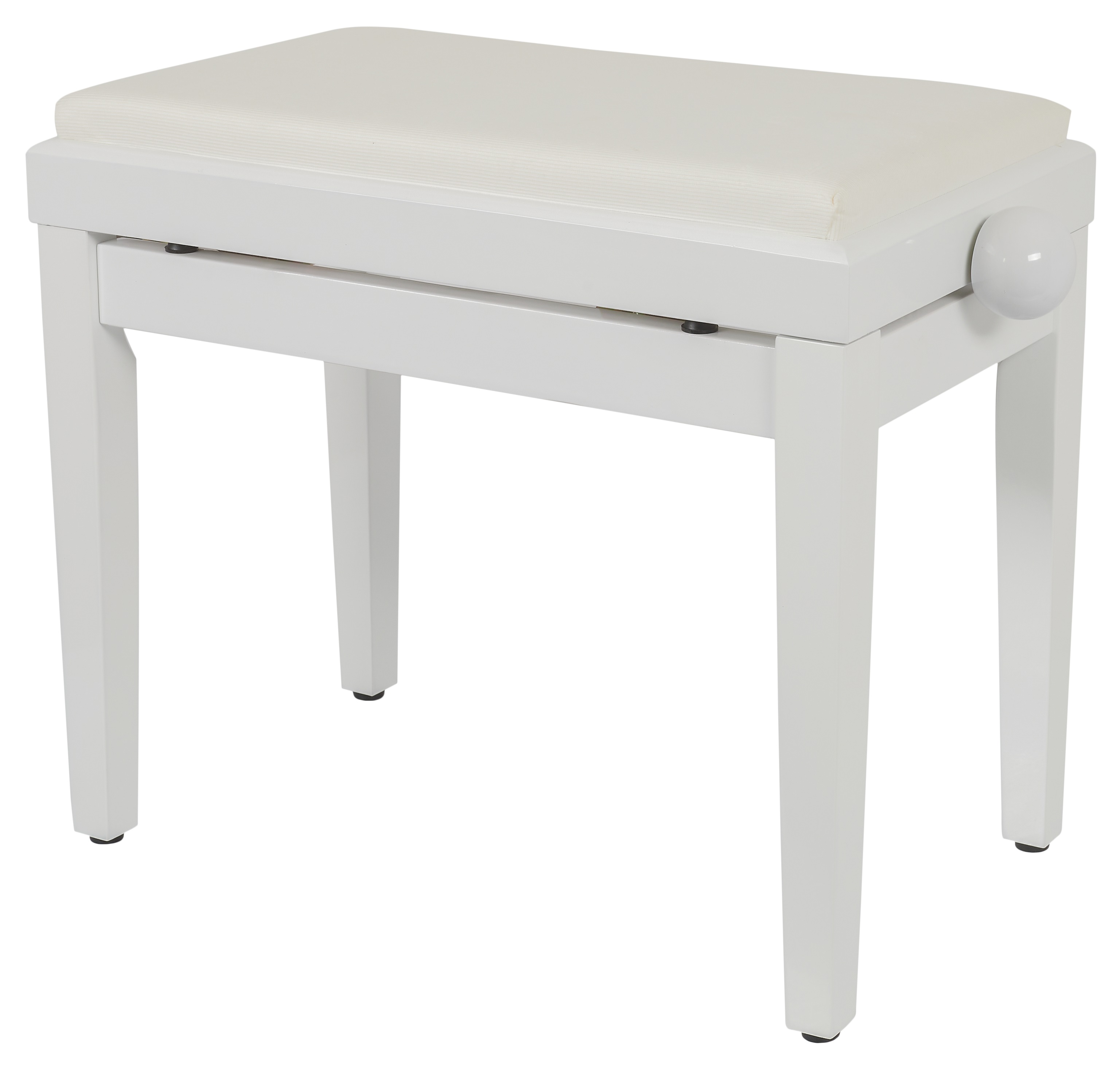 Klavírna stolička Klasická klavírna stolička s jednoduchým nastavením výšky a pohodlným sedadlom s bielym zamatovým poťahom. Sedadlá sú k dispozícii v lesklej a matnej povrchovej úprave a sú k dispozícii vo viacerých farbách, ktoré zodpovedajú najbežnejším farbám klavírov a pianín.
