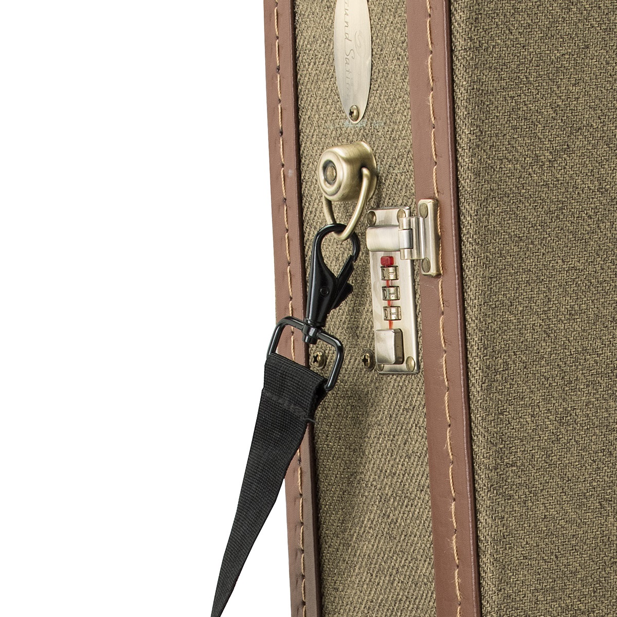 Kufor na akustickú gitaru Tento obal na akustickú gitaru kombinuje praktické vlastnosti s atraktívnym vintage dizajnom v podobe obalu v štýle polovice storočia alebo bronzového zámku. Jeho robustná konštrukcia z troch vrstiev preglejky spolu s vnútorným polstrovaním poskytuje vášmu nástroju potrebnú ochranu pred poškodením a pohodlie. Vnútorné vrecko ponúka dostatok priestoru na príslušenstvo. Štyri zámky a trojmiestny bezpečnostný kód zaručujú, že sa kufor pri manipulácii samovoľne neotvorí, čím udrží vaše