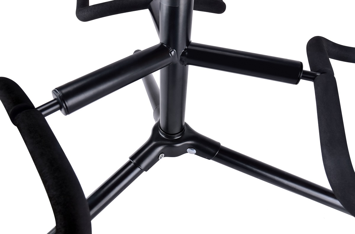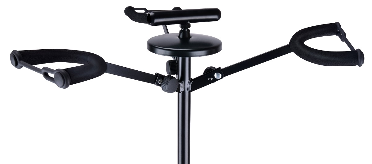 Stojan na viac nástrojov Tento stojan je vhodný pre tri gitary/basgitary (akustické a elektrické). Jeho výhodou je nastaviteľná výška od 70 do 82 cm. Stabilitu a odolnosť zaručuje oceľová konštrukcia a základňa trojnožky. Všetky časti, ktoré sú v kontakte s nástrojmi, sú potiahnuté mäkkým pogumovaným materiálom, takže sa nemôže poškodiť lak nástroja. Je dobrou voľbou do štúdia aj na živé vystúpenia.