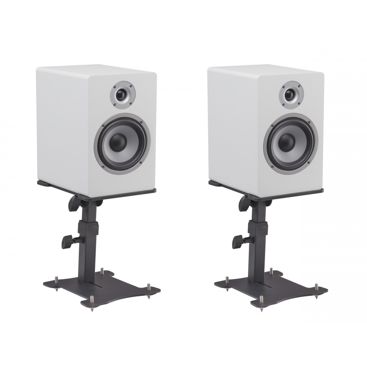 Stojan na štúdiové monitory Univerzálny stolový stojan vhodný pre štúdiové monitory a reproduktory. Stojan má pogumovanú základňu, nastaviteľnú výšku a sklon na detailné nastavenie monitora počas nahrávania, mixovania, kritického počúvania alebo finálneho masteringu. Súčasťou balenia sú štyri gumové nožičky a kovové ihly na nastavenie úrovne.