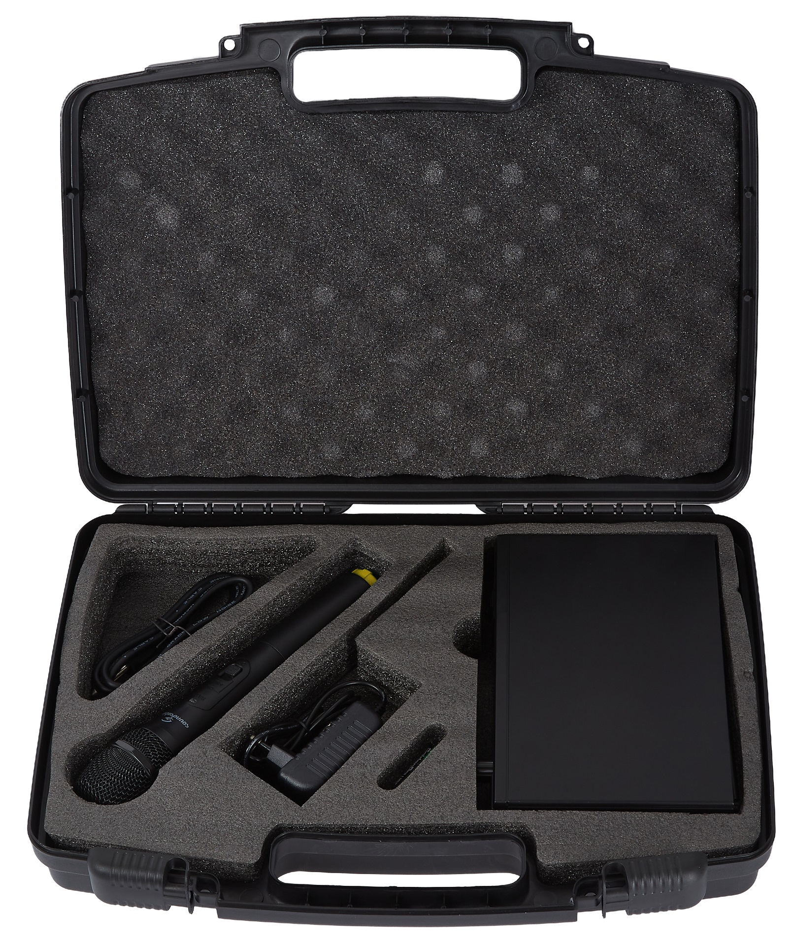 Vokálna bezdrôtová súprava Bezdrôtový ručný mikrofónový systém pre každého, kto vyžaduje spoľahlivý, vysokokvalitný zvuk s používateľsky prívetivým ovládaním plug and play. Systém má dosah až 30 metrov a je užitočný najmä na prezentácie a iné aplikácie s nízkou potrebou údržby. Dynamický mikrofón má kardioidnú charakteristiku. Vysielač môže fungovať až 5 hodín. Celá súprava sa dodáva v kufríku.