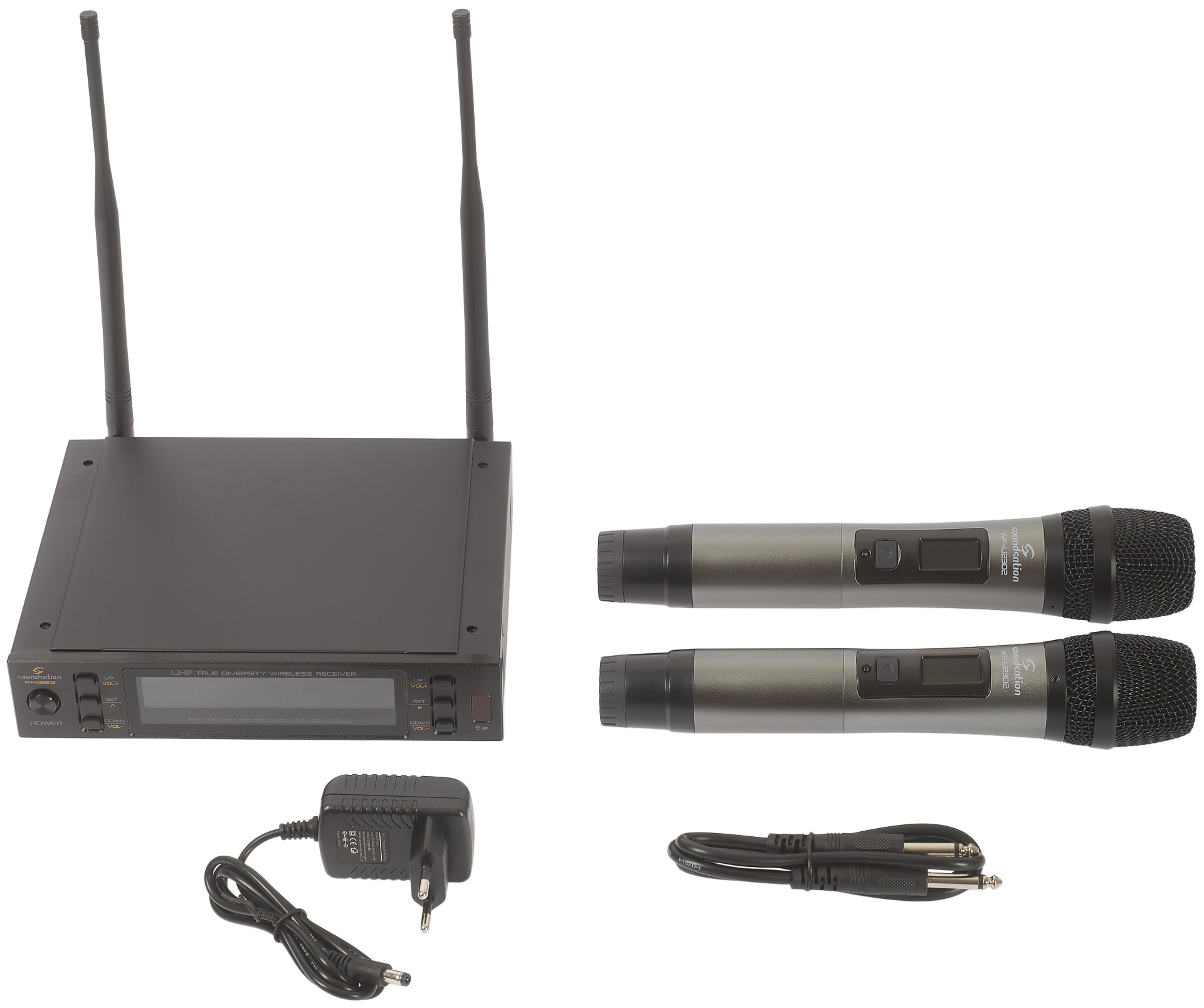 Duálna bezdrôtová súprava Soundsation WF-U2302HH je duálny profesionálny bezdrôtový set, ktorý pozostáva z dvoch ručných dynamických mikrofónov ako vysielačov a prijímača True Diversity UHF s 300 kanálmi pre každý mikrofón a jednoduchým, intuitívnym používateľským rozhraním. Bezdrôtový prijímač je vybavený systémom True Diversity s dvojicou antén a dvoma prijímacími obvodmi, ktoré dokážu nepretržite vyberať silnejší, neprerušovaný signál. Vďaka najmodernejš