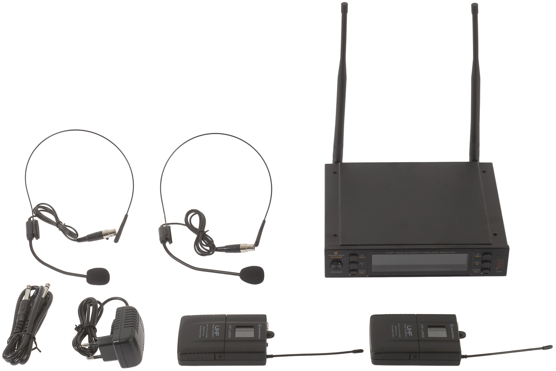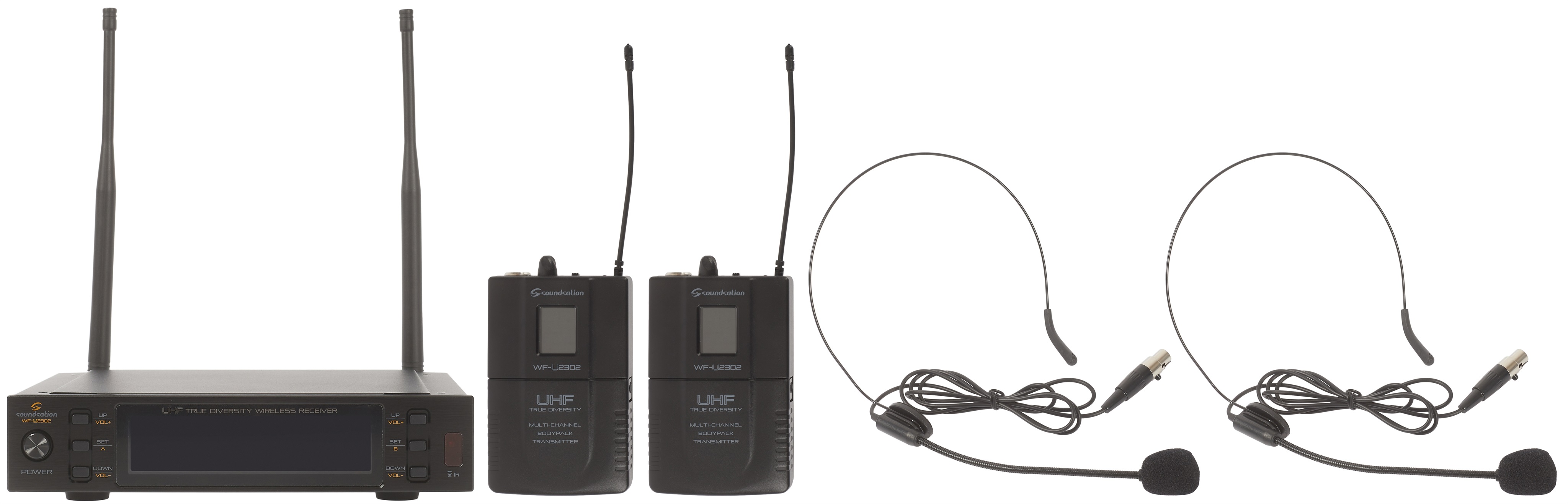 Duálna bezdrôtová súprava Soundsation WF-U2302PP je duálny profesionálny bezdrôtový set, ktorý pozostáva z dvoch bodypack vysielačov s náhlavnými dynamickými mikrofónmi a prijímača True Diversity UHF s 300 kanálmi pre každý vysielač a jednoduchým, intuitívnym používateľským rozhraním. Bezdrôtový prijímač je vybavený systémom True Diversity s dvojicou antén a dvoma prijímacími obvodmi, ktoré dokážu nepretržite vyberať silnejší, neprerušovaný signál. Vďaka na