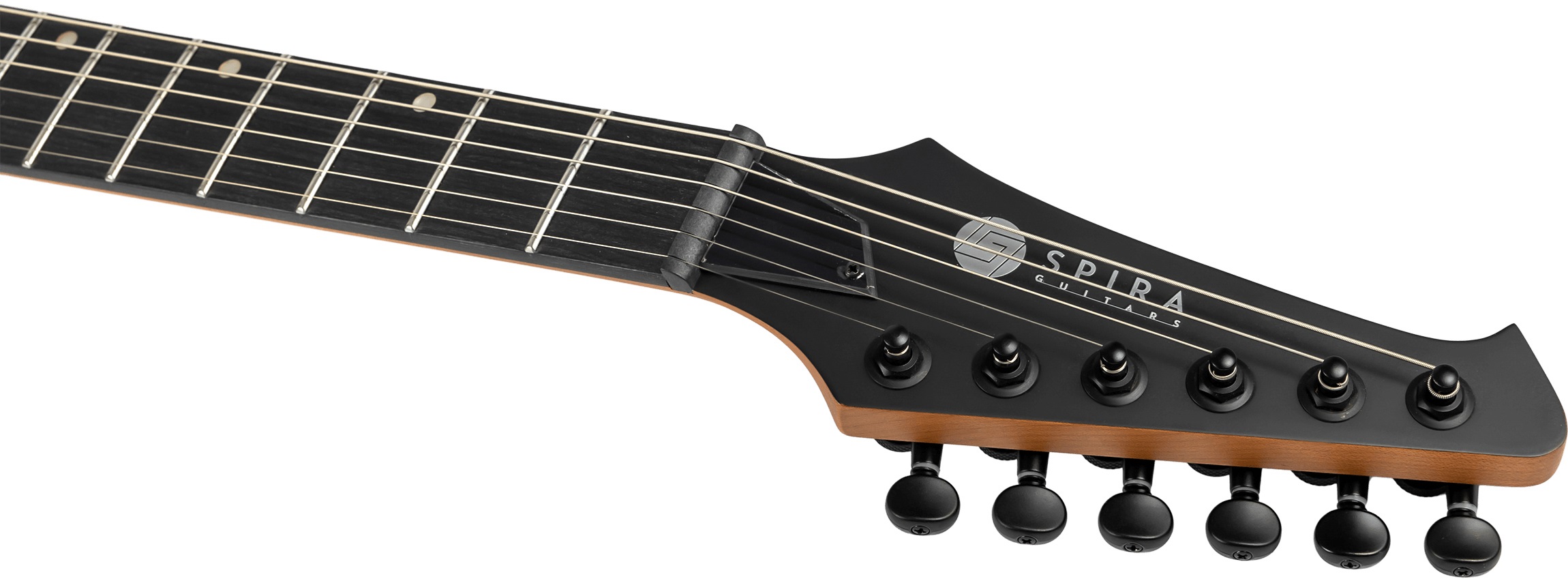 Elektrická gitara Elektrické gitary S-400 od Spira Guitars sú cenovo dostupné nástroje s moderným dizajnom Super ST pre začínajúcich aj skúsených rockerov, metalistov a všeobecne všetkých hráčov so záľubou v high-gain zvuku. Telo S-400 MBK je vyrobené z praženého topoľa. Kanadský javorový krk s profilom „Modern D“ je spojený s moderným kompozitným hmatníkom v ebenovom prevedení, osadeným dvadsiatimi štyrmi jumbo pražcami. Vďaka tepelnej úprave tela a krku je drevo stabilnejšie. Dva humbucker snímače Spira V