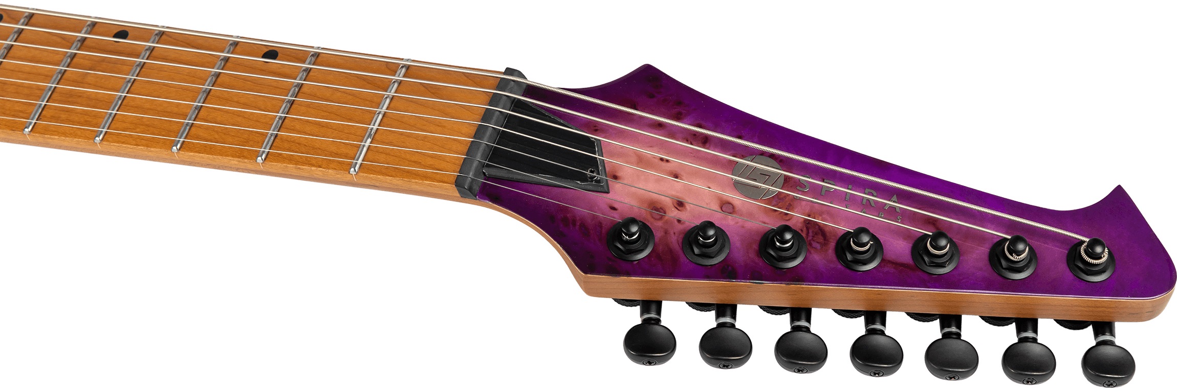 Elektrická sedemstrunová gitara Spira Guitars S-457 TPP je cenovo dostupná sedemstrunová elektrická gitara s moderným dizajnom Super ST pre hráčov súčasných hudobných štýlov, ktorí pracujú s nižším ladením – od moderného rocku a metalu až po metalcore, djent a ďalšie subžánre. Telo gitary je vybavené vrchnou dýhou z fládrovaného javora a povrchovou úpravou Transparent Purple. Ku krku z kanadského javora s profilom „Modern D“ je prilepený javorový hmatník osadený dvadsiatimi štyrmi pražcami veľkosti jumbo. V