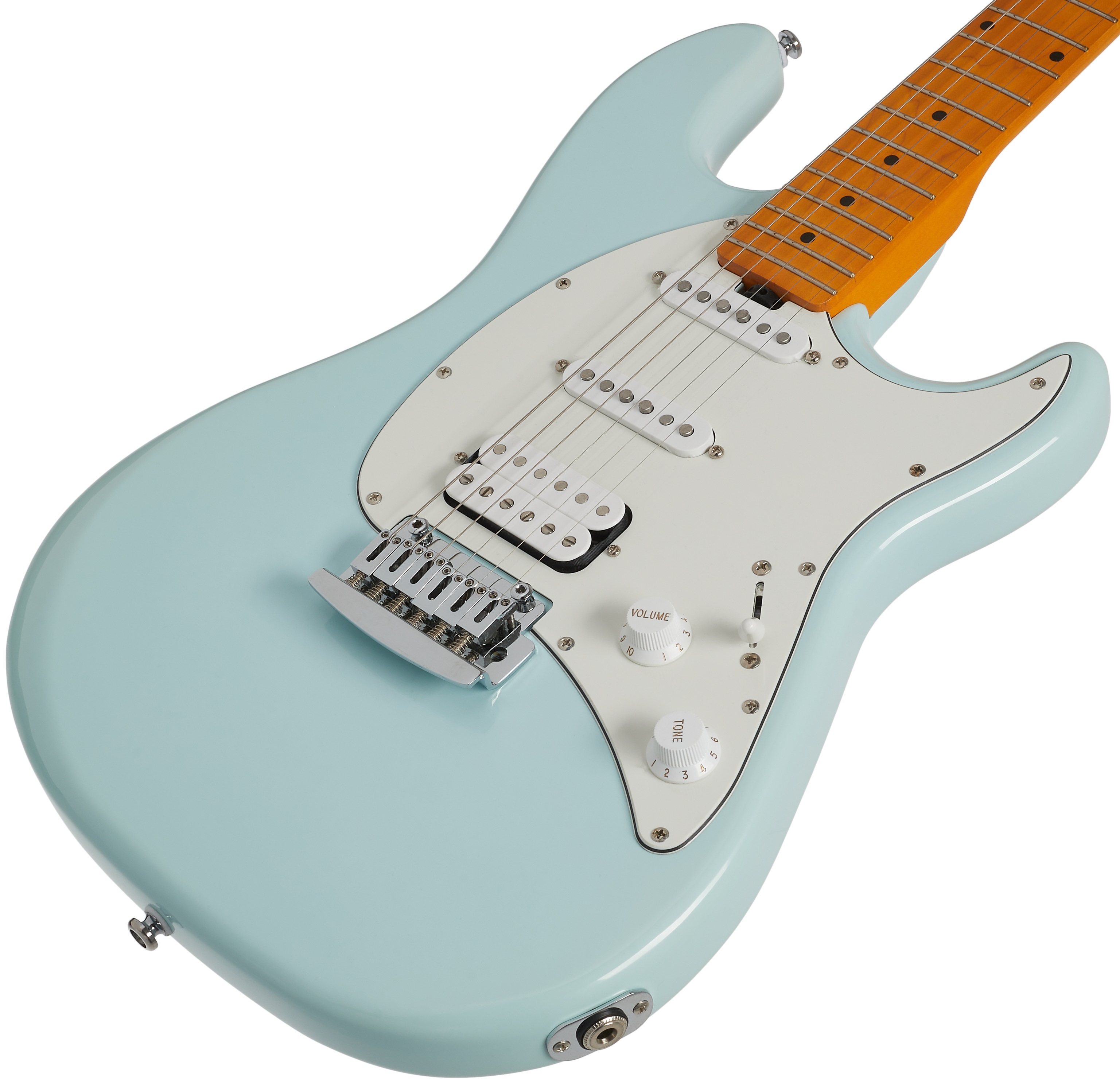 Elektrická gitara Elektrické gitary Sterling by Music Man ponúkajú známy dizajn Music Man za cenu prístupnejšiu širšiemu okruhu kupujúcich. A presne to je prípad modelu SUB Cutlass CT30HSS Daphne Blue v nadčasovom dizajne ST/Double-cut. Telo gitary je vyrobené z topoľa. Skrutkovaný krk a hmatník nástroja sú vyrobené z javora. Orientáciu uľahčujú polohové bodky na hmatníku. Moderné firemné snímače, t. j. kobylkový humbucker a dva single-coily, s magnetmi Alnico dodávajú gita