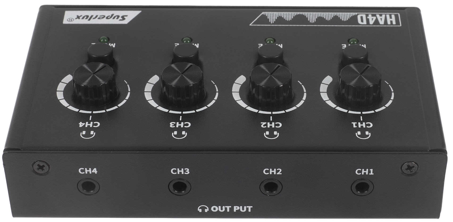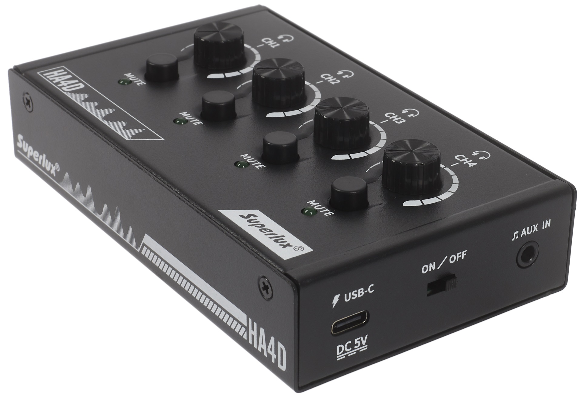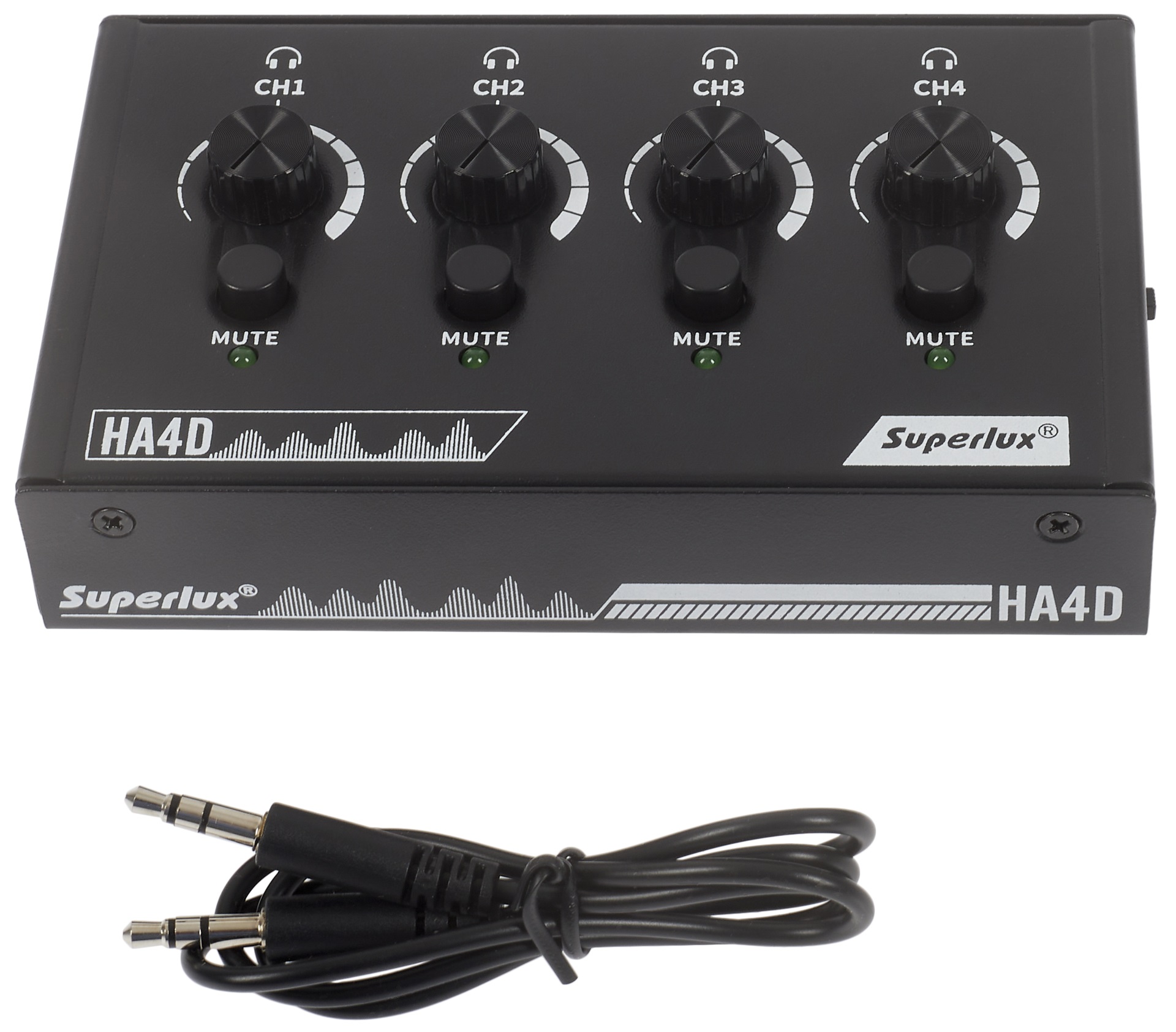 Slúchadlový zosilňovač Superlux HA4D je prenosný štvorkanálový slúchadlový zosilňovač, ktorý je určený na kritické počúvanie a monitorovanie. Svojou kvalitou zvuku a cenovou dostupnosťou je určený najmä pre menšie štúdiá alebo kapely. Zosilňovač umožňuje rozdelenie distribúcie signálu do štyroch slúchadlových výstupov s 3,5 mm jackom s nezávislým ovládaním hlasitosti a funkciou MUTE. Externý zvukový signál možno privádzať do vstupu AUX IN (3,5 mm jack). Nízka impedancia 47 Ohm zaručuje dost