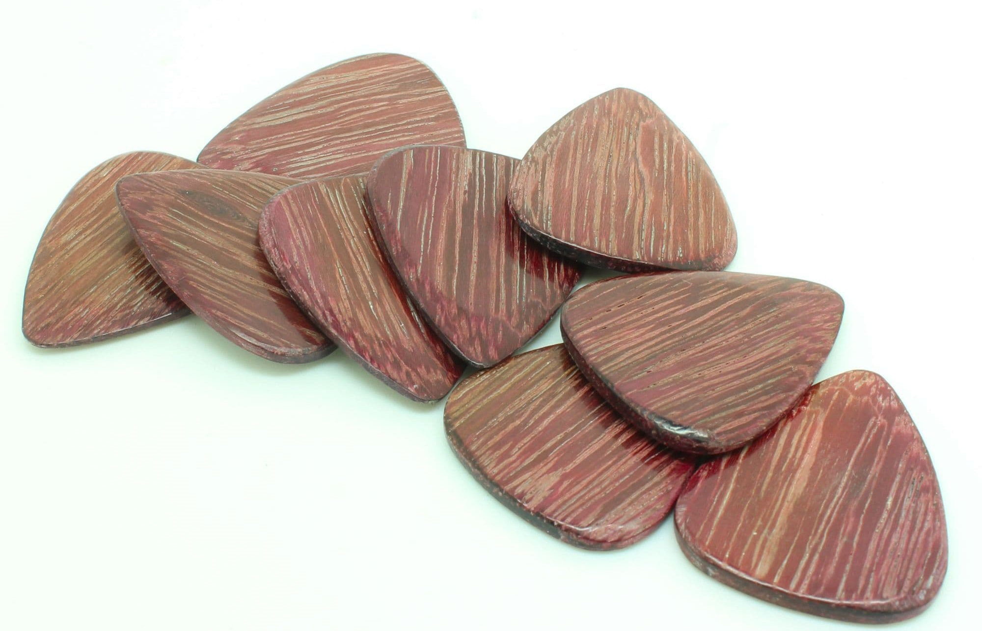 Brnkadlo Či už hľadáte darček pre nadšeného gitaristu, alebo len hľadáte dokonalý zvuk a chcete vyskúšať trsátka z netradičných materiálov, v Timber Tones nájdete to, čo potrebujete. Tento model je vyrobený zo stredne tvrdého dreva Purple Heart, ktoré balansuje na hranici medzi hrejivosťou a čistotou – elektrickej gitare dodáva guľatejší tón a akustickej gitare ho rozjasňuje. Má hrúbku 2,4 mm, ktorá sa smerom k špičke zužuje na 0,7 mm. Hmatník je ručne brúsený a lakovaný. B