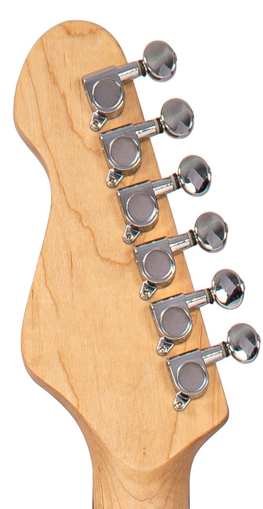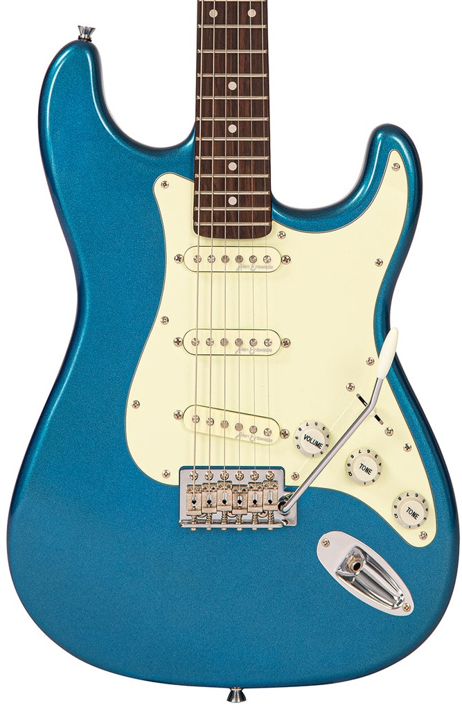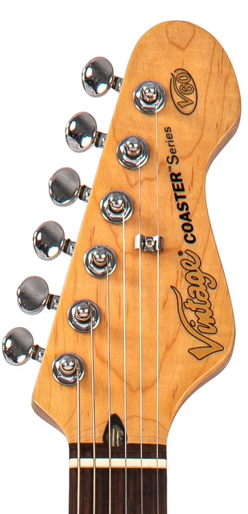 Elektrická gitara set Gitarové balenie Vintage V60 Coaster Series obsahuje elektrickú gitaru, 10W gitarové kombo Kinsman, puzdro, gitarový popruh, nástrojový kábel, klipovú ladičku, trsátko a náhradnú sadu strún. Vintage V60 Coaster Series Candy Apple Blue je elektrická gitara v tvare dvojitého výrezu modelov ST. Telo nástroja je vyrobené z dreva ázijského stromu pavlovnia. K priskrutkovanému javorovému krku je prilepený palisandrový hmatník osadený dvadsiatimi dvoma pražcami. Tri snímače typu single-coil s