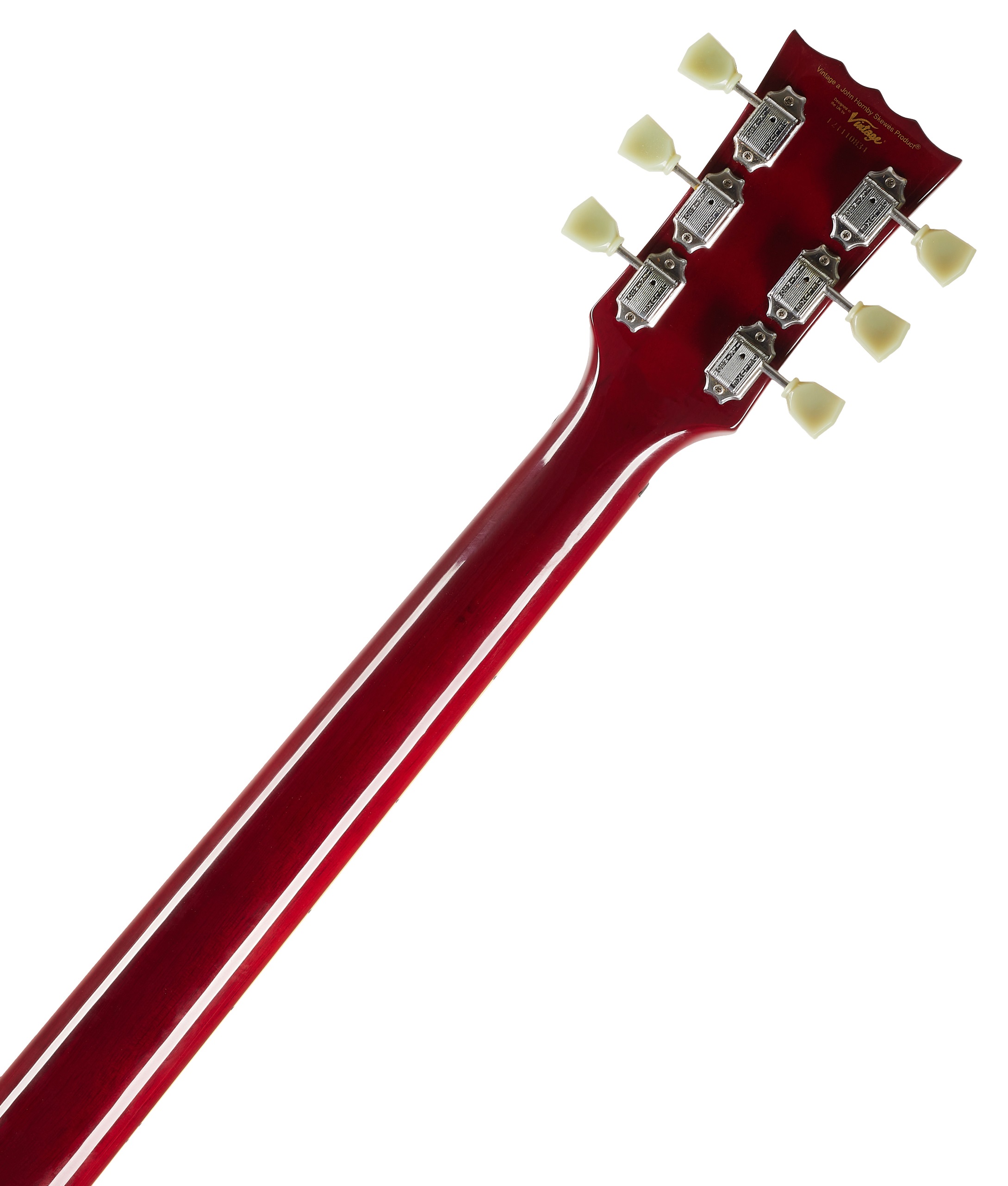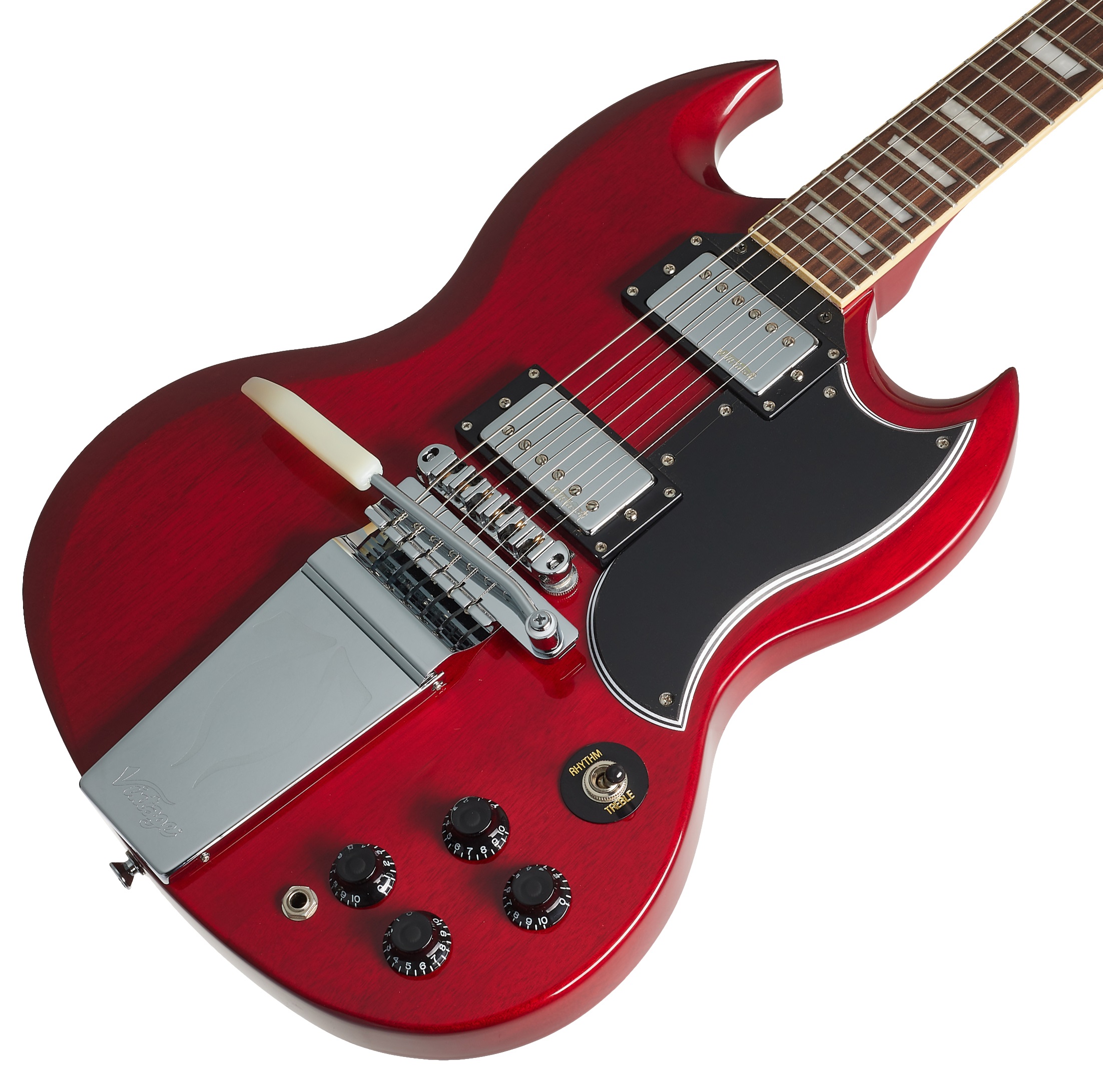 Elektrická gitara Vintage VS6VCR je štýlová elektrická gitara v dizajne double-cut SG zo série Vintage Reissued Series. Telo nástroja je vyrobené z mahagónu. K krku z jedného kusu mahagónu s príjemným profilom „Soft C“ je prilepený palisandrový hmatník osadený dvadsiatimi dvoma pražcami veľkosti Medium Jumbo. Dva humbuckery značky Wilkinson poskytujú gitare poriadne šťavnatý zvuk, ktorý vie byť agresívne rockový aj srdečne bluesový. Jeho kontúry možno upravovať pomocou ovládačov hlasitosti,