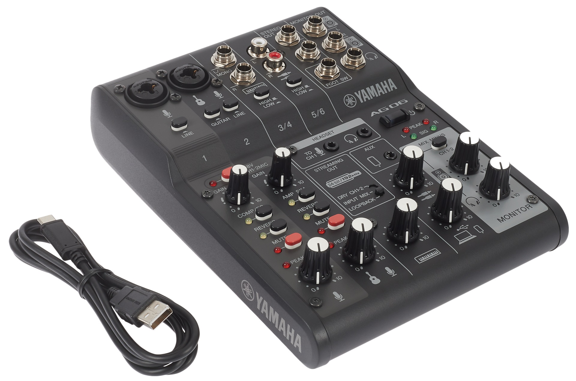 Analógový mixážny pult Multifunkčný šesťkanálový mixér druhej generácie s integrovaným zvukovým rozhraním vhodný na živé vysielanie, webovú komunikáciu, podcasting alebo hudobnú produkciu. Model AG06 mk2 je vybavený kompresorom, ekvalizérom a reverbom s nastaviteľnými parametrami na prispôsobenie zvuku. Ďalšie možnosti potom ponúka aplikácia AG Controller, ktorú si môžete bezplatne stiahnuť do svojho zariadenia a ktorá komunikuje s mixérom prostredníctvom kábla USB. AG06 mk