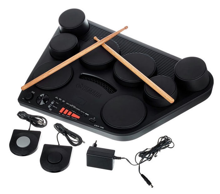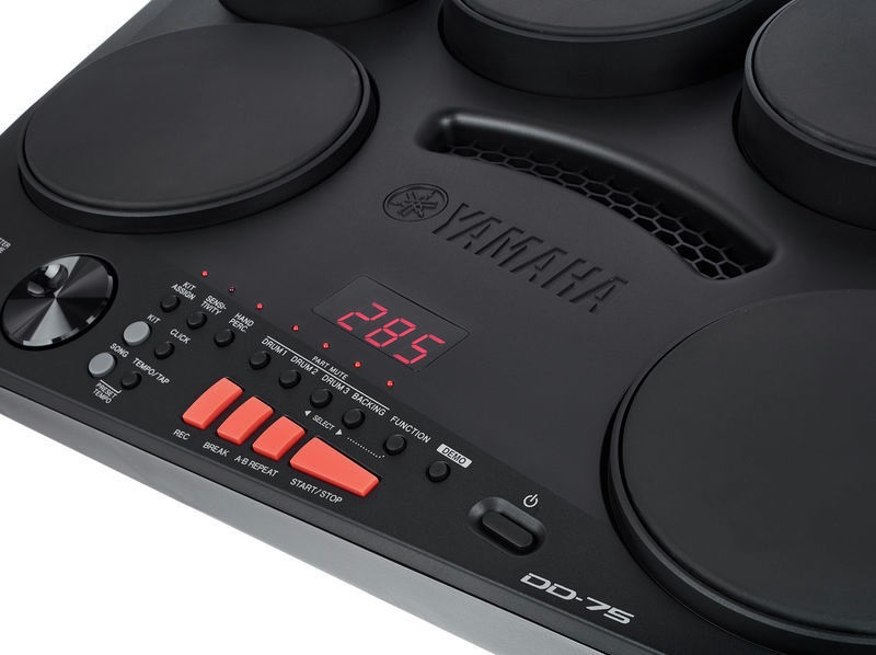 Perkusný pad DD-75 je kompaktná digitálna sada bicích padov vrátane pedálových ovládačov pre hi-hat a veľký bubon, ktorá ponúka široký výber realistických bicích súprav (75 súprav) a desať ďalších súprav na prispôsobenie. Osem padov má panelové usporiadanie ako tradičná bicia súprava a ich individuálne nastavenie citlivosti (päť úrovní) oceníte pri hre s dlaňou aj klasickými paličkami. Vysoká konektivita umožňuje pripojiť externé zvukové zariadenie na precvičovanie skladieb vašich obľúbených interpretov. Re