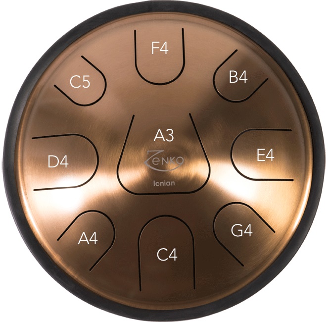 Tongue drum ZENKO ZEN01 IONIAN Zenko je séria jedinečných melodických bicích nástrojov, ktoré sa označujú ako hand pan, tongue drum alebo tank drum. Je výsledkom dlhého vývoja spoločnosti Metal Sounds v spolupráci s poprednými vedcami a odborníkmi na spracovanie kovov, vďaka čomu vám tento nástroj ponúkne veľmi špecifický zvuk. Tento nástroj je vyrobený z ocele, ktorá je špeciálne tvarovaná a do ktorej sú vyrezané presne navrhnuté jazýčky. Pri údere paličkou alebo rukou sa rozozvučí celé Zenko a vďaka svoje